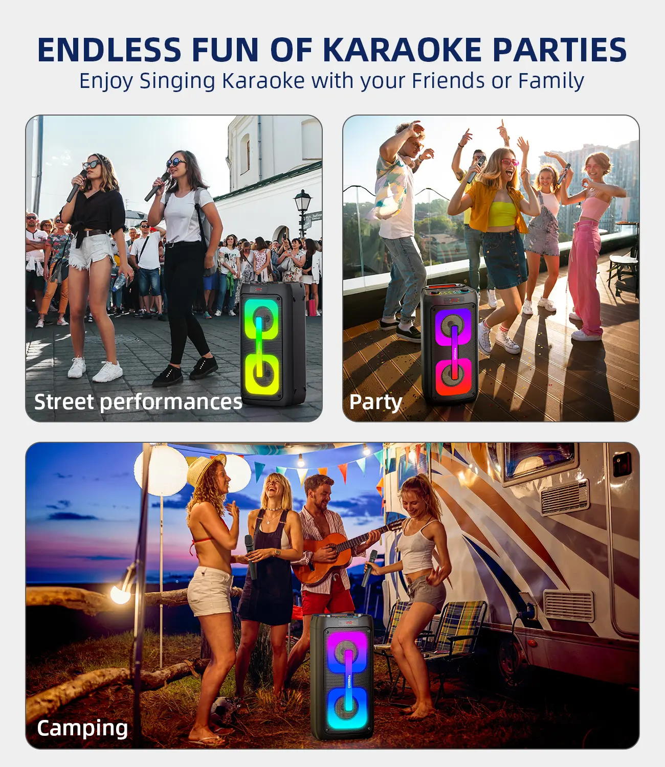 ·Long Battery Life and RGB Dynamic Lighting Effects: The powerful portable karaoke speaker features multiple lighting modes that sync with the music rhythm, creating an atmospheric light show for your performance. It has a built-in 4500mAh rechargeable high-performance battery, providing continuous usage for 6-8 hours.