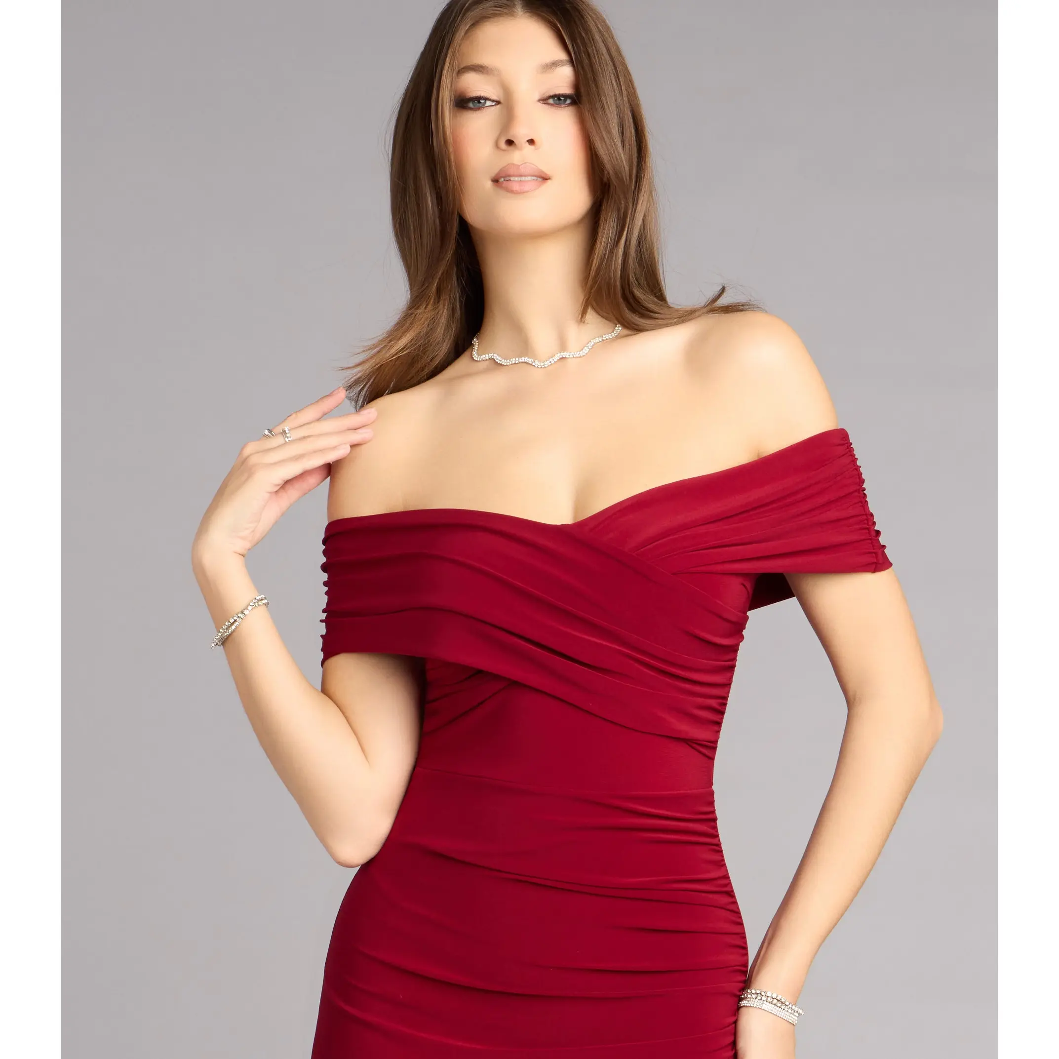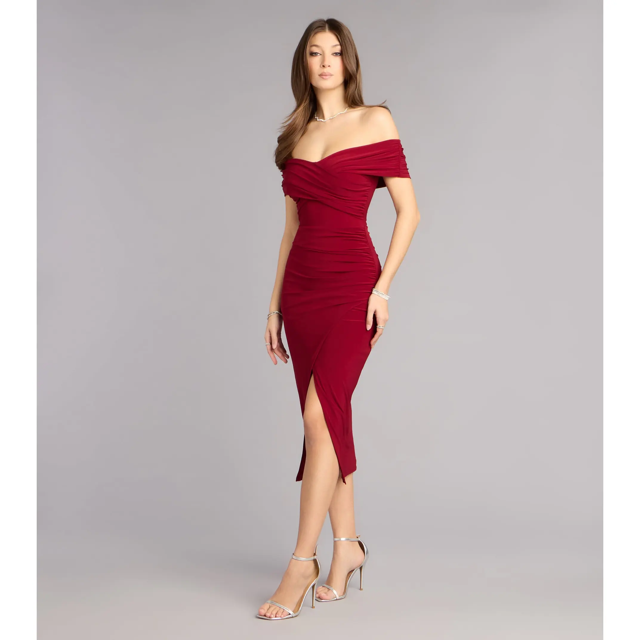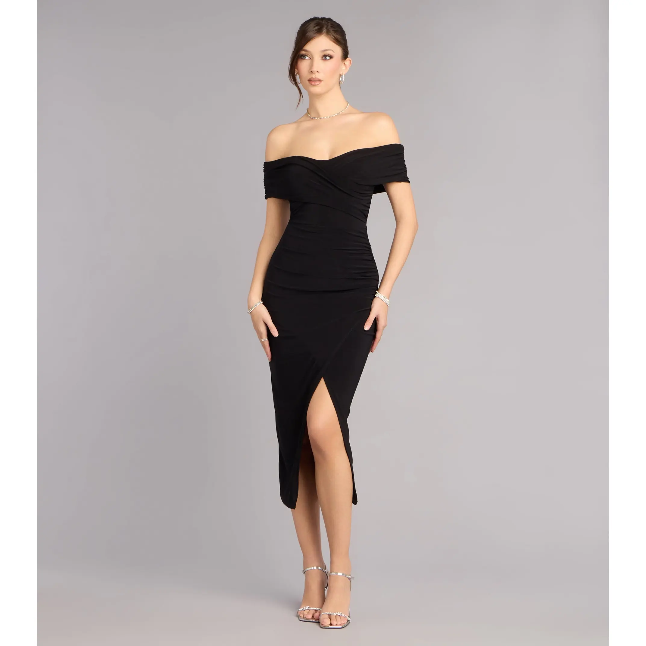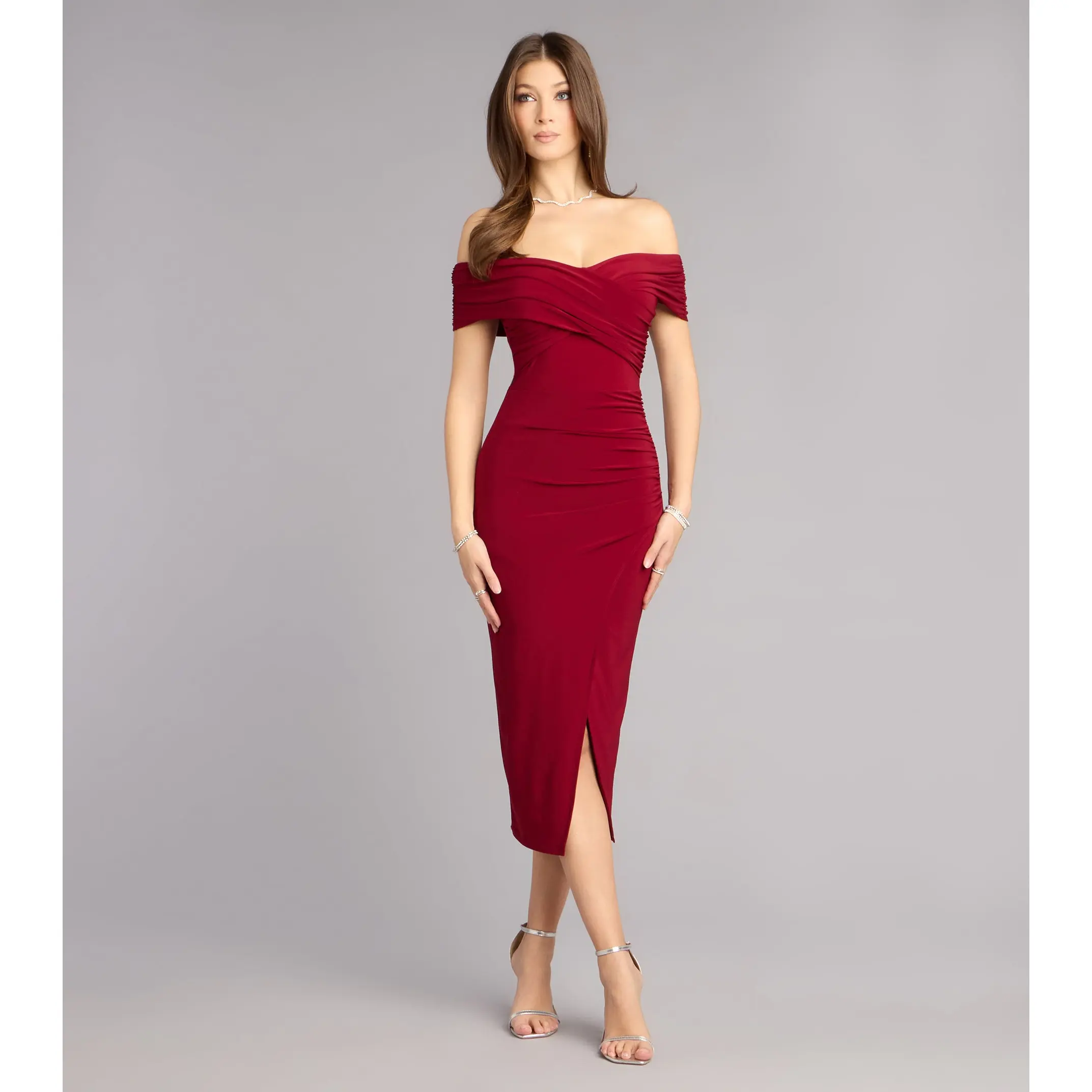 Made for candlelit entrances and champagne toasts, the Karol dress brings quiet drama in the chicest way. Crafted from smooth knit in a form-hugging midi silhouette, it features an off-the-shoulder wrap overlay neckline and a front wrap slit that moves beautifully from ceremony to after-party.