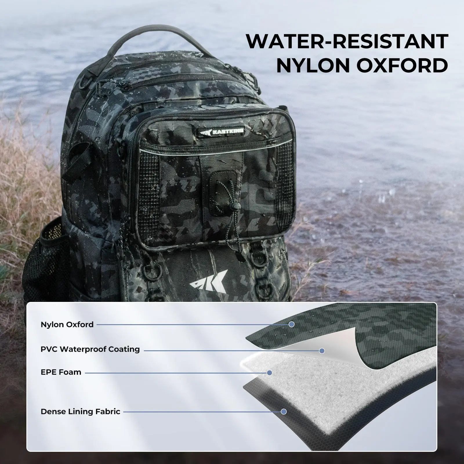 ·Durable and Water-Resistant: Built for rugged fishing conditions, this backpack is made from heavy-duty rip-stop nylon and water-resistant high-density oxford fabric. The hydrophobic coating offers added protection, keeping your gear dry and safe from splashes, rain, and other outdoor elements.