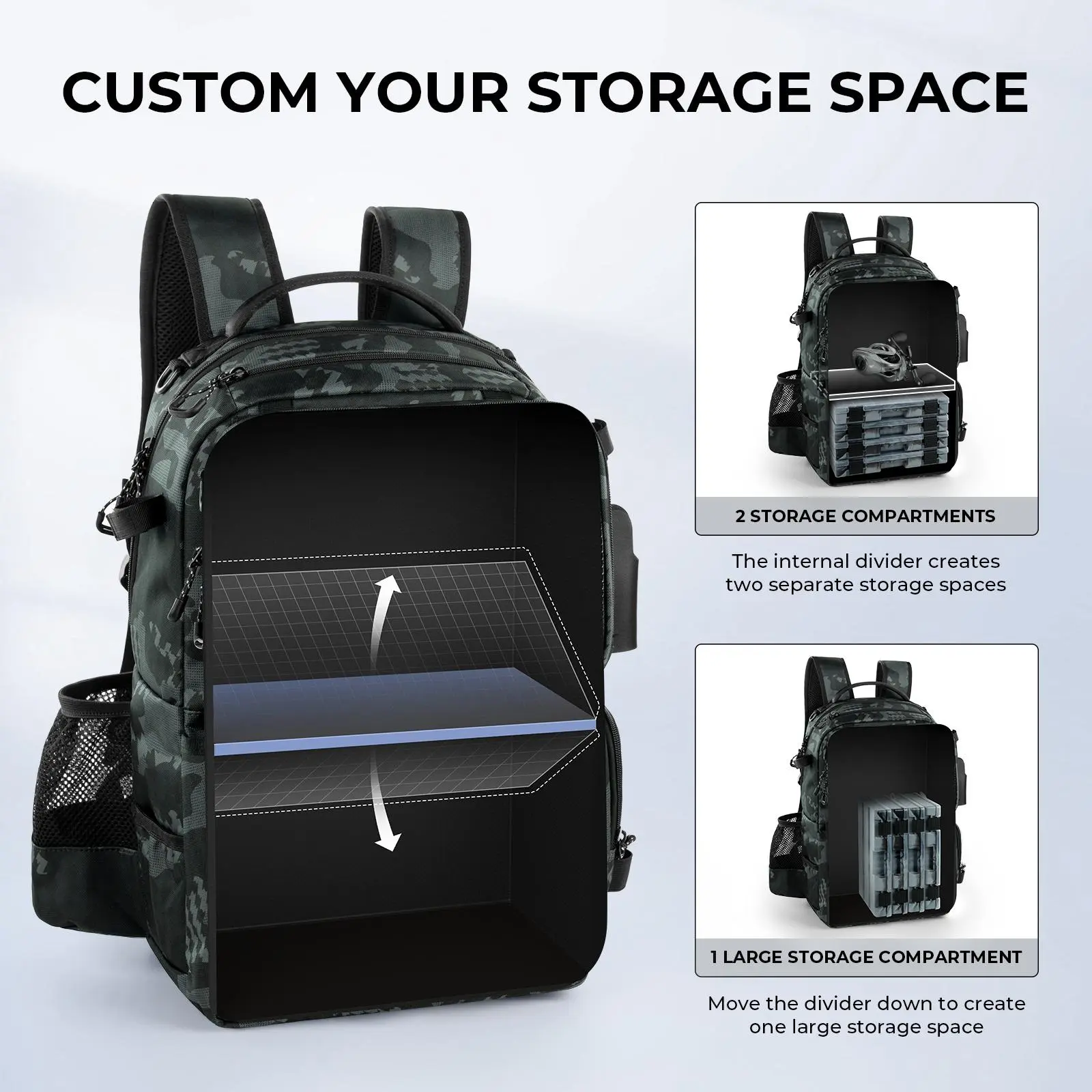 ·Customizable Compartments: Stay organized with a main compartment that easily converts from one large space to two separate compartments. The lower compartment is designed to hold up to four 3600-size tackle boxes (NOT INLCUDED) with a zippered panel for quick access, giving you ultimate flexibility to organize tackle and gear for different fishing trips.