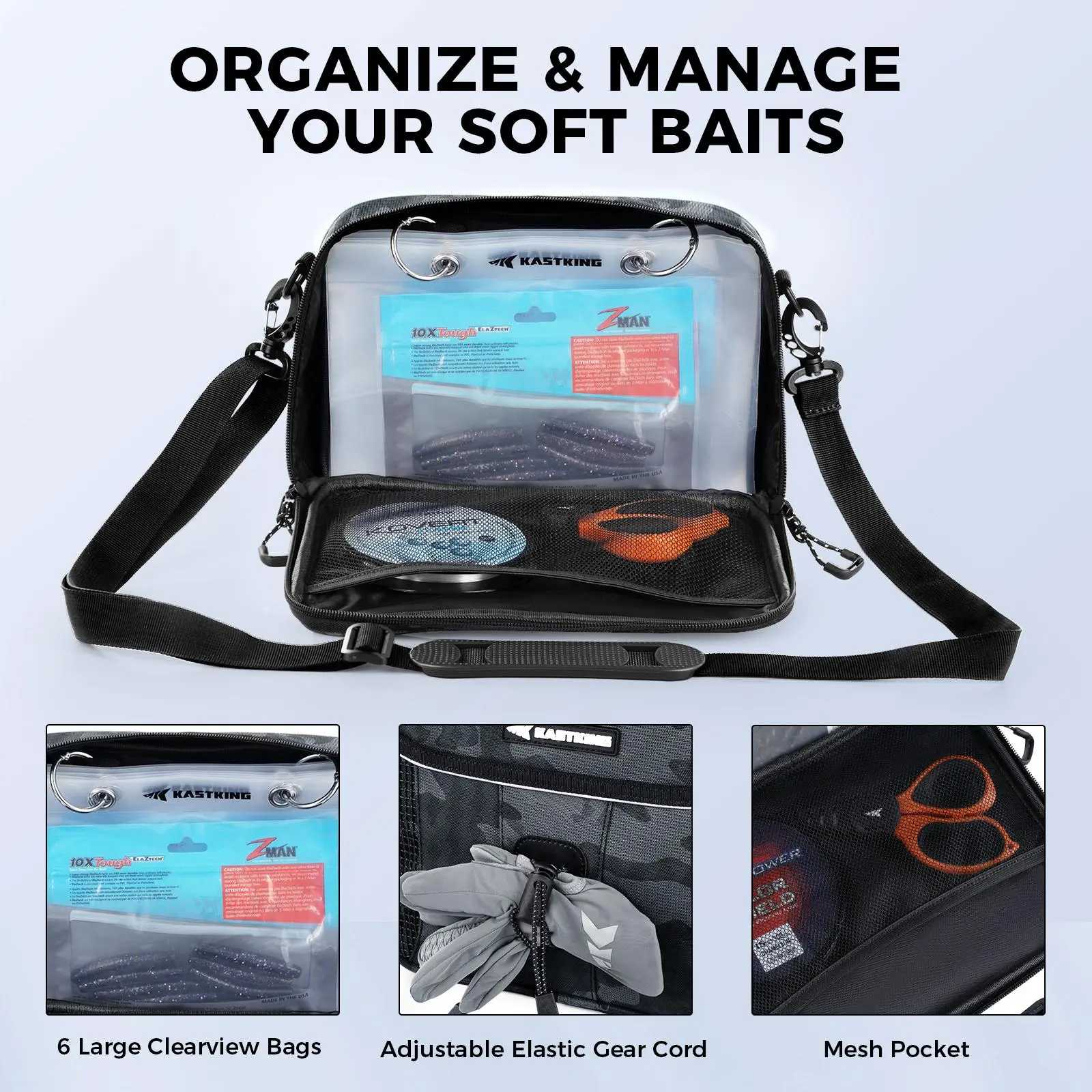 ·Interchangeable Storage System: The KastKing BaitSpace 50L Backpack comes with a removable soft bait binder bag that includes six clear-view sleeves (9.5” x 7.5”) for quick identification of your baits. This versatile system allows you to swap the binder bag for an optional lunch cooler or line spooling bag (both sold separately), making it adaptable to your fishing needs and lifestyle.