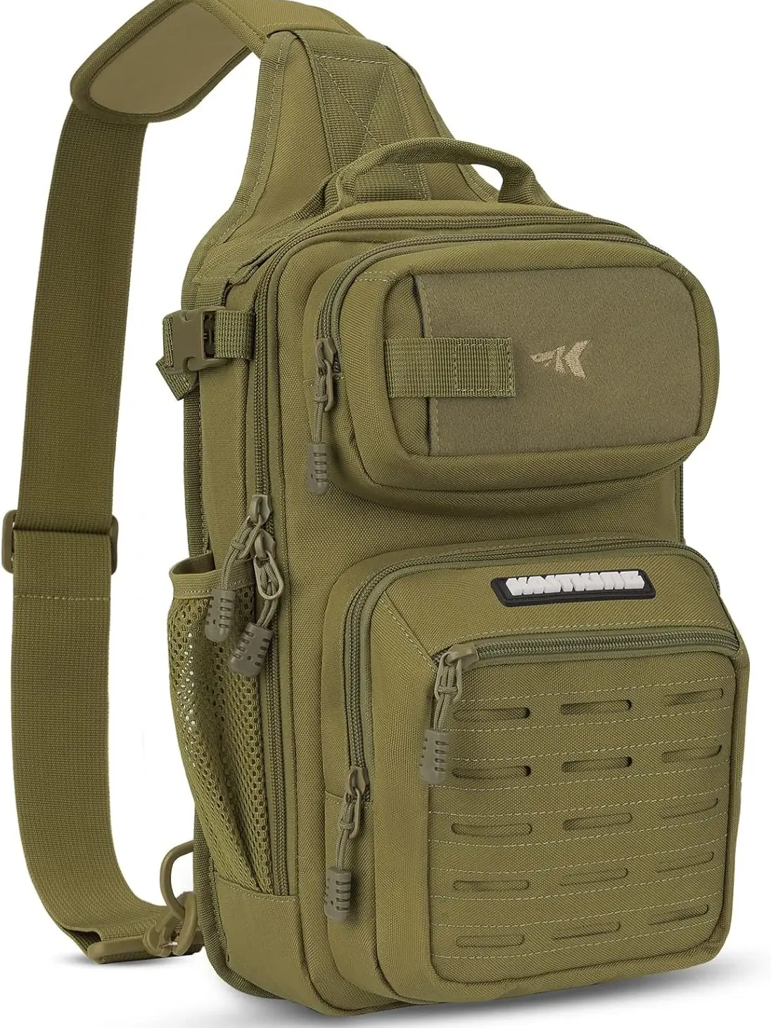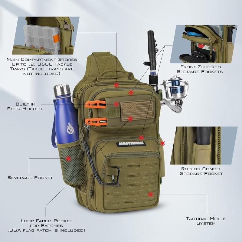 Ā·TOUGH MATERIAL & MOLLE SYSTEM ā The KastKing BlowBak sling backpack is made from tough 600D material for excellent long-term performance and reliability. Our water repellent coating on the inside provides extra protection to ensure your contents are protected from the elements. The die-cut tactical molle hold-down system provides unlimited possibilities to customize your BlowBak sling bag to suit your needs.