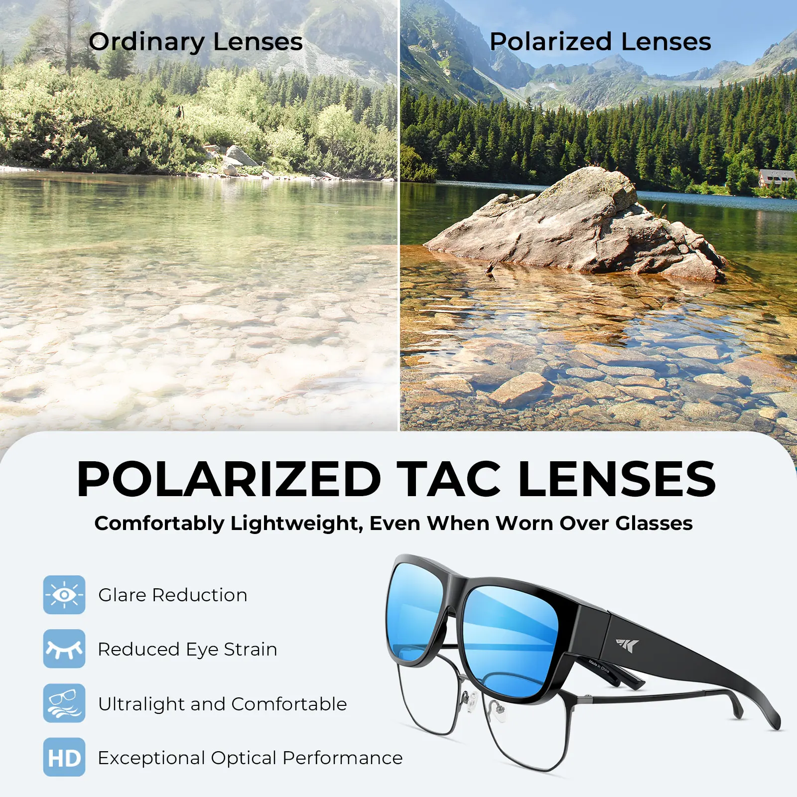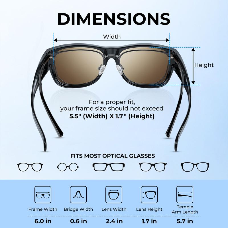 ·FITS MOST OPTICAL GLASSES - Our Chariton Polarized Fit-over sunglasses feature a versatile design with a frame size of 1.7 * 2.4 inches, making the wrap around sunglasses suitable for the vast majority of optical glasses. This ensures a comfortable and secure fit for a wide range of users, allowing you to enjoy clear vision without compromise.