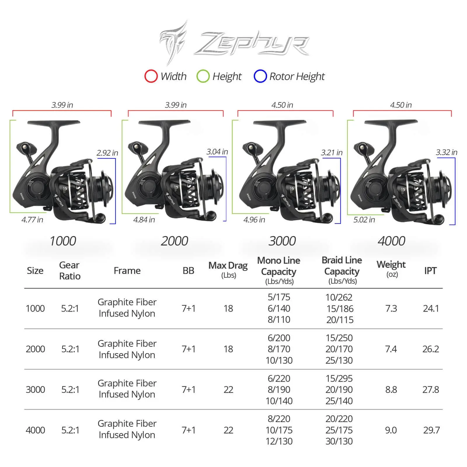 KastKing introduces Zephyr Spinning Reels, an extraordinary high level design, light weight fishing reel for bass fishing and trout fishing, and an excellent choice as a freshwater or saltwater spinning reel. Zephyr, meaning a light gentle breeze, lives up to its name. The 1000 size weighs only 7.2 ounces and is a perfect ice fishing reel, the 2000 is 7.4 ozs, the 3000 and 4000 are 8.8 and 9 ozs respectively. Remarkably light weight spinning reels for those sizes.