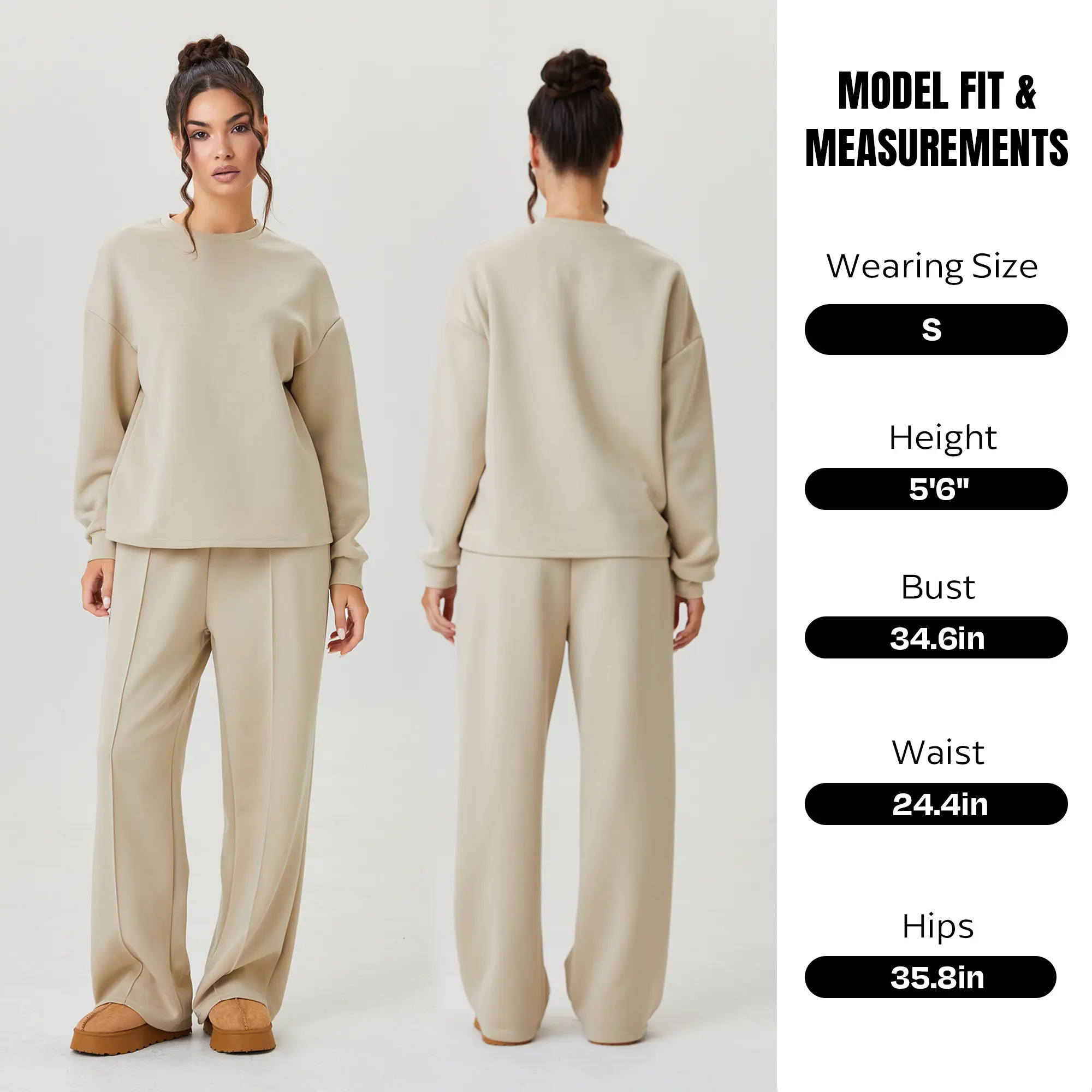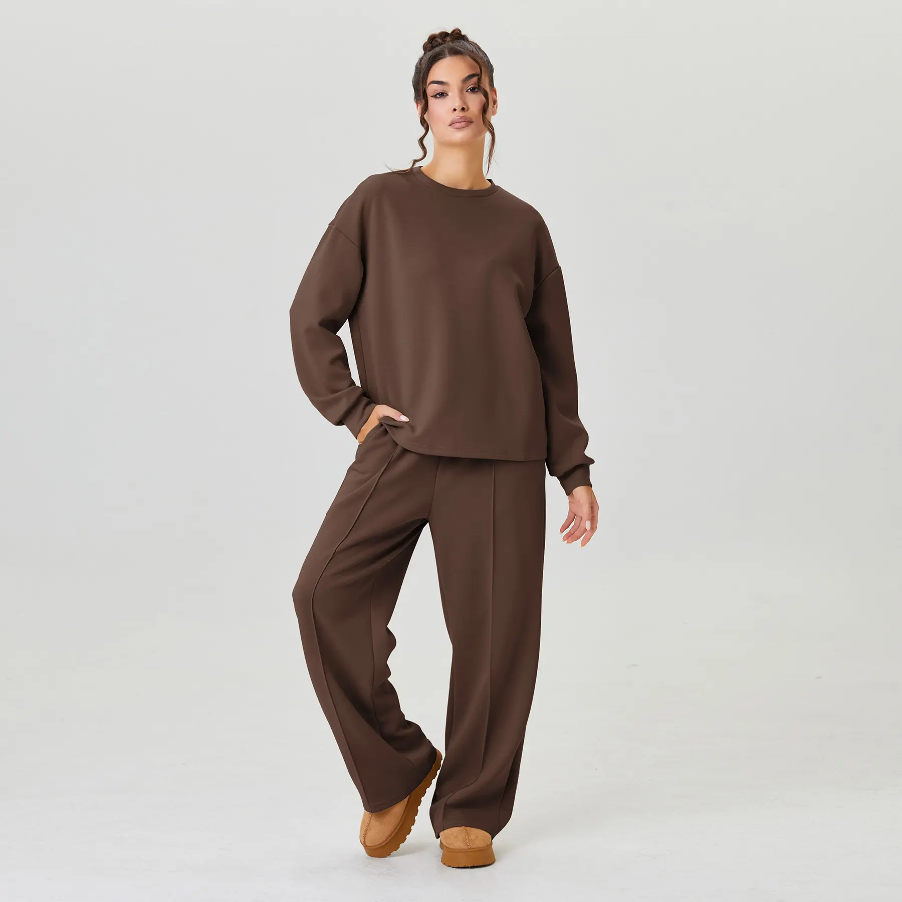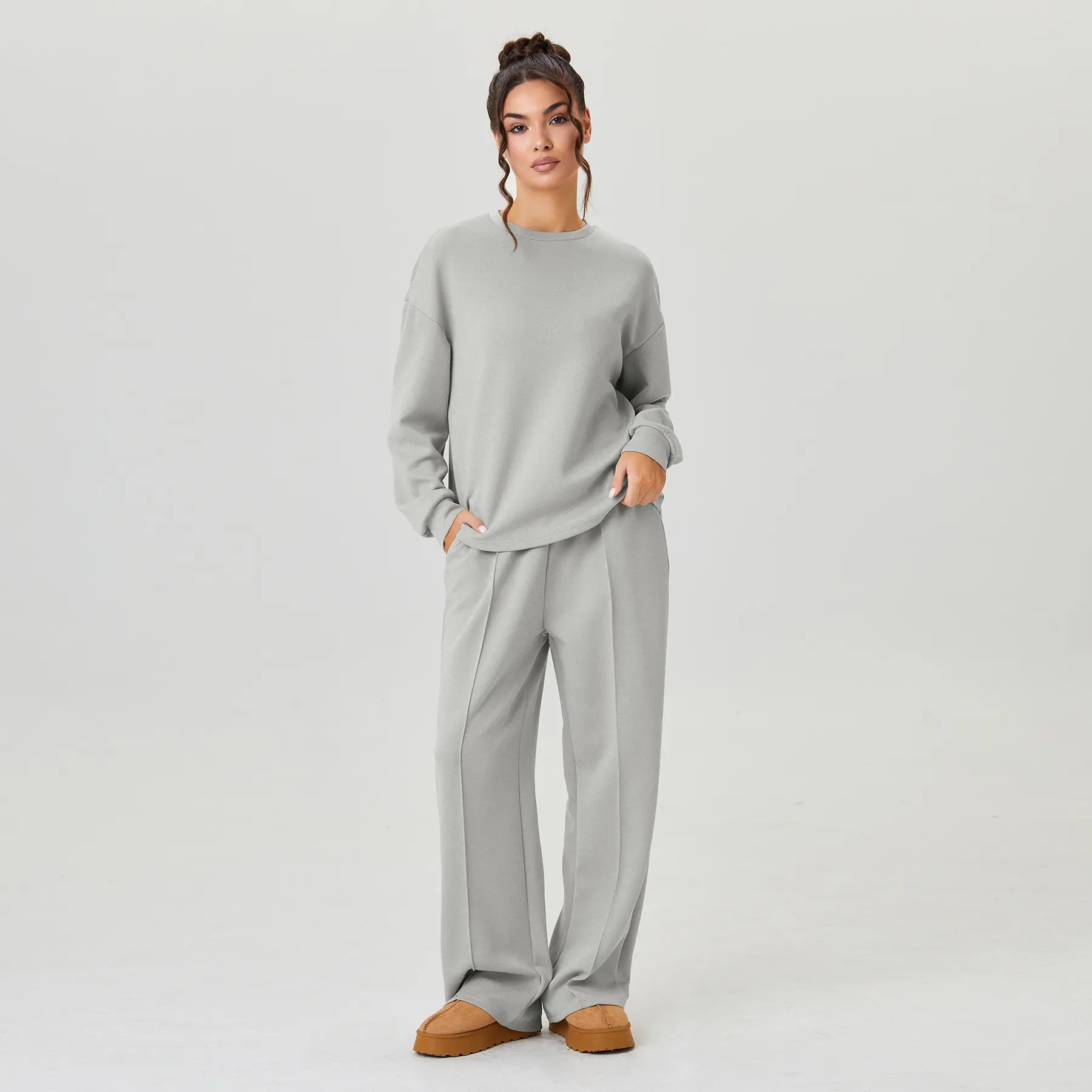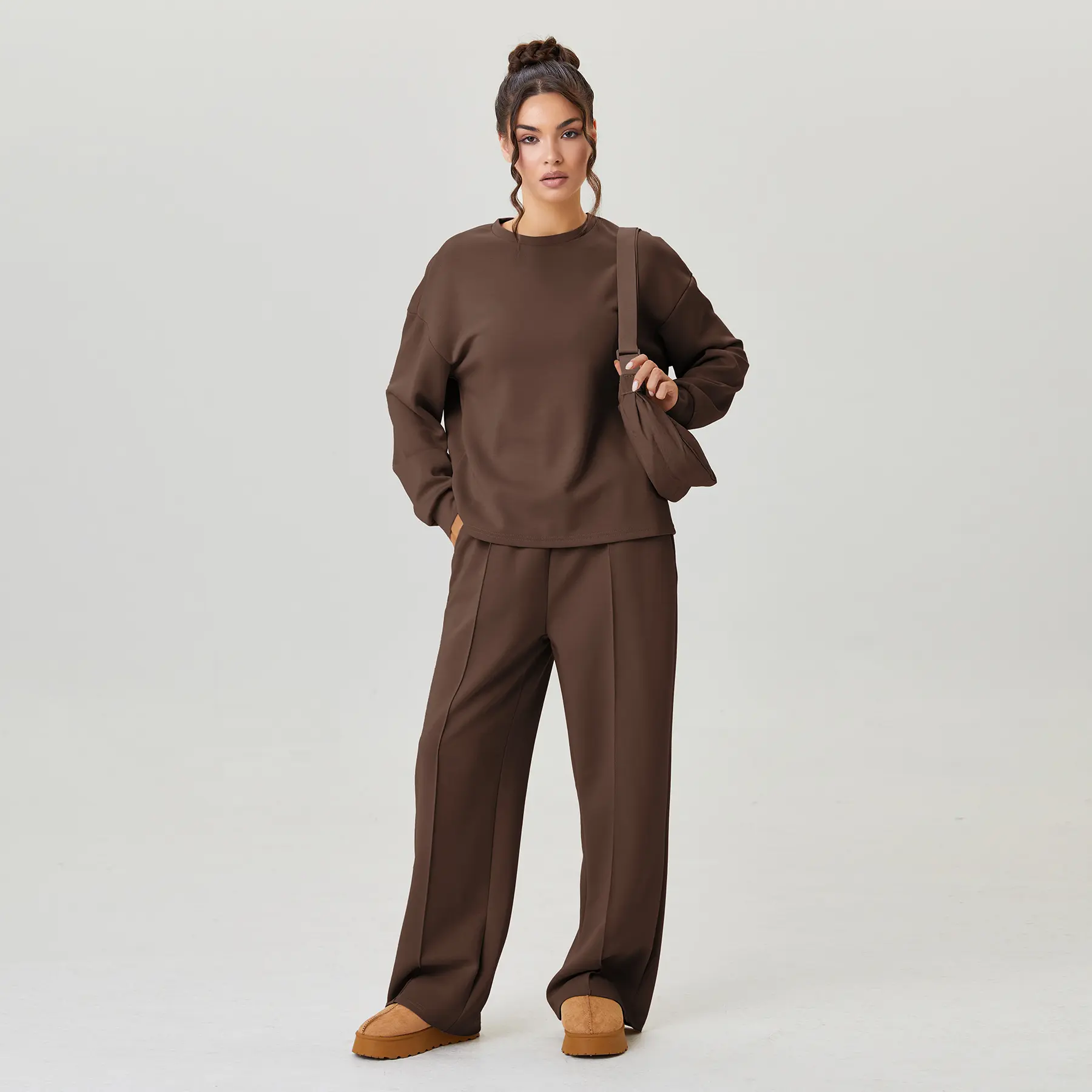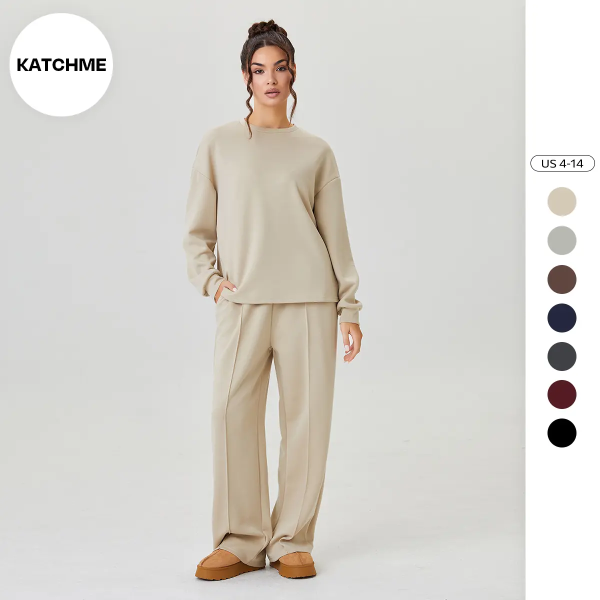 KatchMe Women's Casual Solid Color Loose Long Sleeve Top & Exposed Stitches Trousers Co-ord