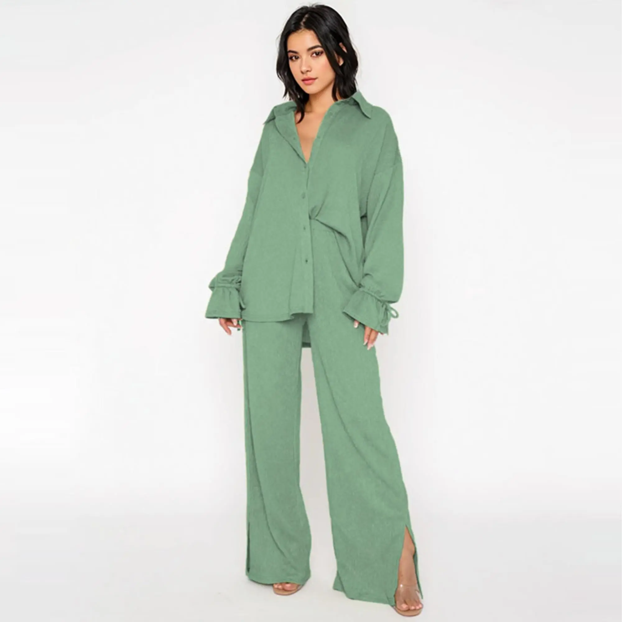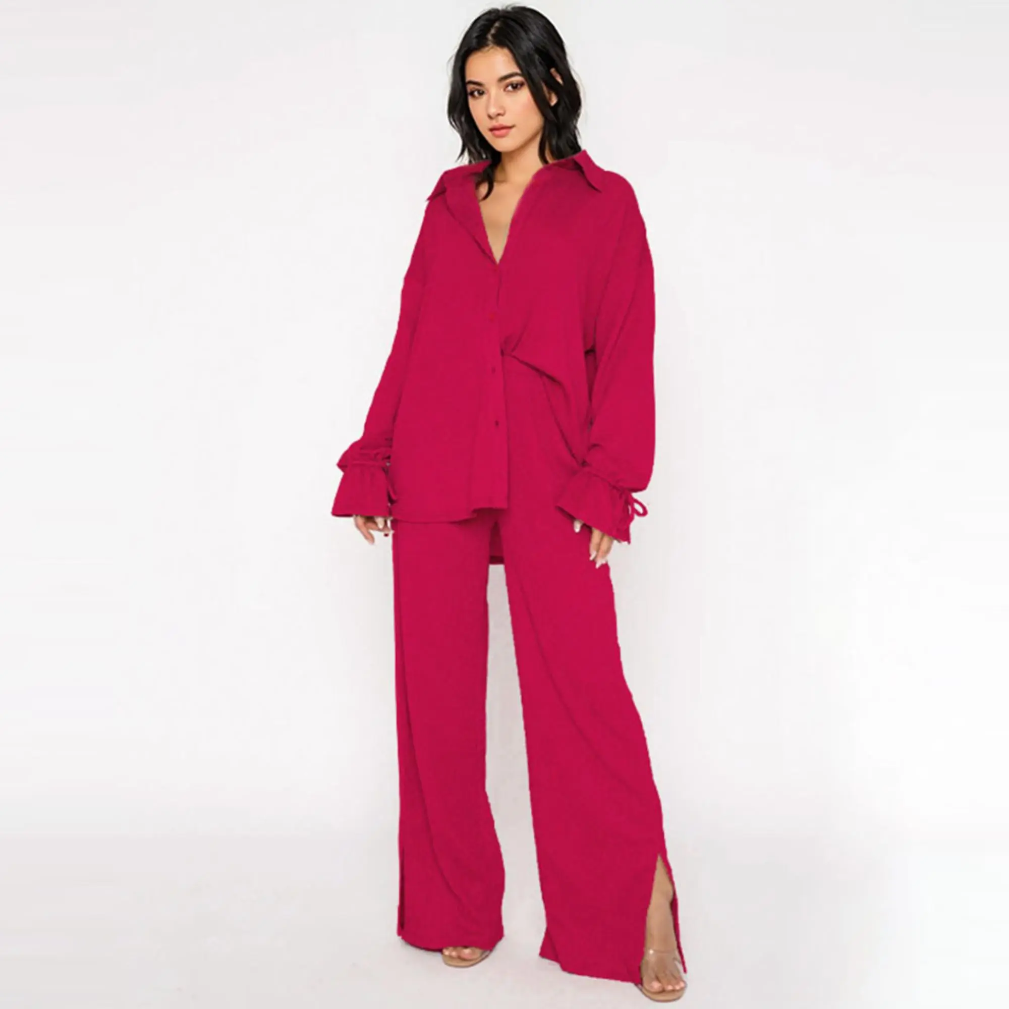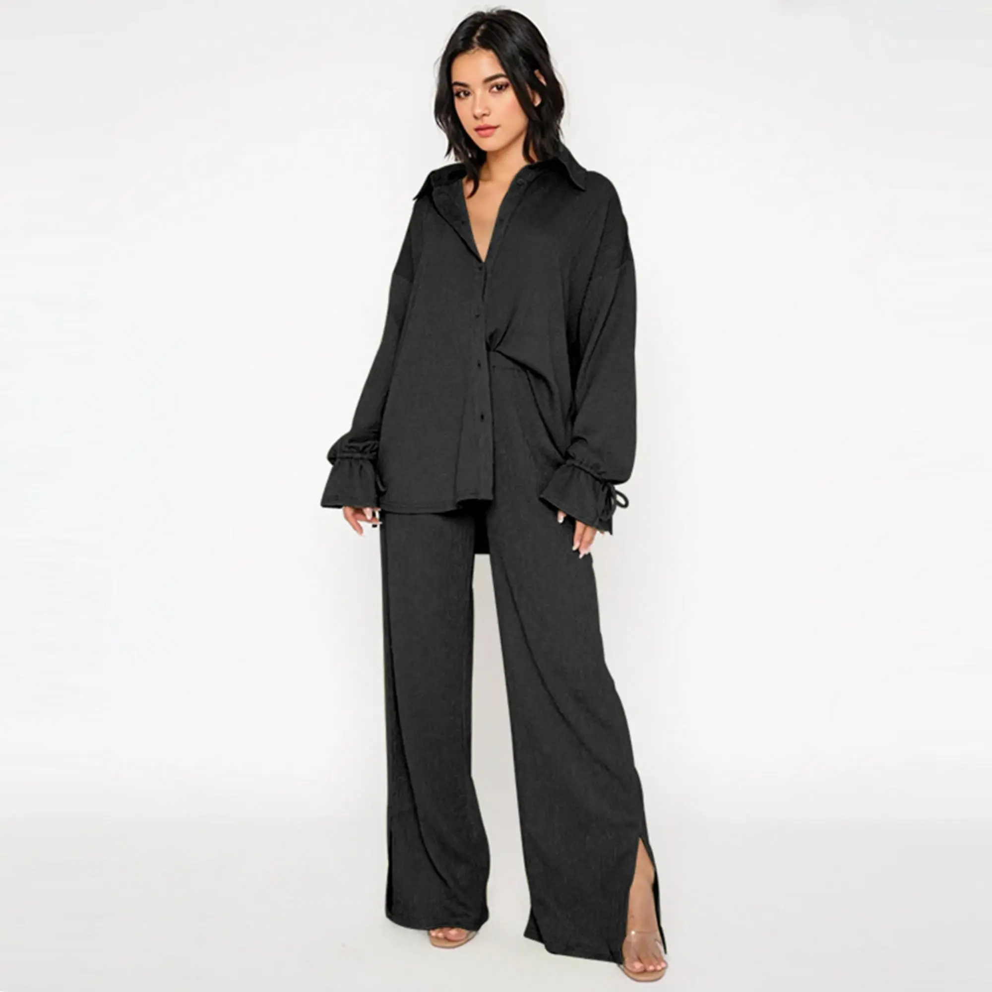 ·Details: Solid color, Collared neck, Long sleeves with flounce design, High waist, Side pockets, Slit hemline