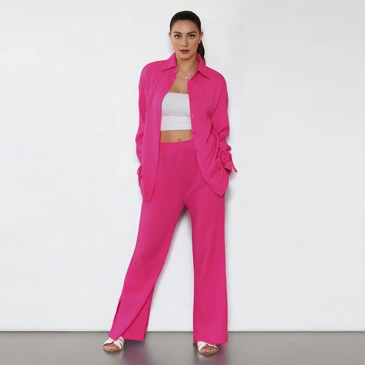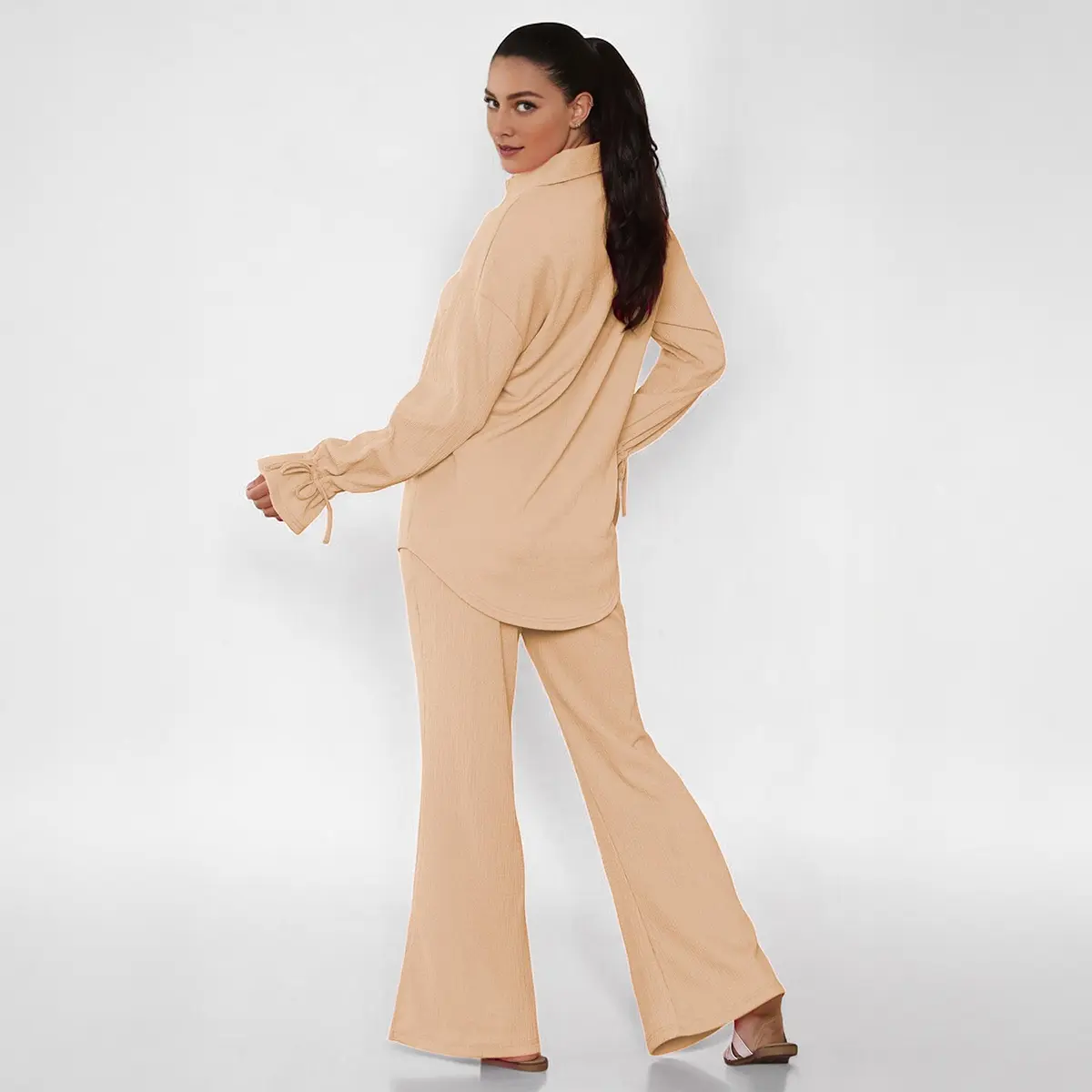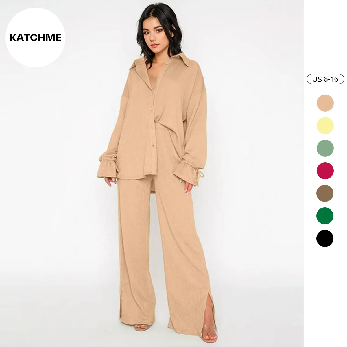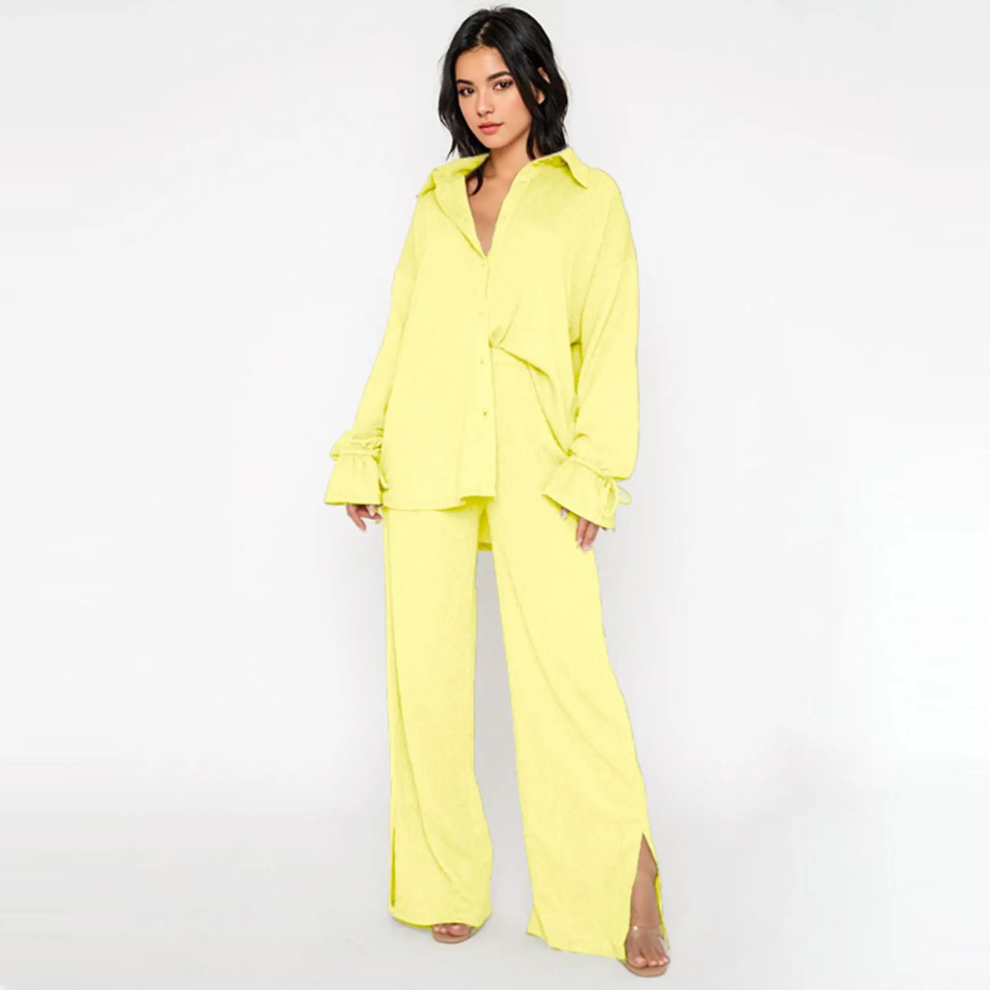 ·Details: Solid color, Collared neck, Long sleeves with flounce design, High waist, Side pockets, Slit hemline