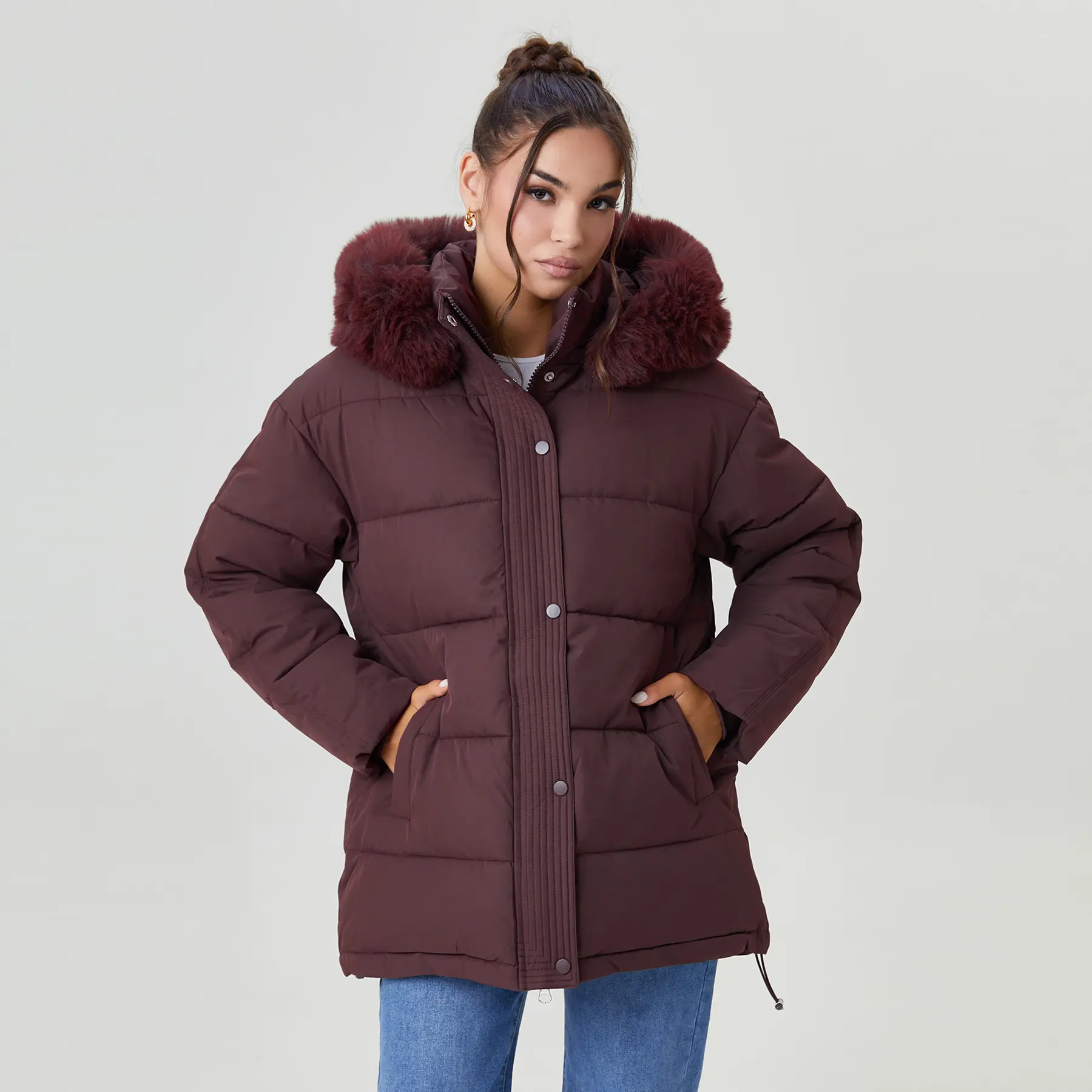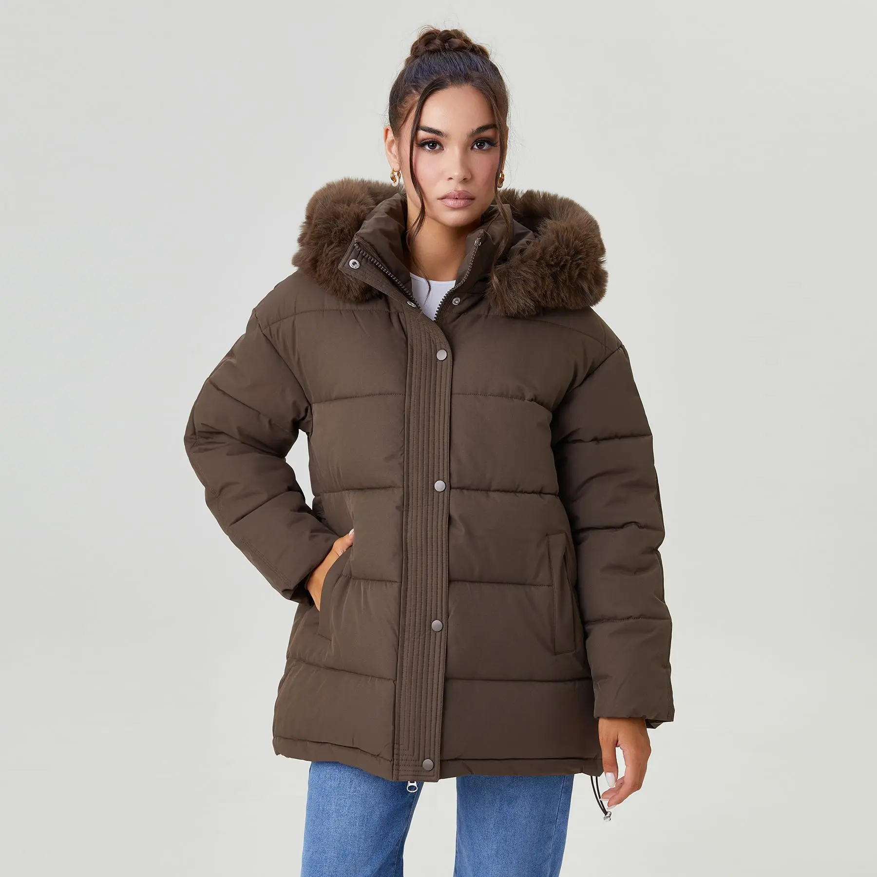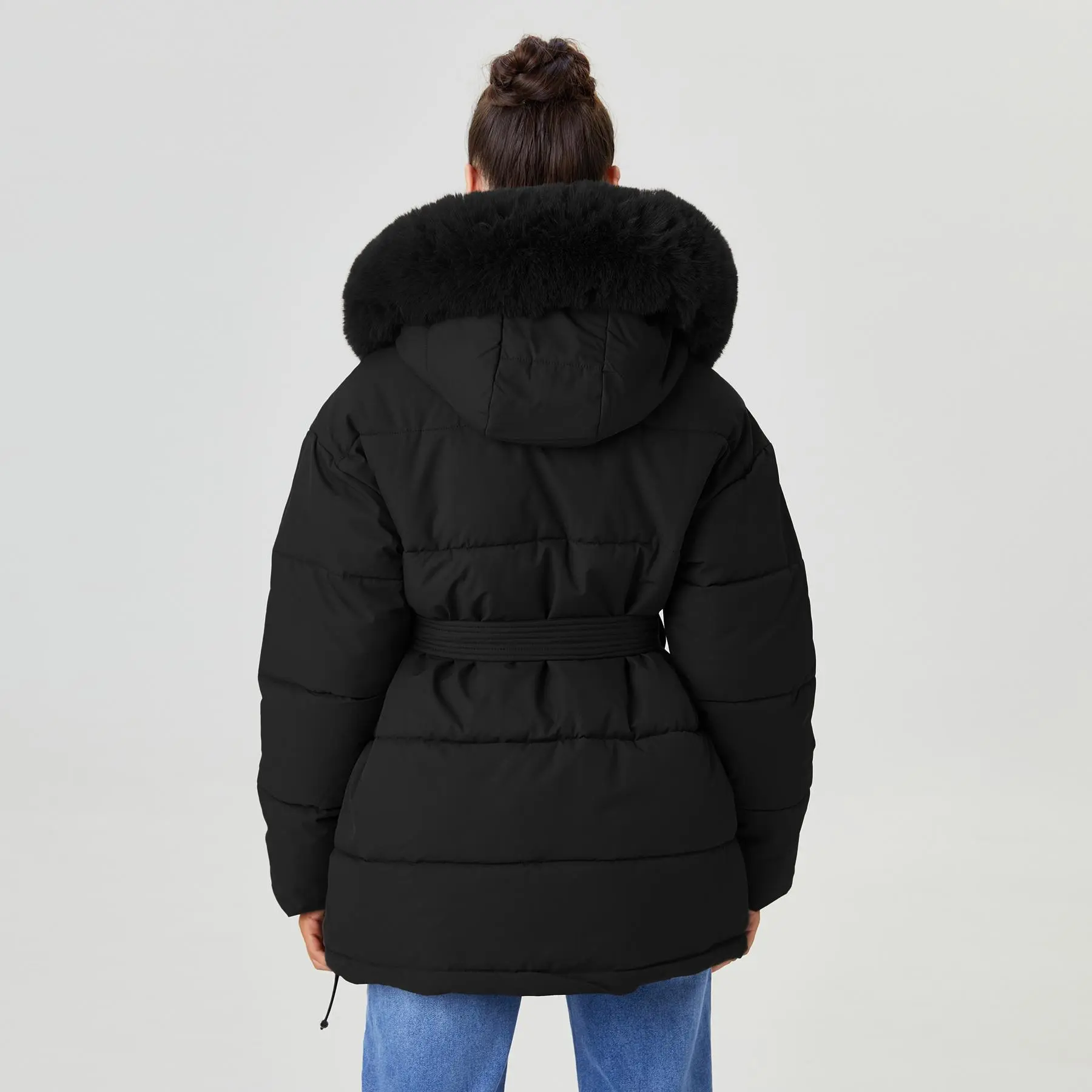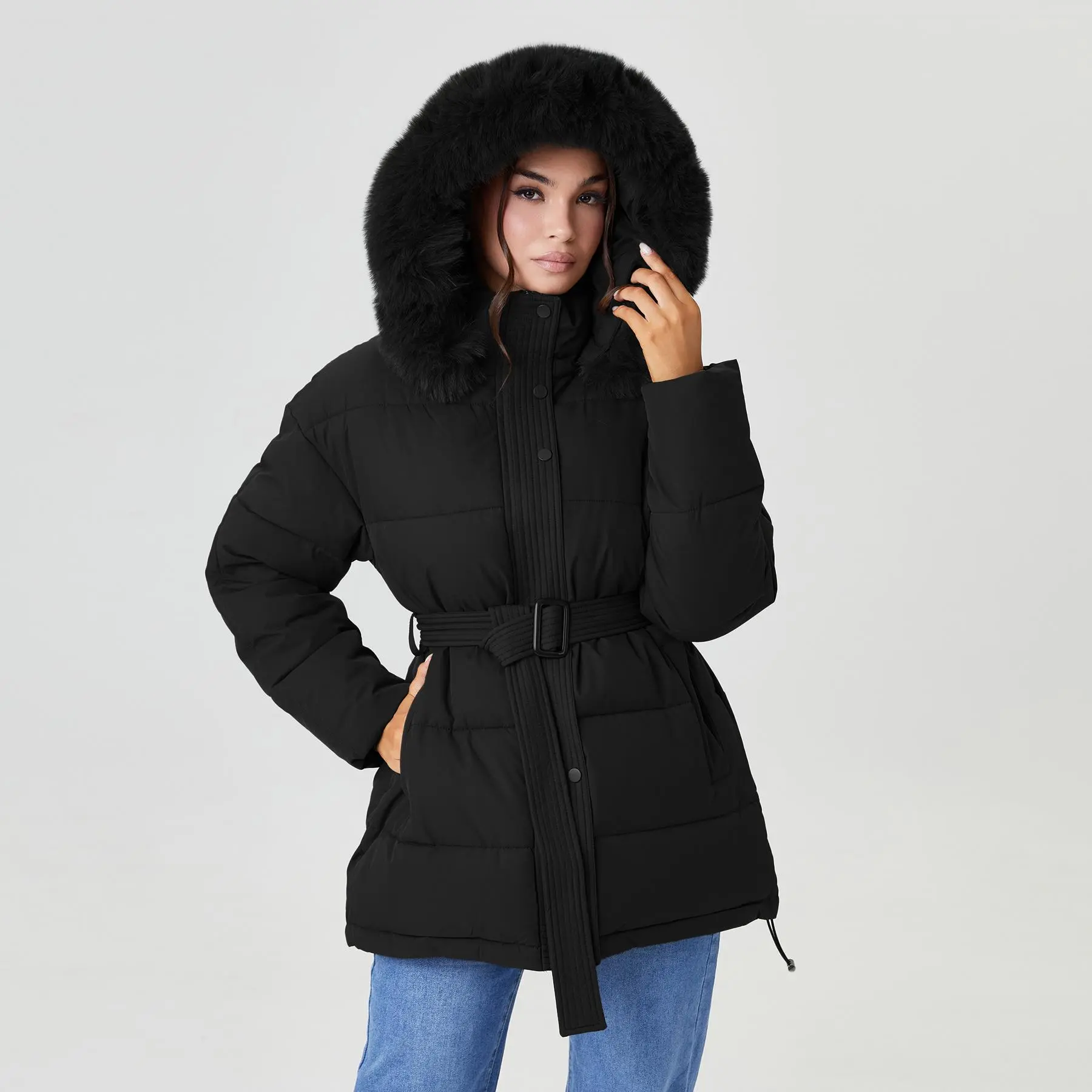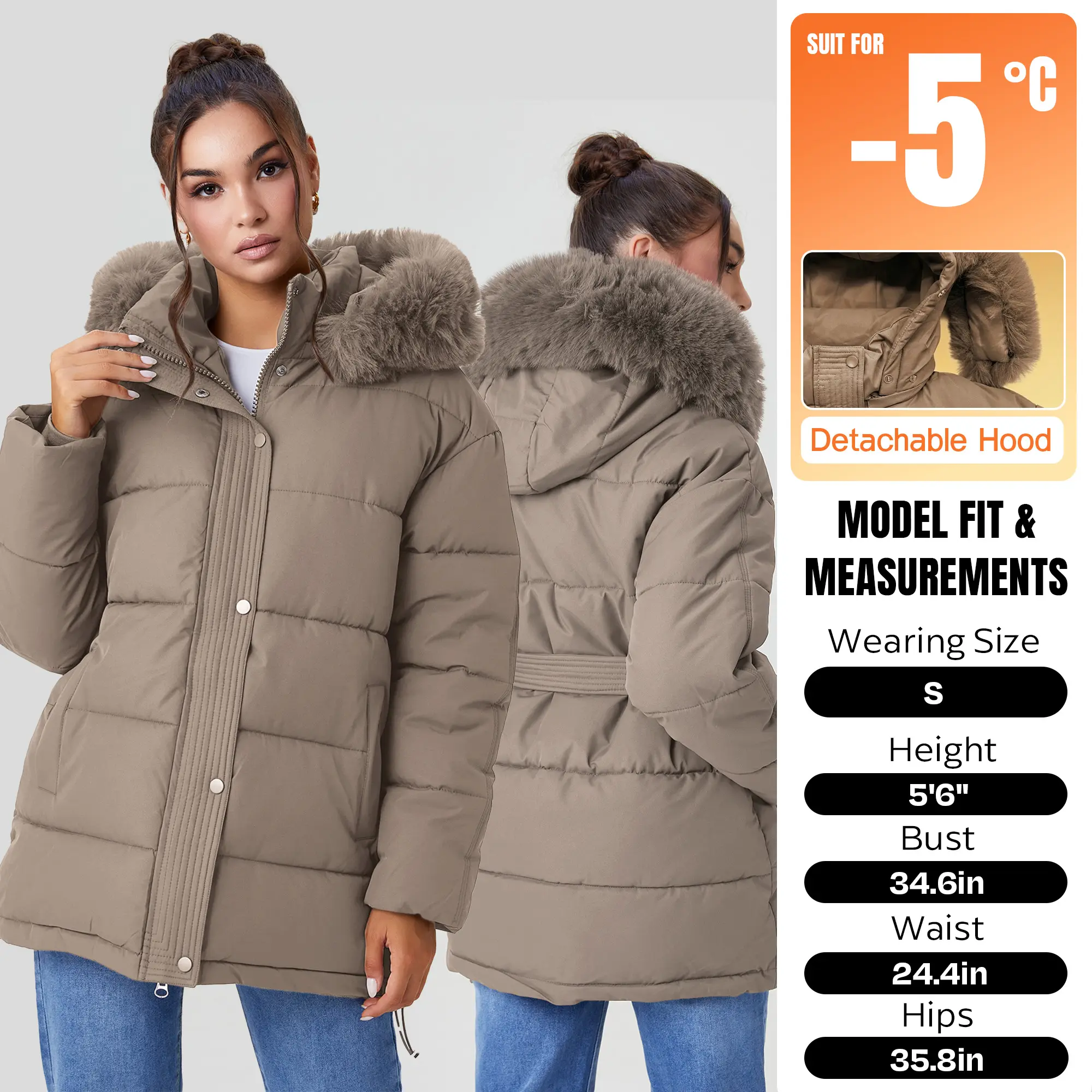 ·Design: Attached fluffy hood, Functional side pockets, Detachable waist belt