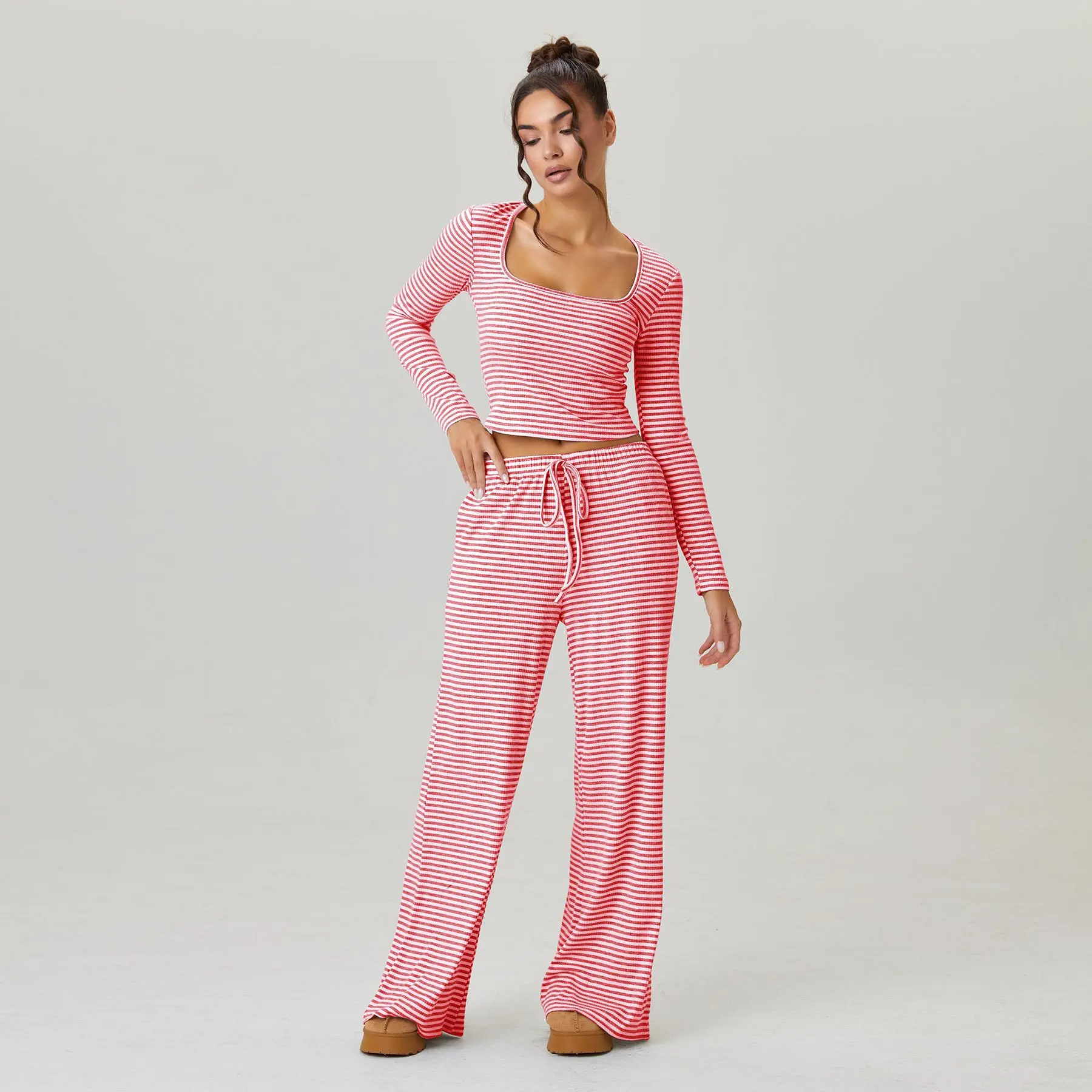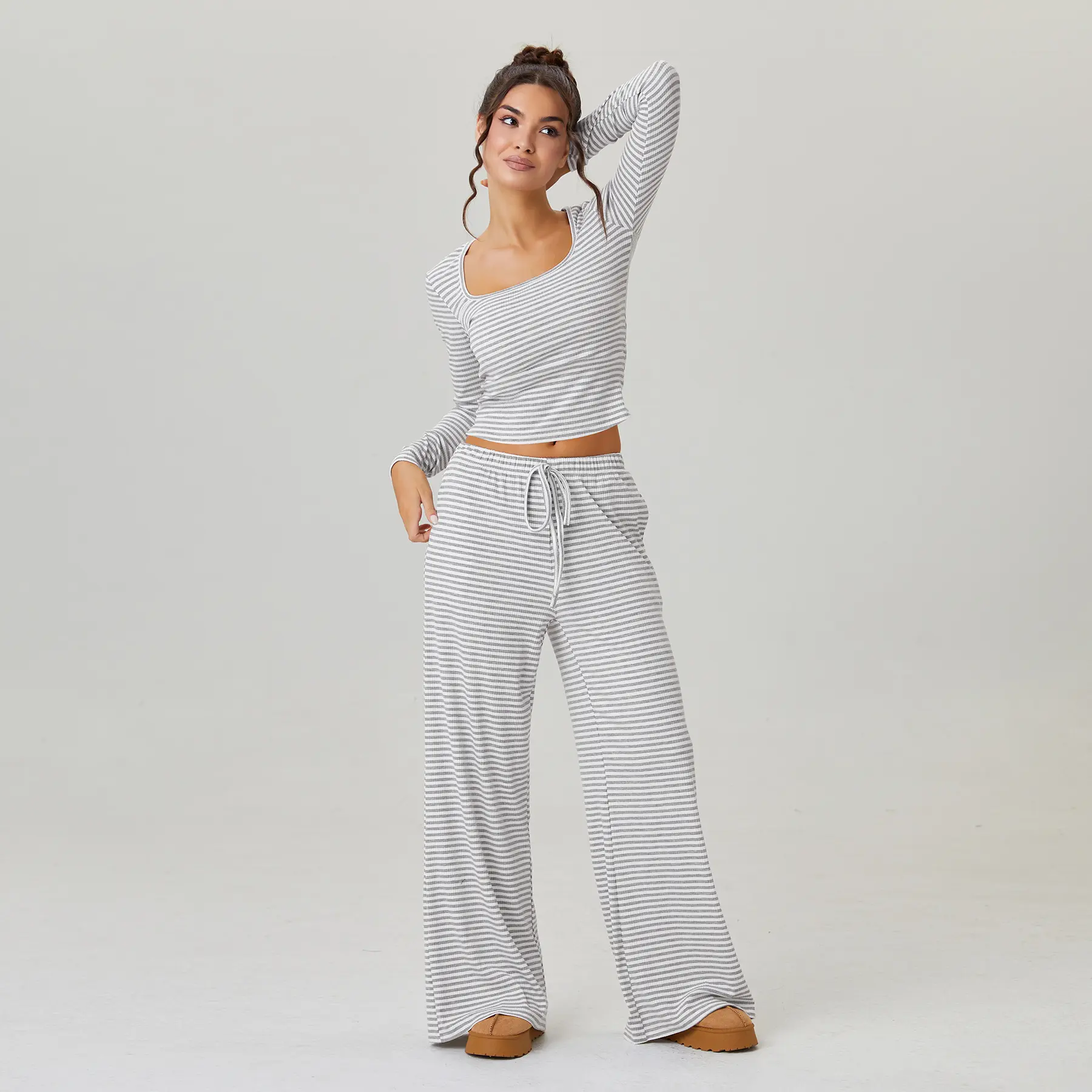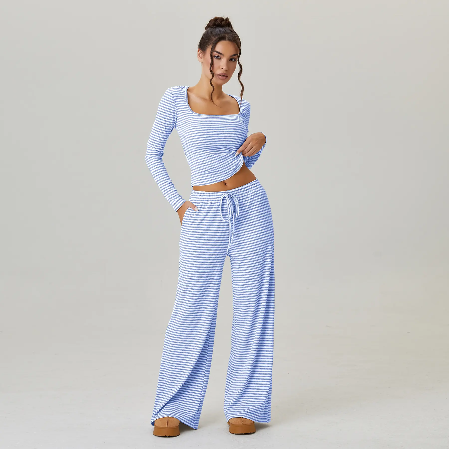 ·Details: Square neck, Long sleeves, Cropped length, Low-rise, Drawstring waist, Soft and stretch fabric