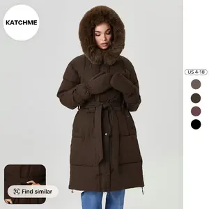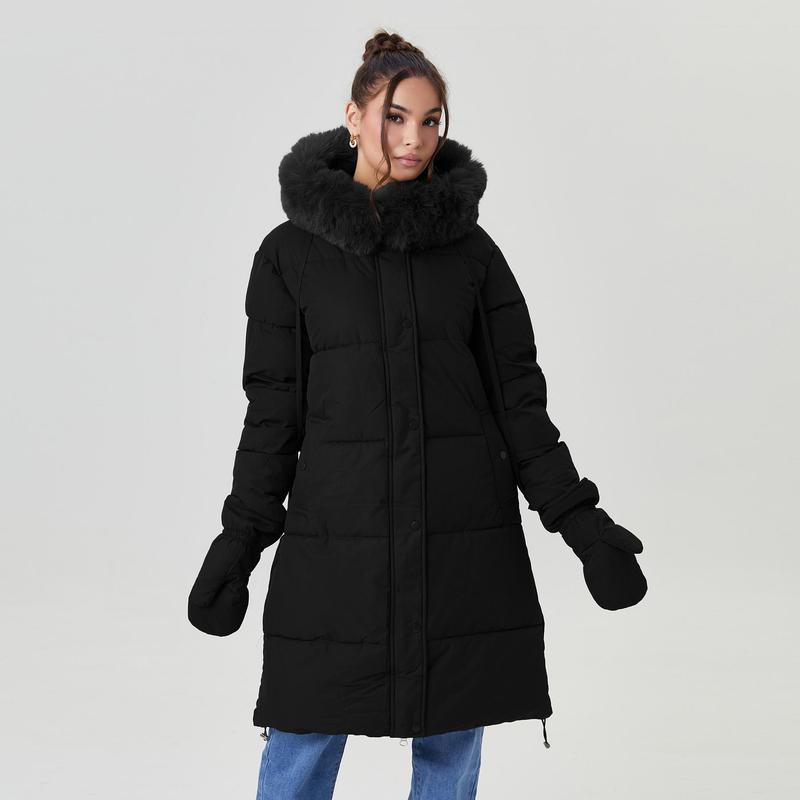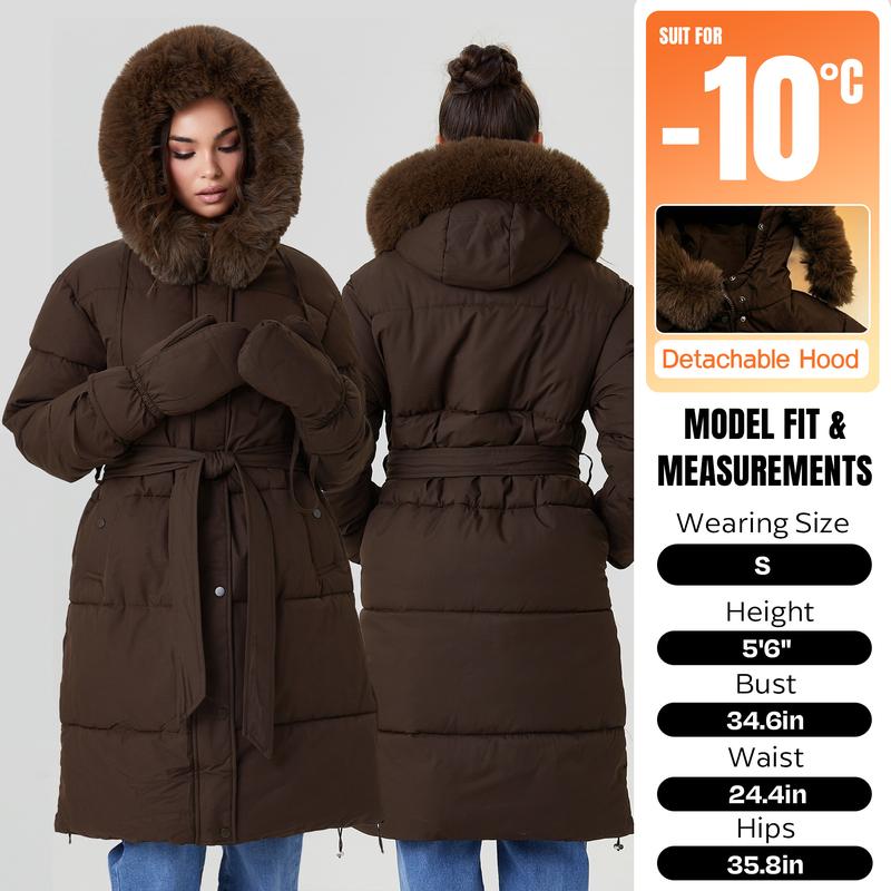 KatchMe Women's Classy Solid Color Fluffy Hooded Waist Tie Zipper Thermal Long Outerwear with Gloves