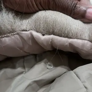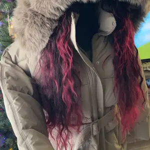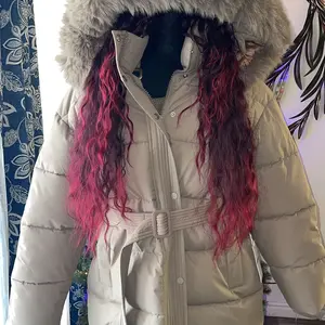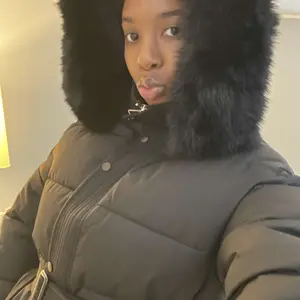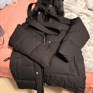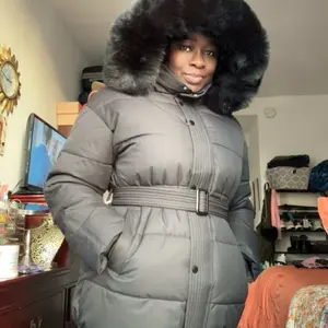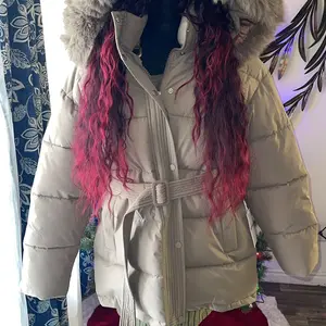 ¡Details: Long sleeves, Attached fluffy hood, Functional side pockets, Detachable waist belt, Mid-length