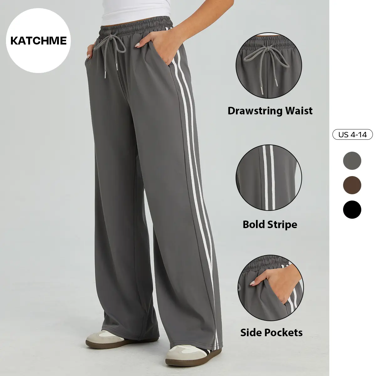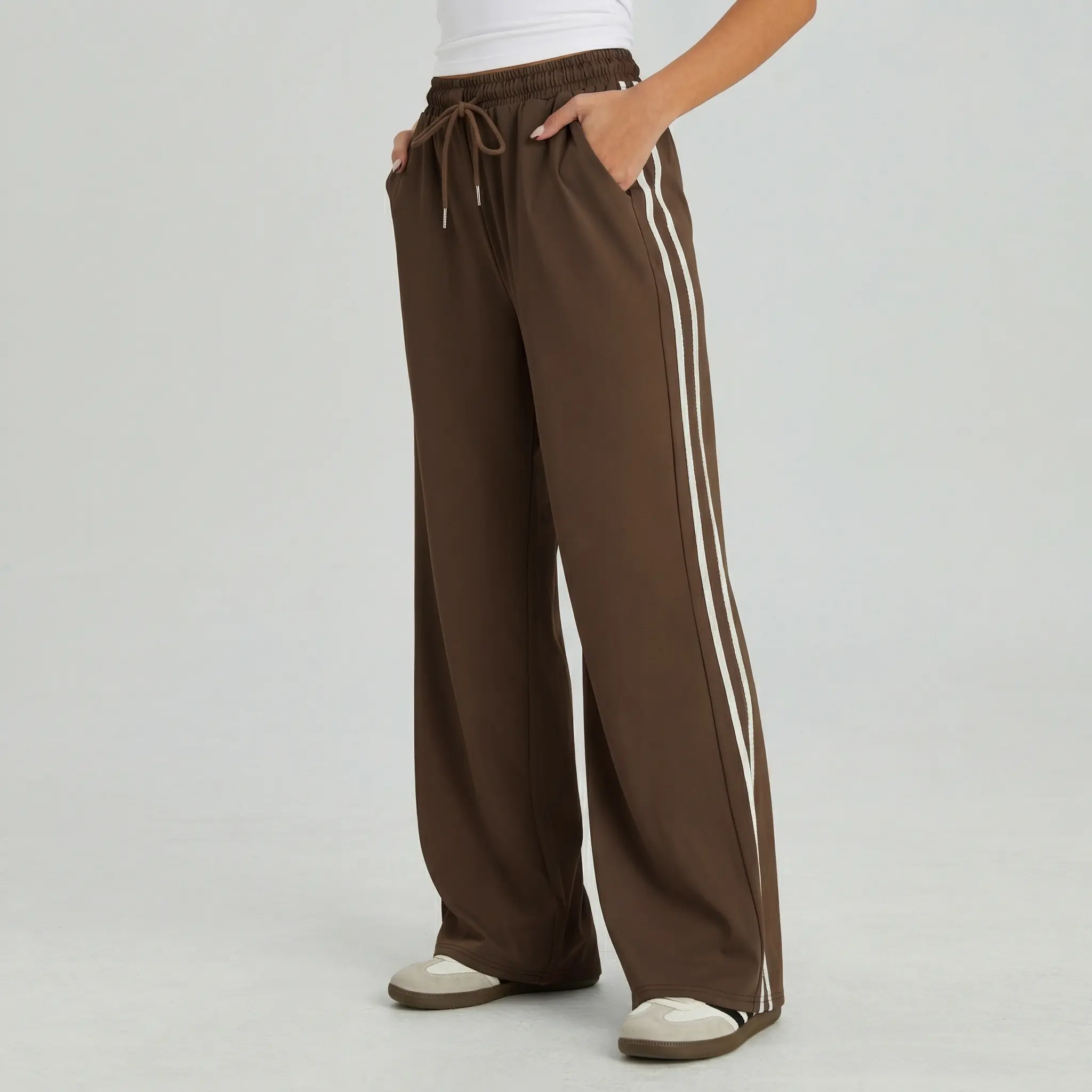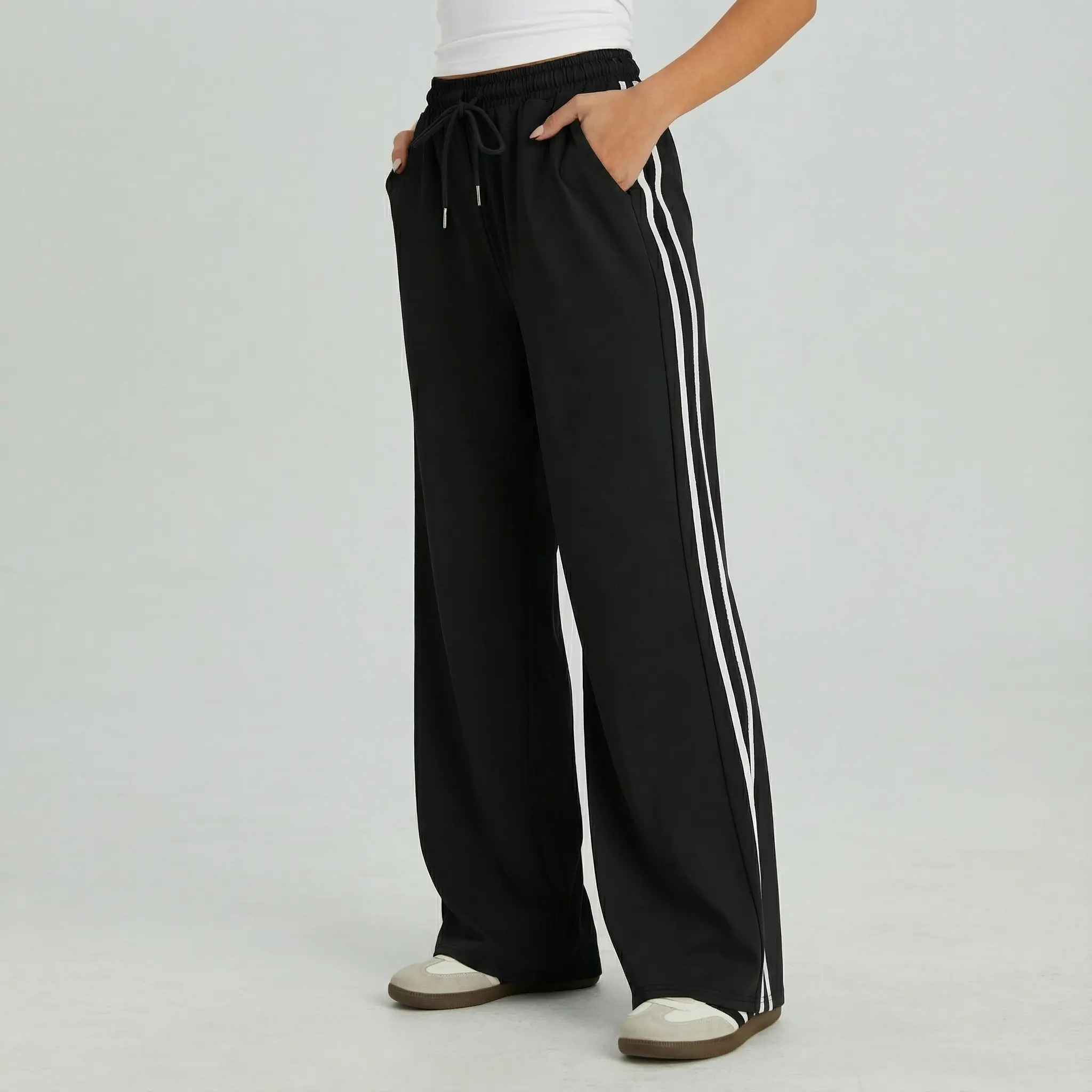 KatchMe Women's Casual High Waist Striped Wide Leg Trousers, Sporty Drawstring Waist Side Pocket Outfit, Versatile Women's Bottom
