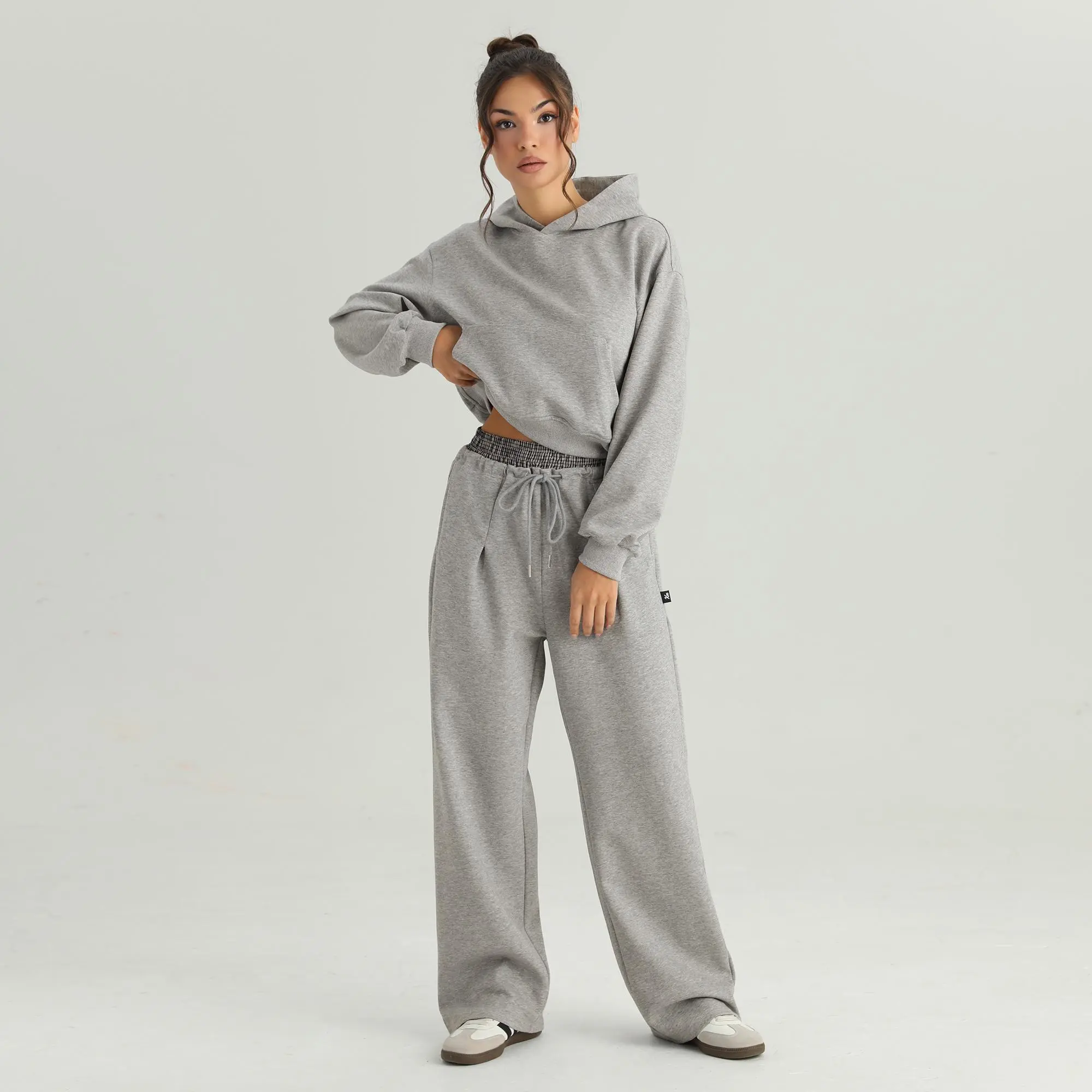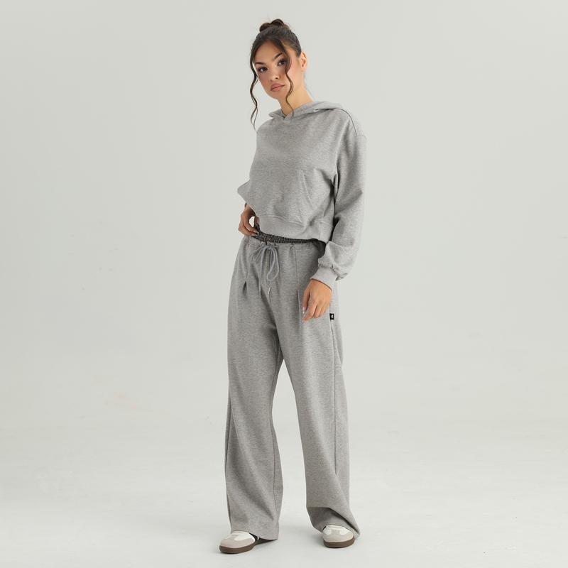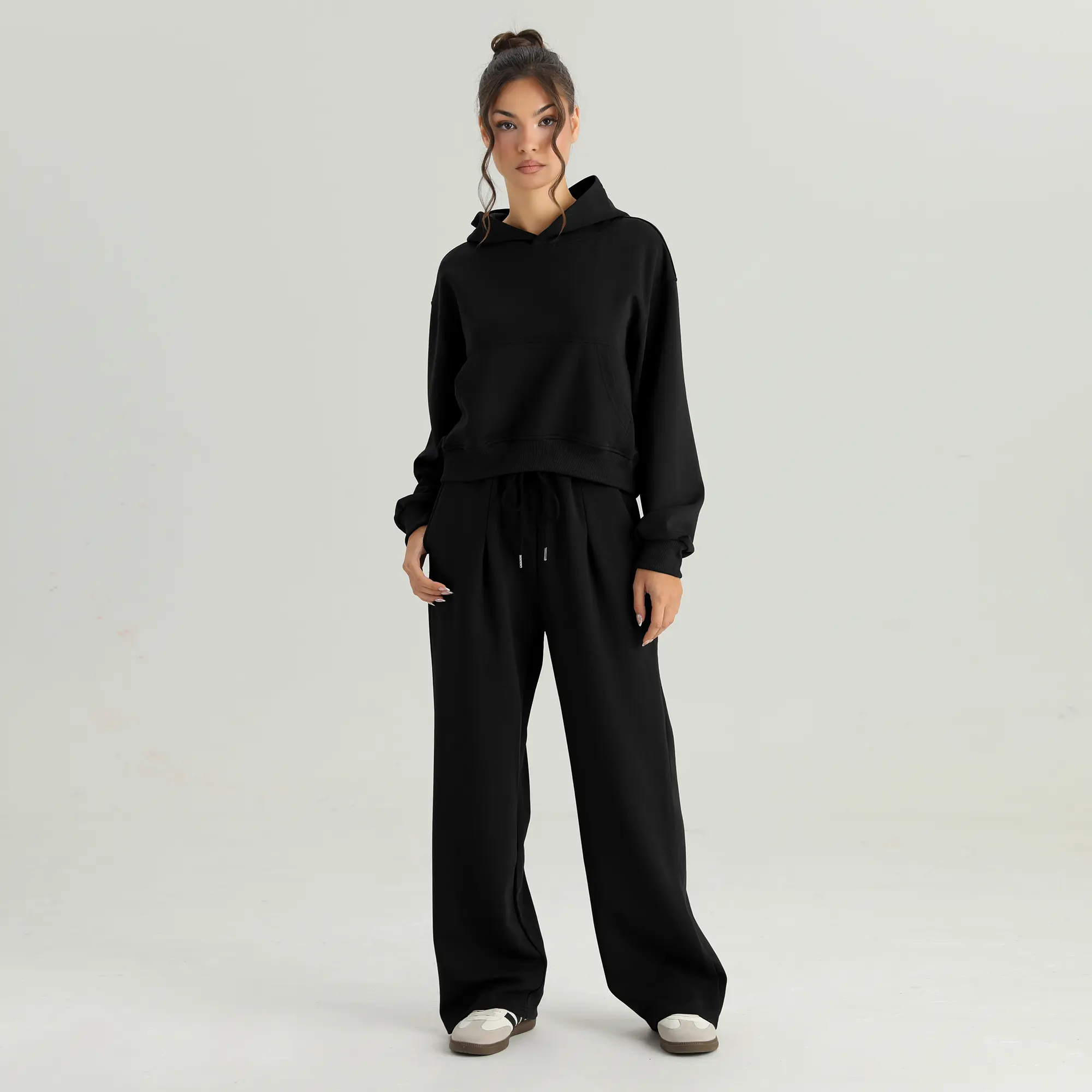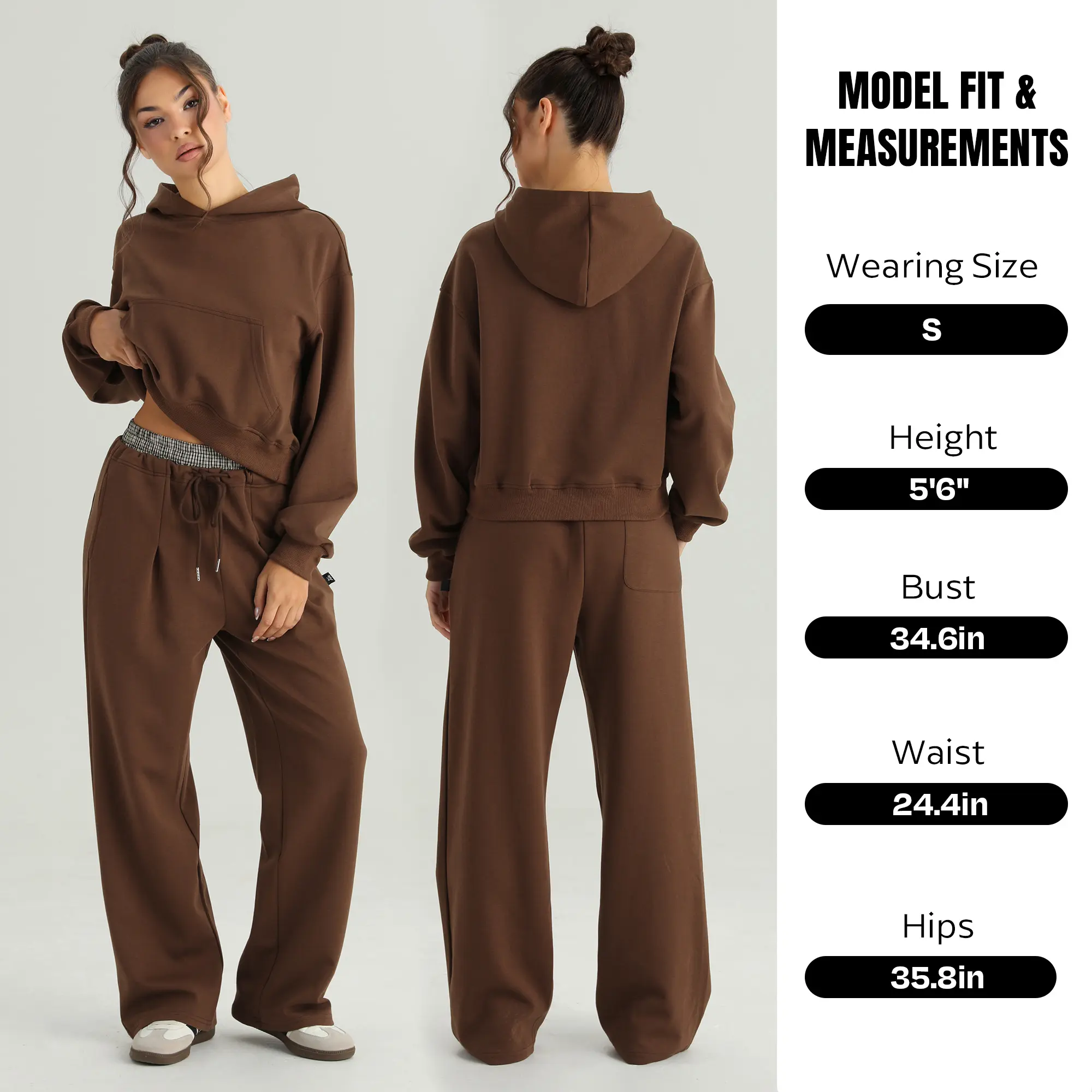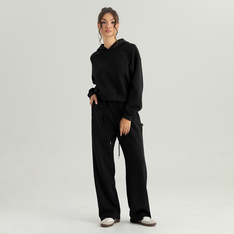 KatchMe Women's Casual Hooded Long Sleeve Cropped Hoodie & Contrast Waist Wide Leg Trousers Co-ord, Minimalist Solid Color Lightweight Two Piece Outfits