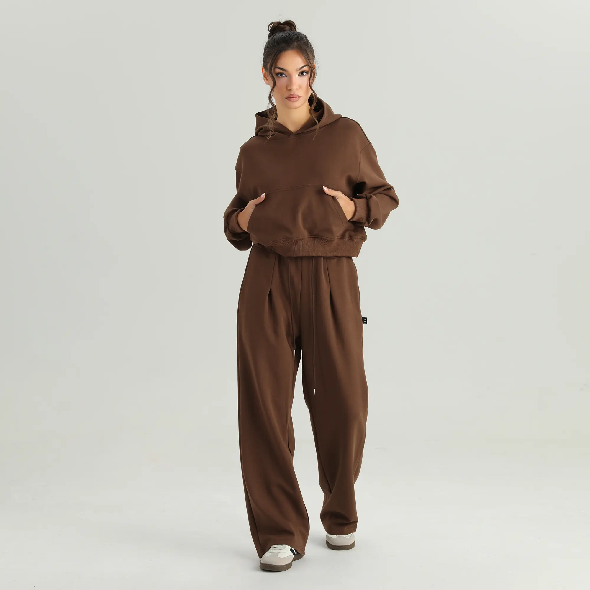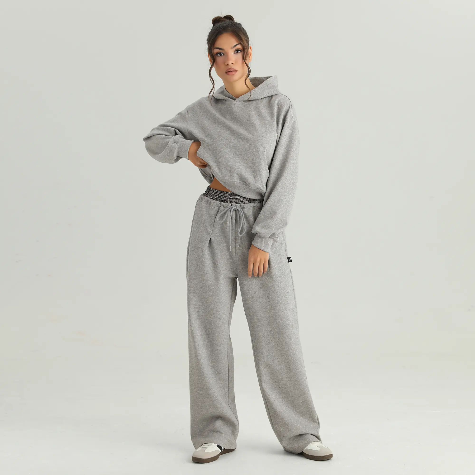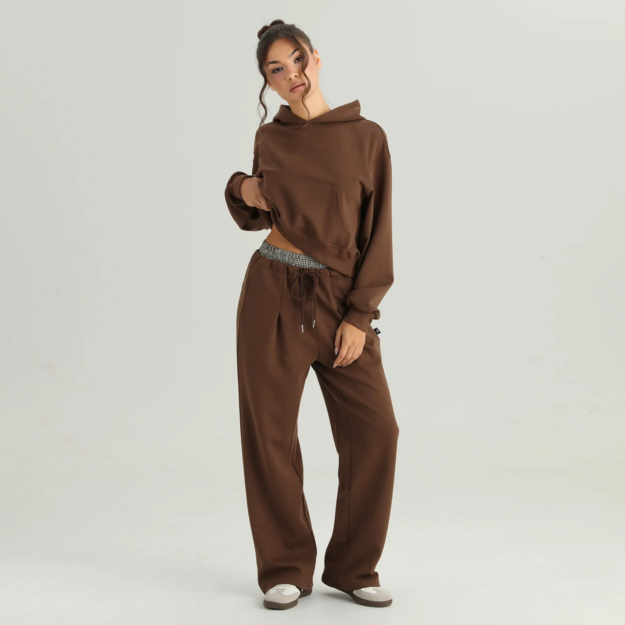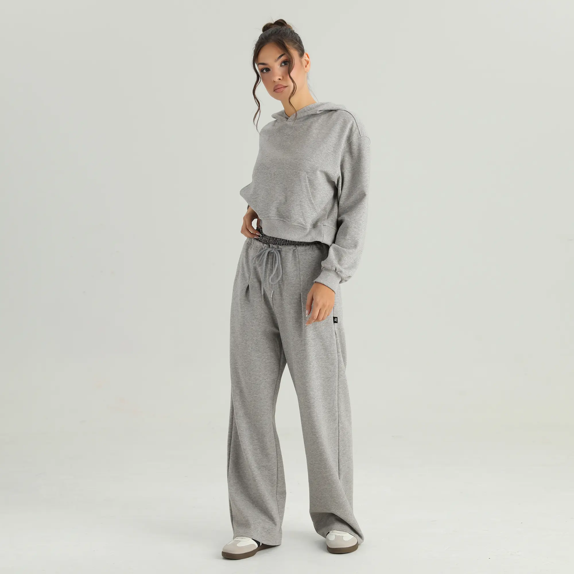 KatchMe Women's Casual Hooded Long Sleeve Cropped Hoodie & Contrast Waist Wide Leg Trousers Co-ord, Minimalist Solid Color Lightweight Two Piece Outfits