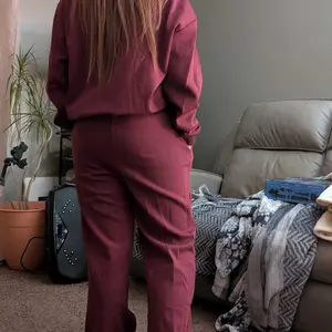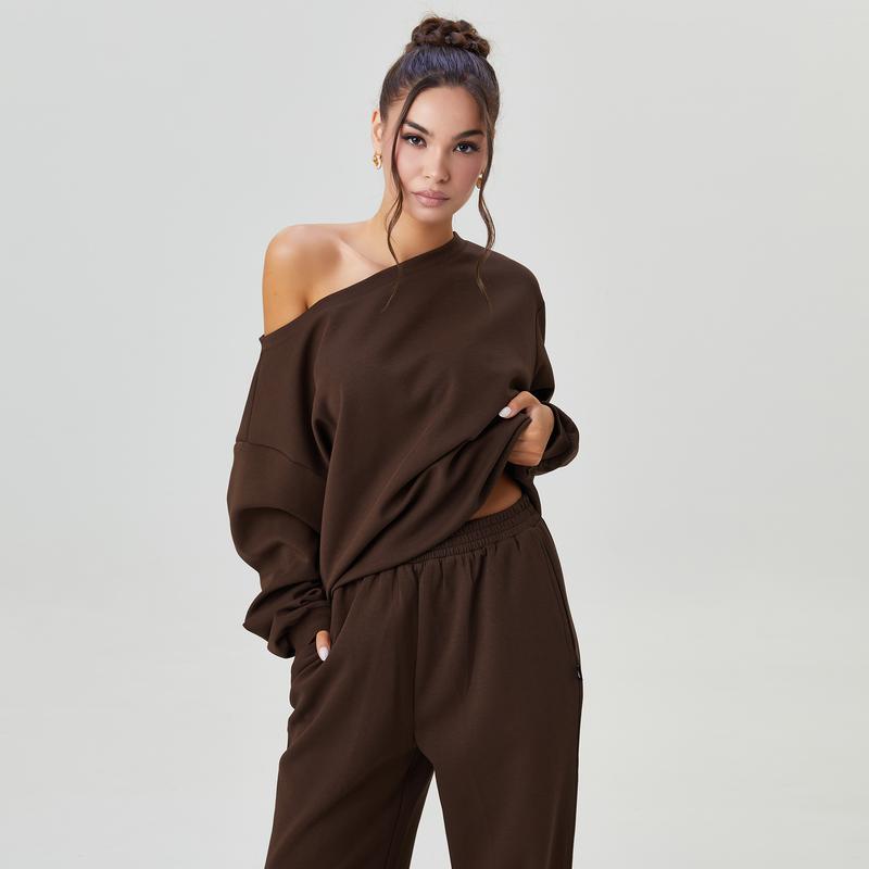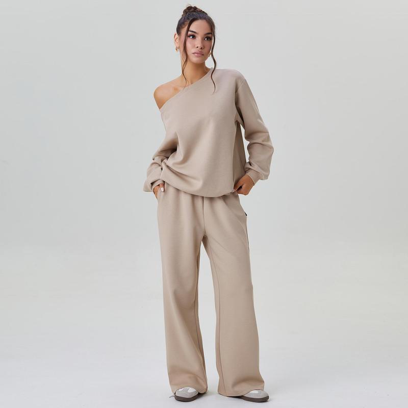 Made from soft, solid-colored fabric, this set features a stylish sloping shoulder design and long sleeves, paired with matching trousers for an elegant appearance.
