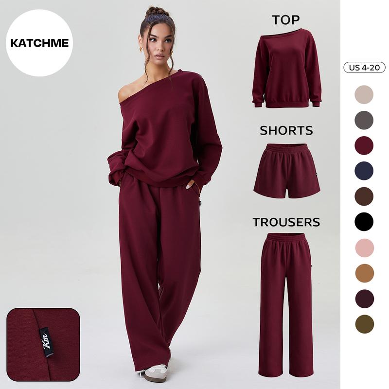 KatchMe Women's Leisure Solid Color Sloping Shoulder Long Sleeve Top & Wide Leg Trousers Co-ord