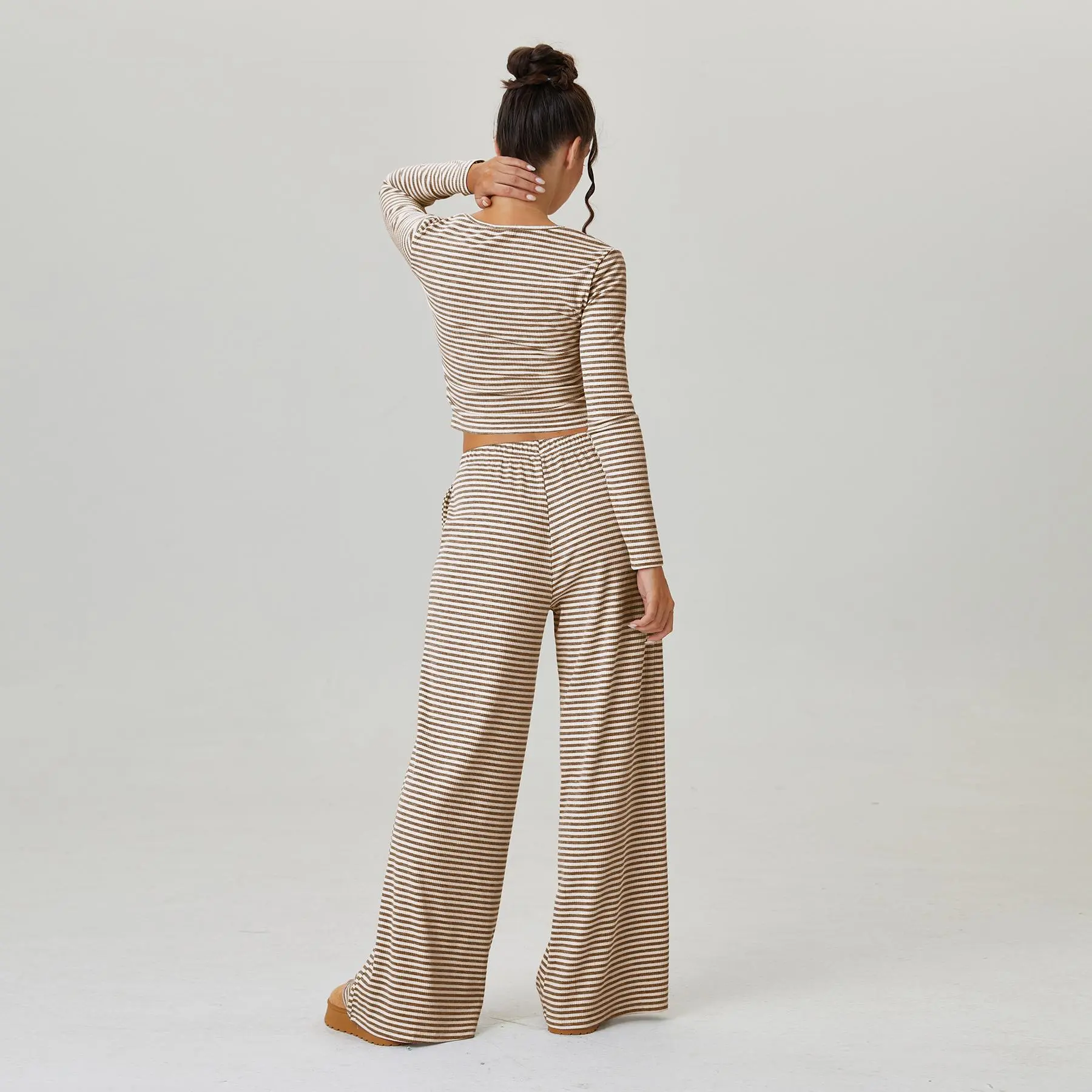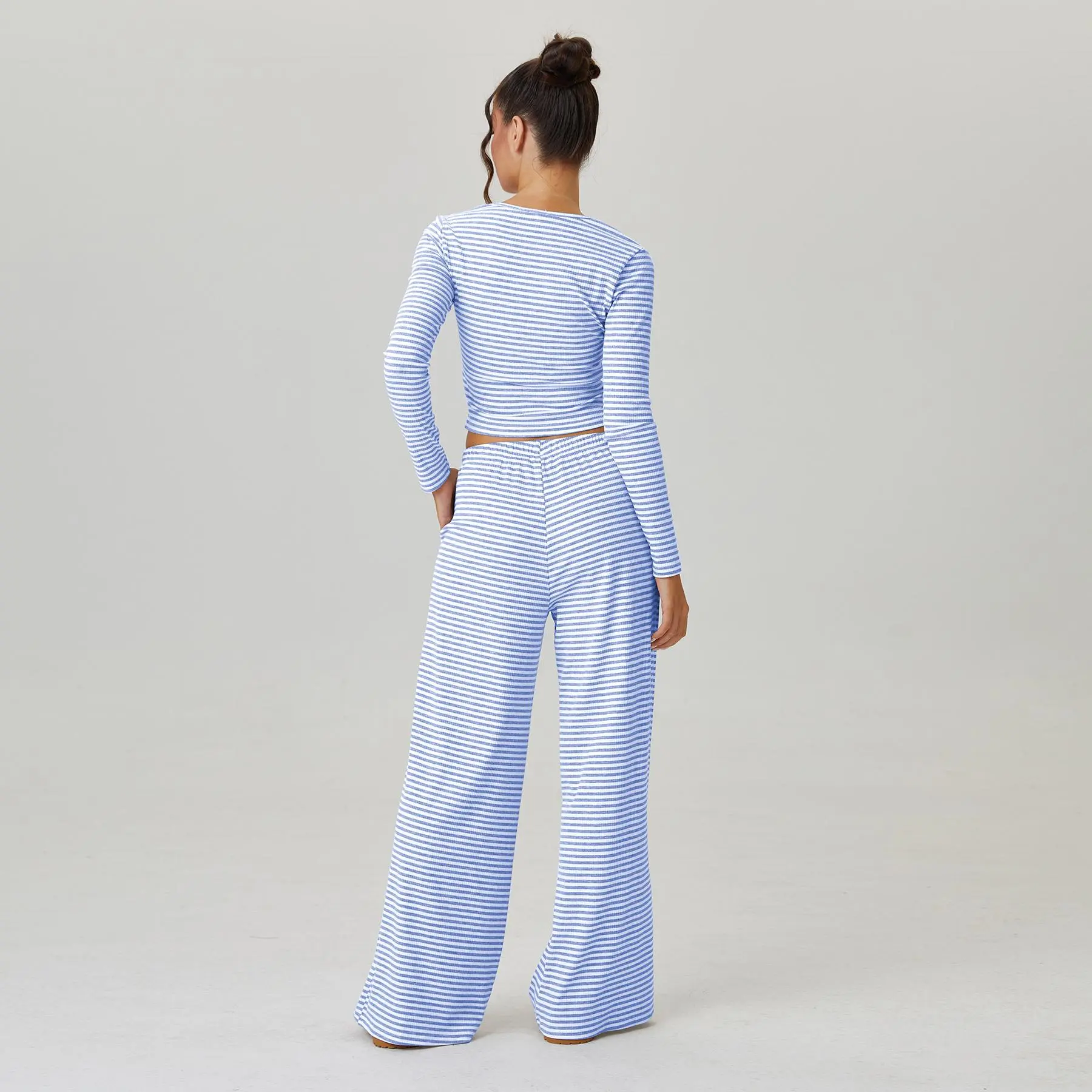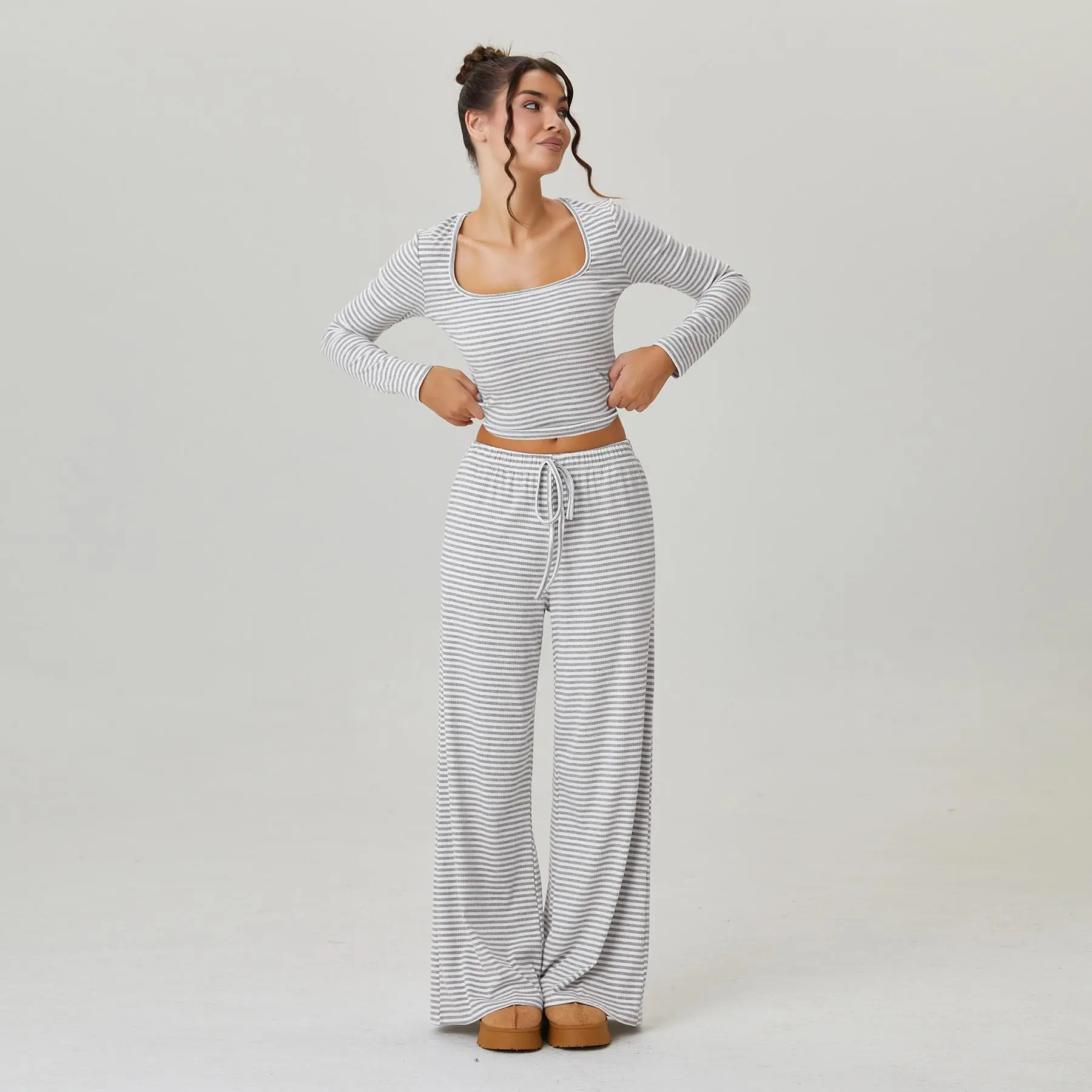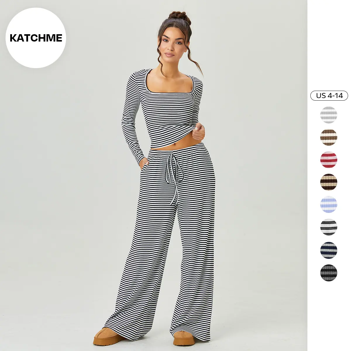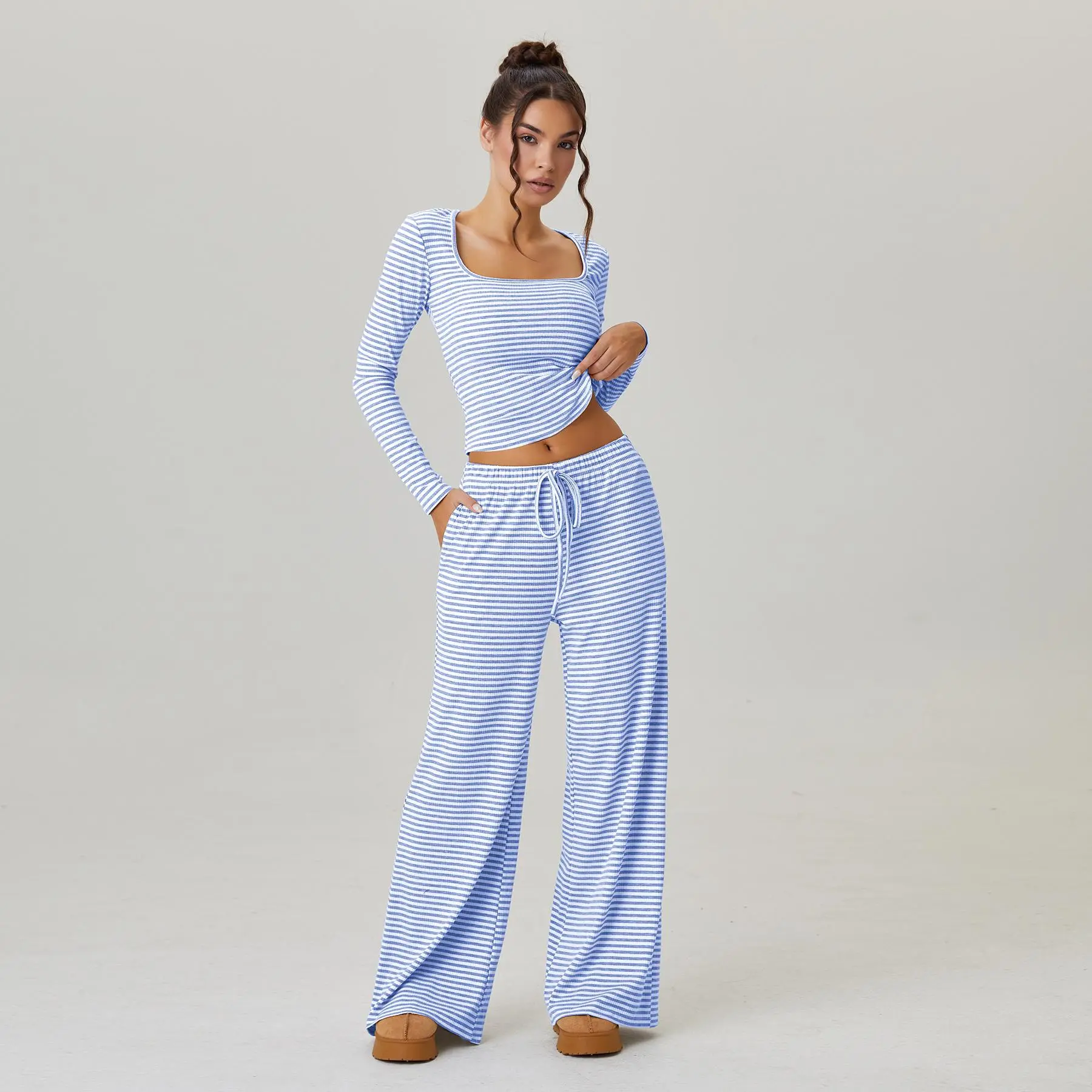 KatchMe Women's Slouchy Square Neck Stripe Long Sleeve Crop Top & Low-Rise Wide Leg Trousers Co-ord