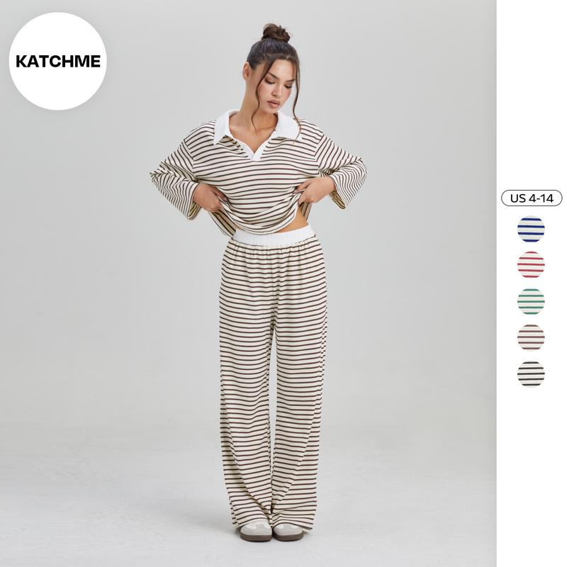 KatchMe Women's Casual Color Matching Stripe Long Sleeve Top & Wide Leg Trousers Co-ord
