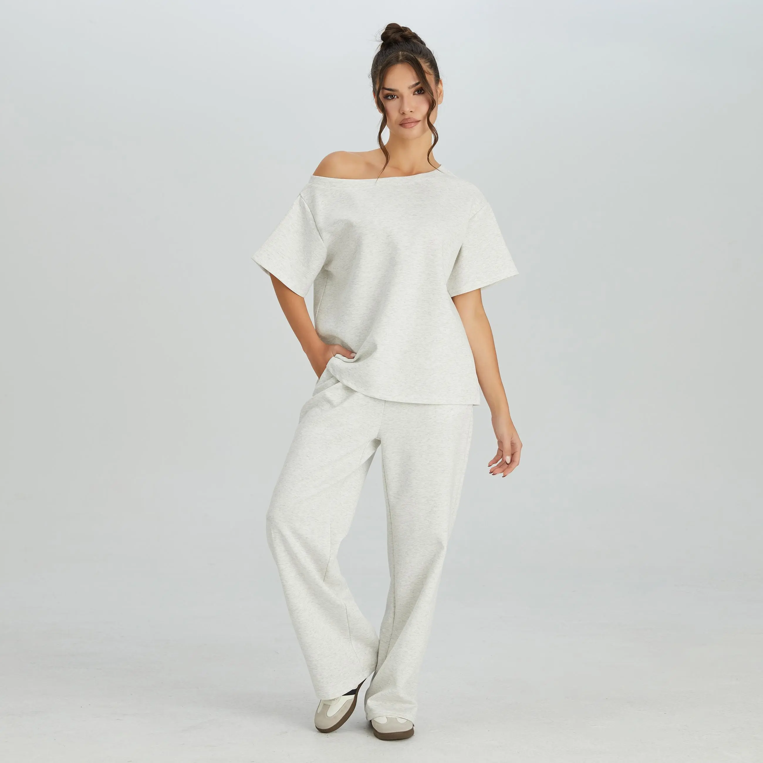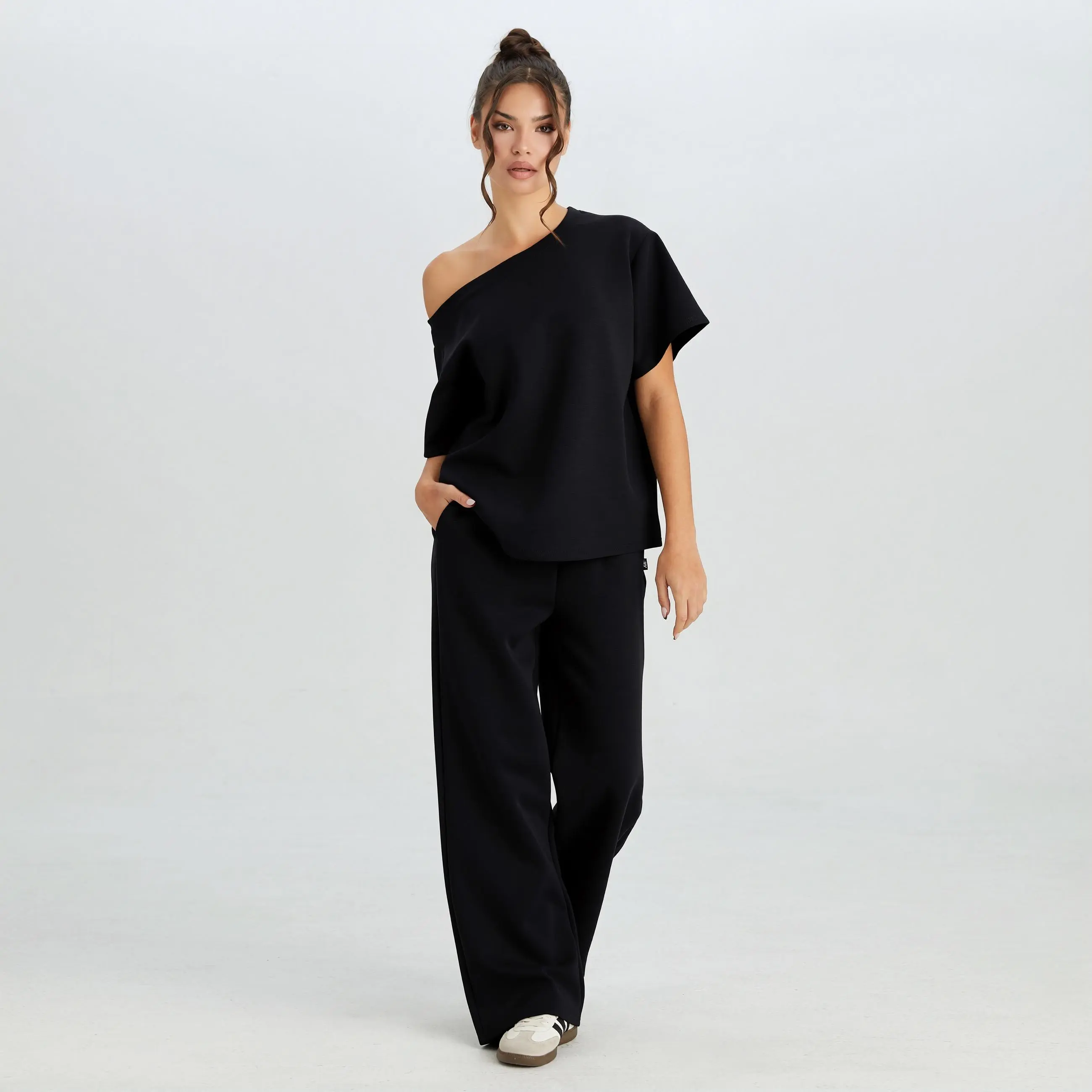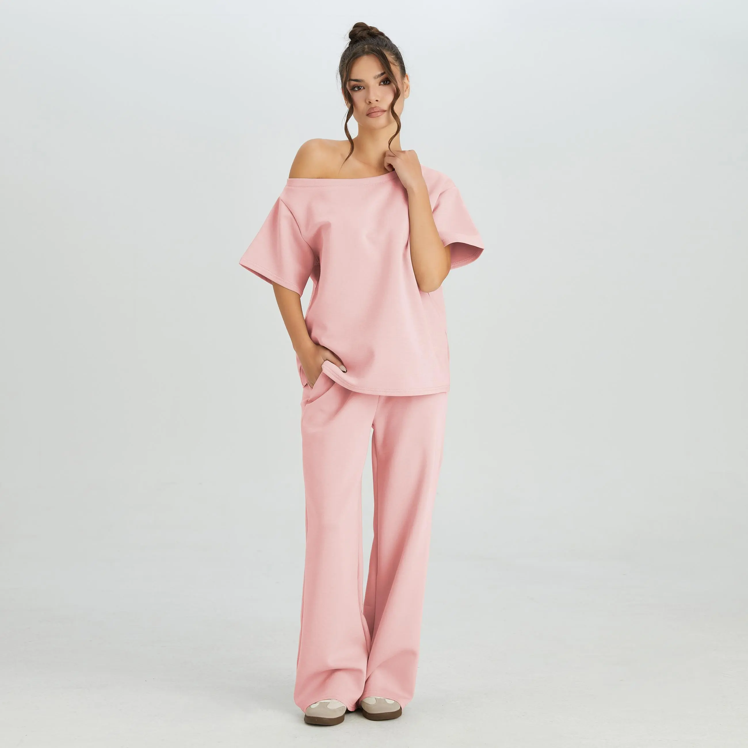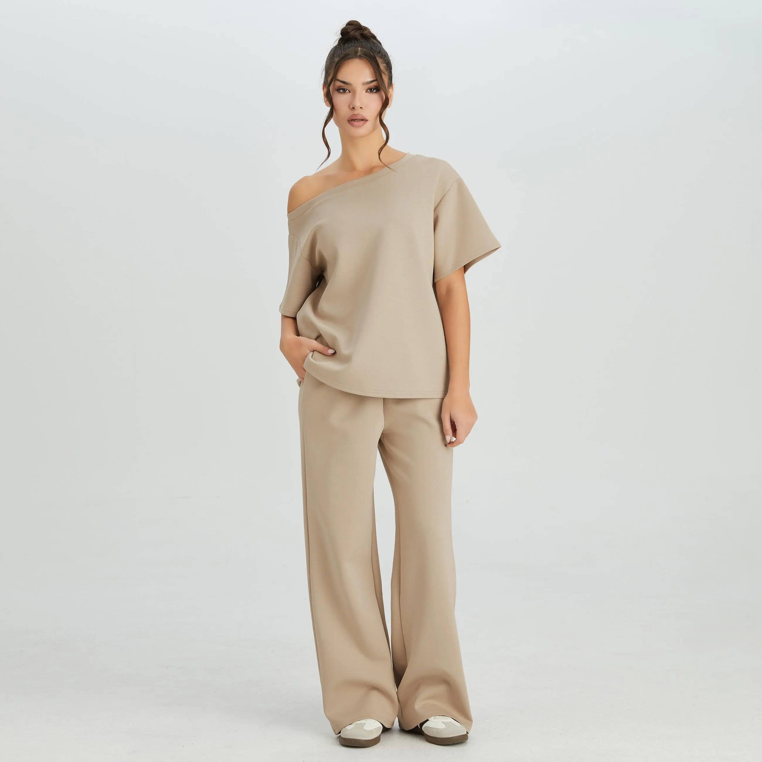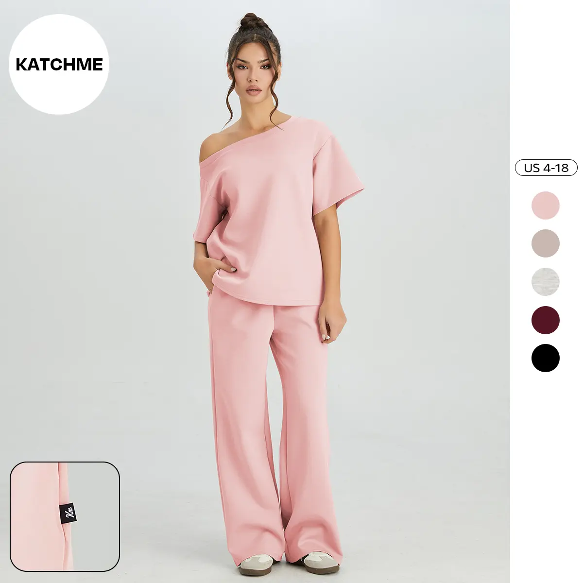 KatchMe Women's Simple Style Solid Color Sloping Shoulder Short Sleeve Top & Drawstring Waist Wide Leg Trousers Co-ord Set & Separates, Minimalist Womenswear