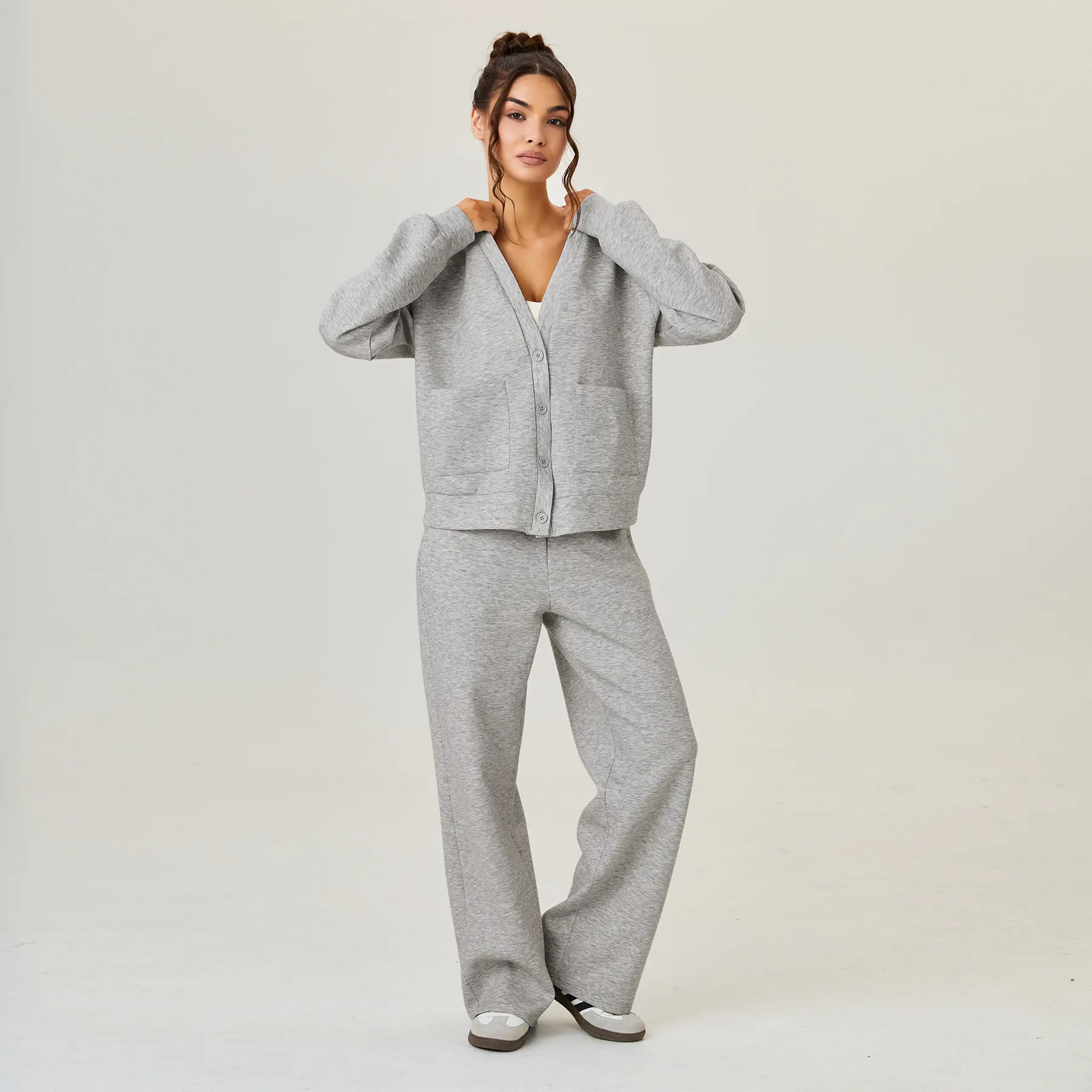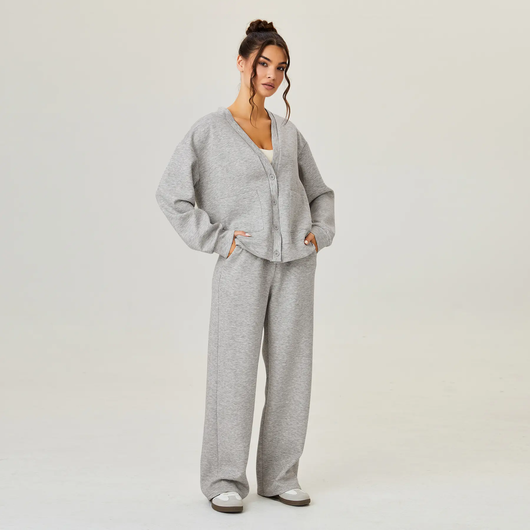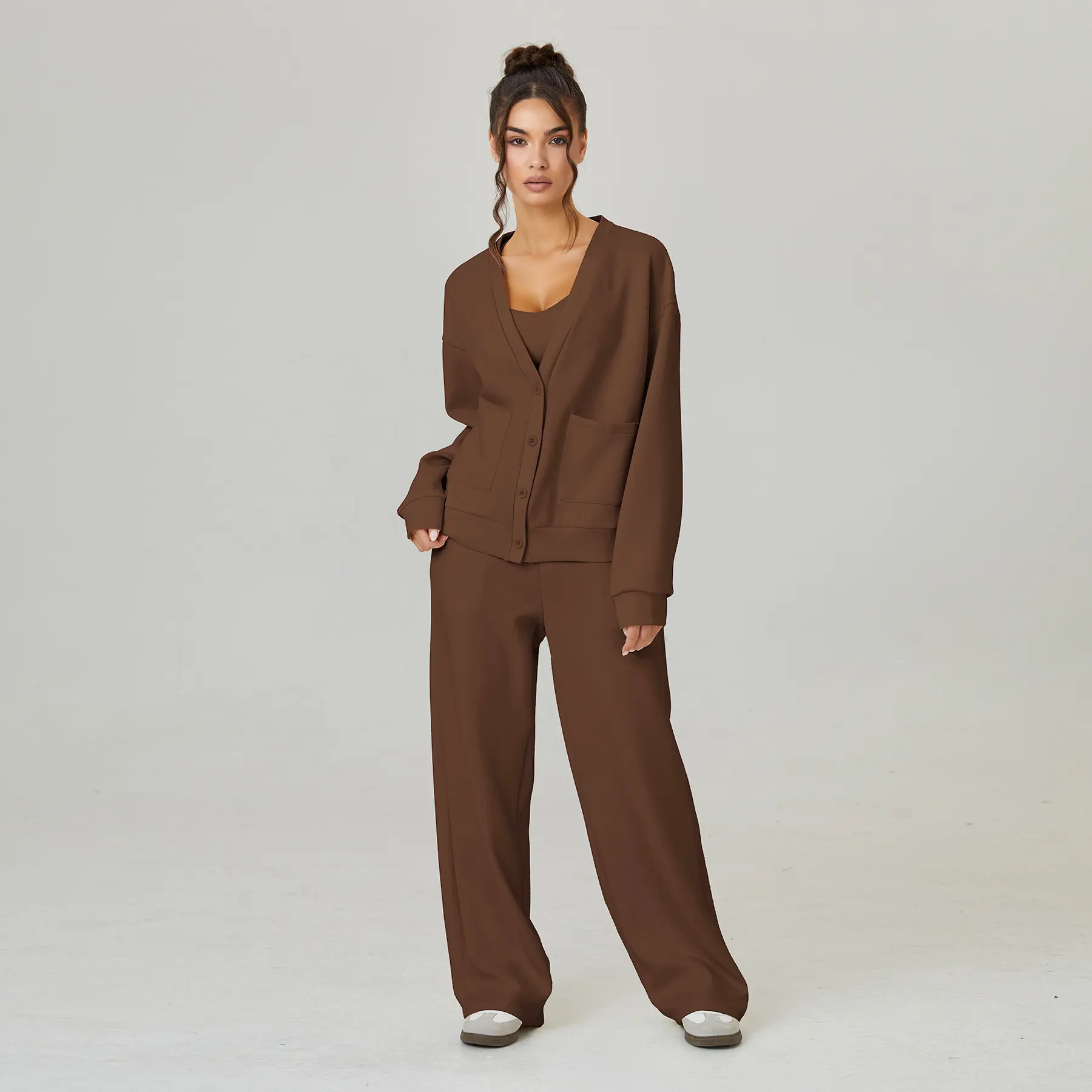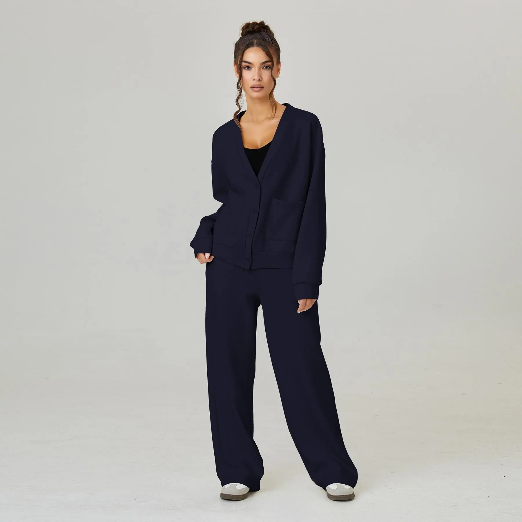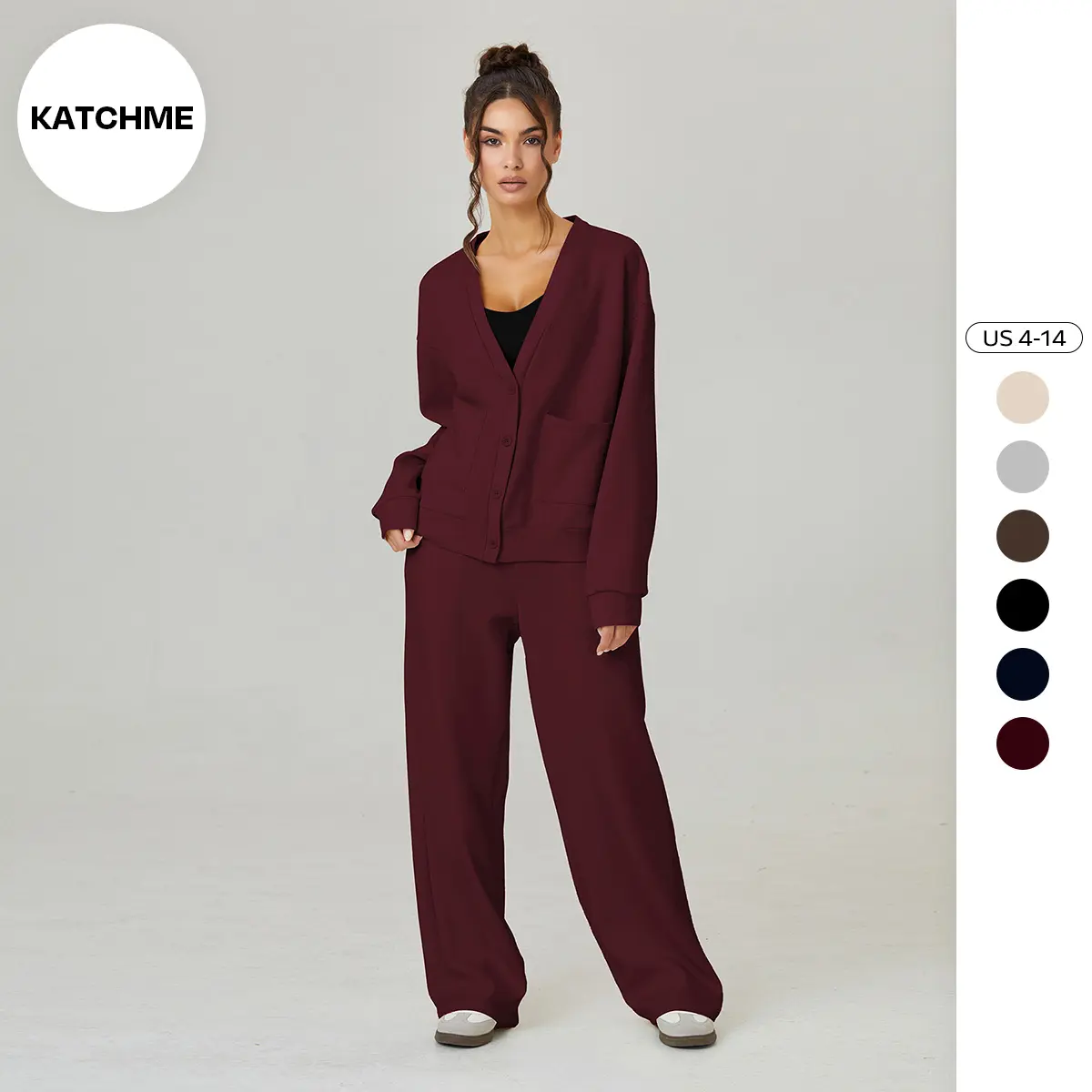 KatchMe Women's Slouchy Solid Color V Neck Long Sleeve Button Cardigan & Drawstring Waist Trousers Co-ord