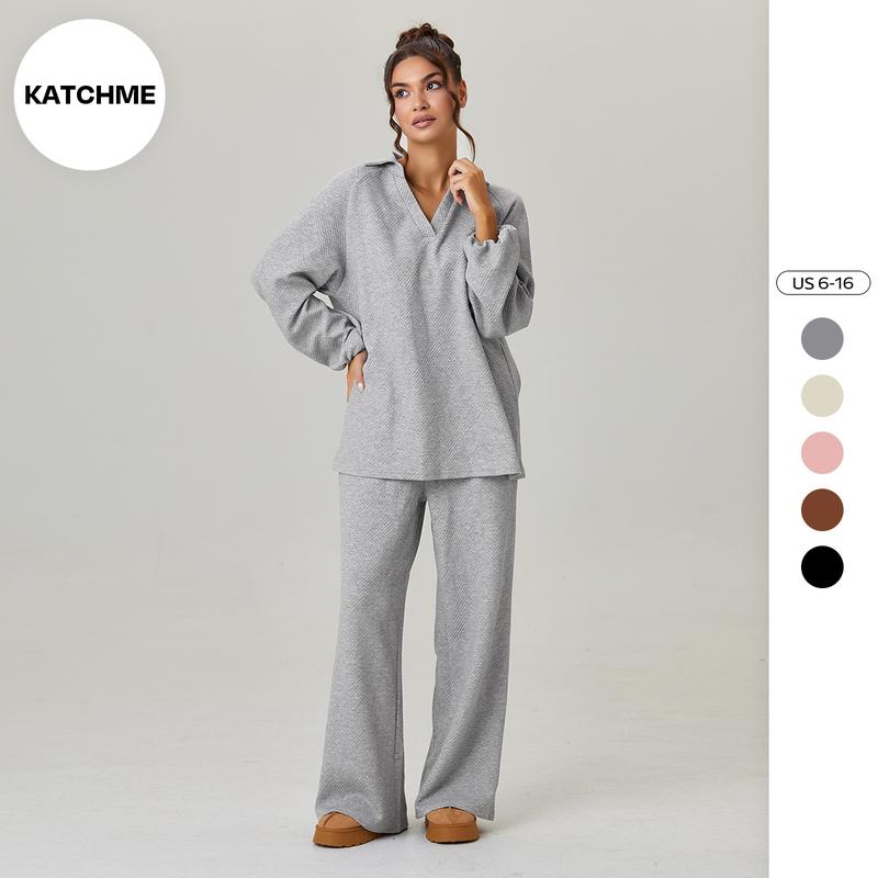 KatchMe Women's Slouchy Solid Color V-Neck Loose Textured Pullover & Drawstring Waist Trousers Co-ord