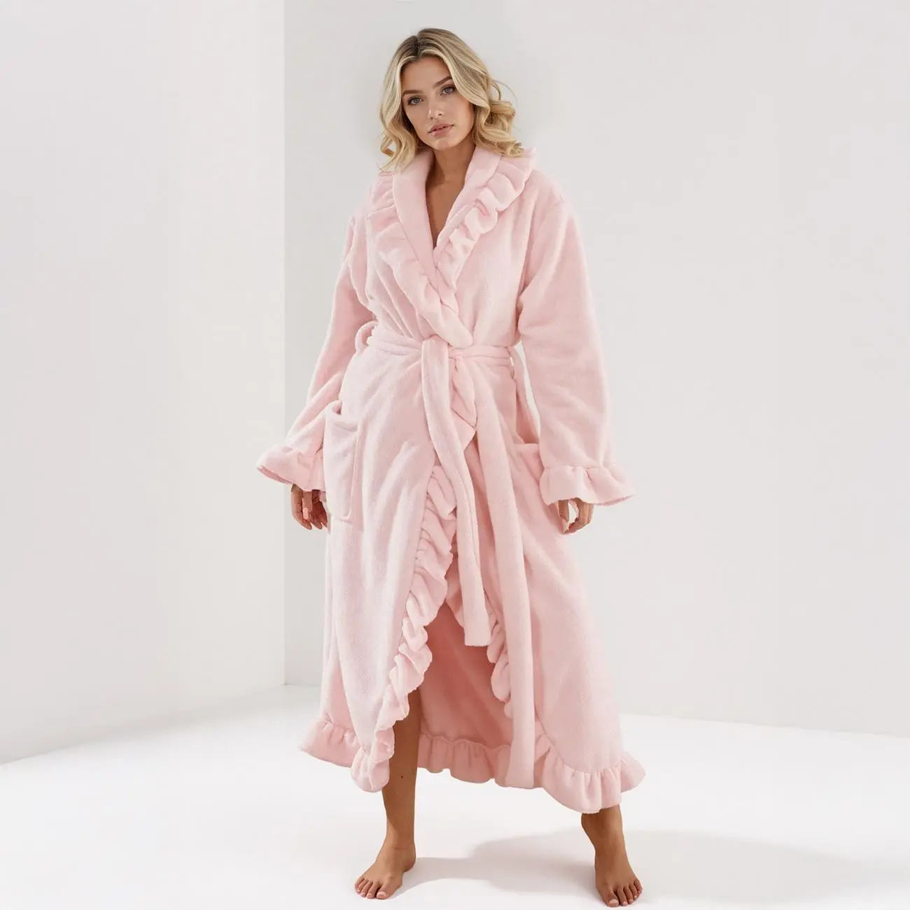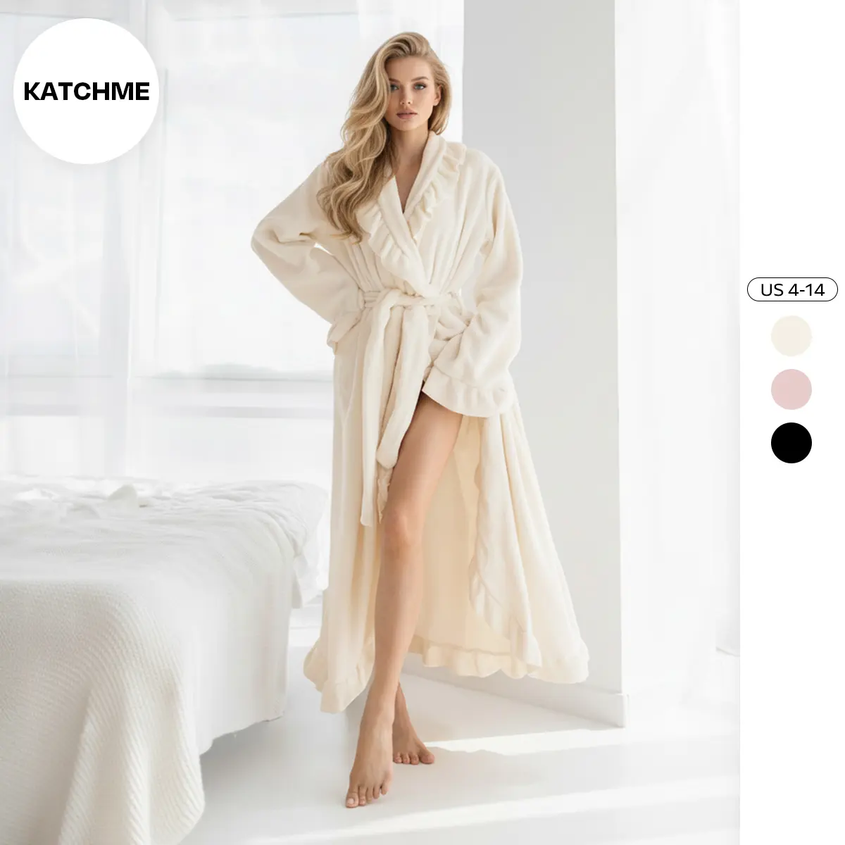 KatchMe Women's Basic Winter Thermal Solid Color Flounce Waist Tie Side Pocket Wrap Robe