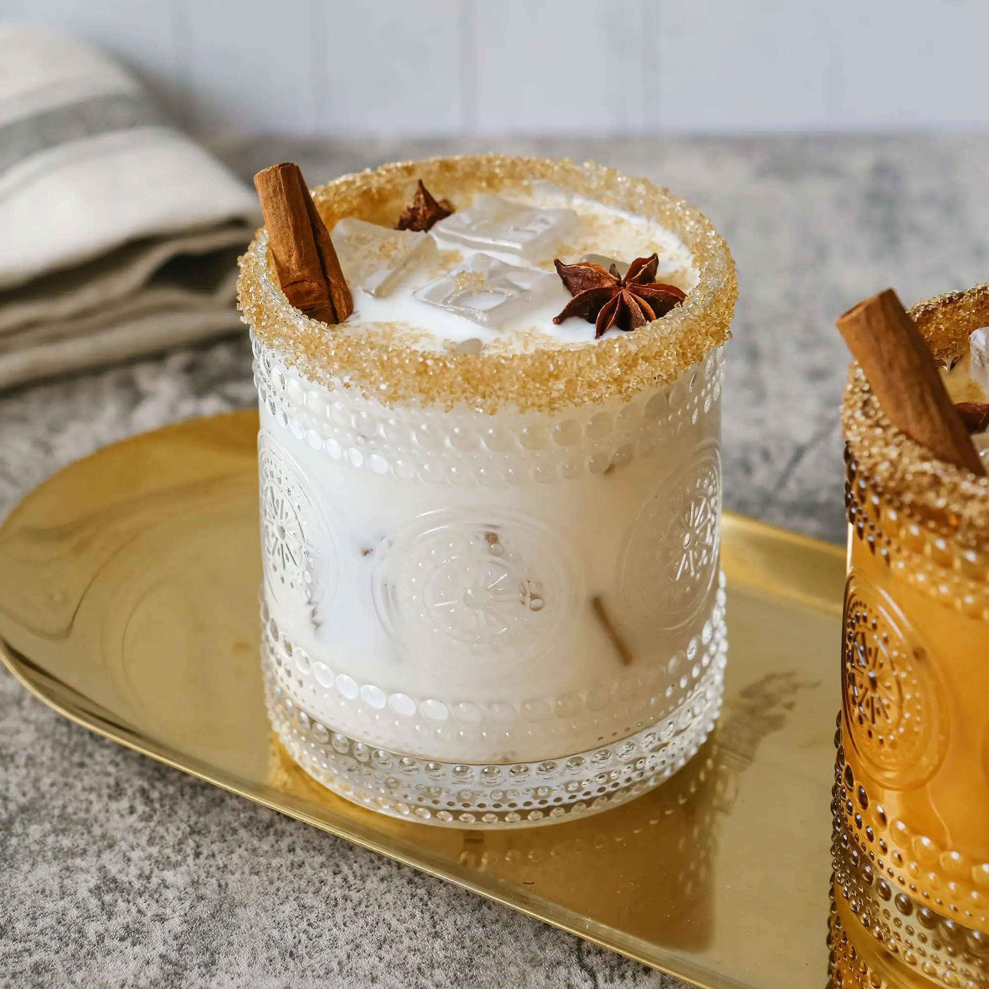 Vintage-inspired design and embossing that are long lost to bring you a glass that you will be proud to serve your guest with! They will elevate every cocktail or signature mocktail. They look great on a bar cart or with exposed cupboards. Great for floating shelves or behind your favorite bar.