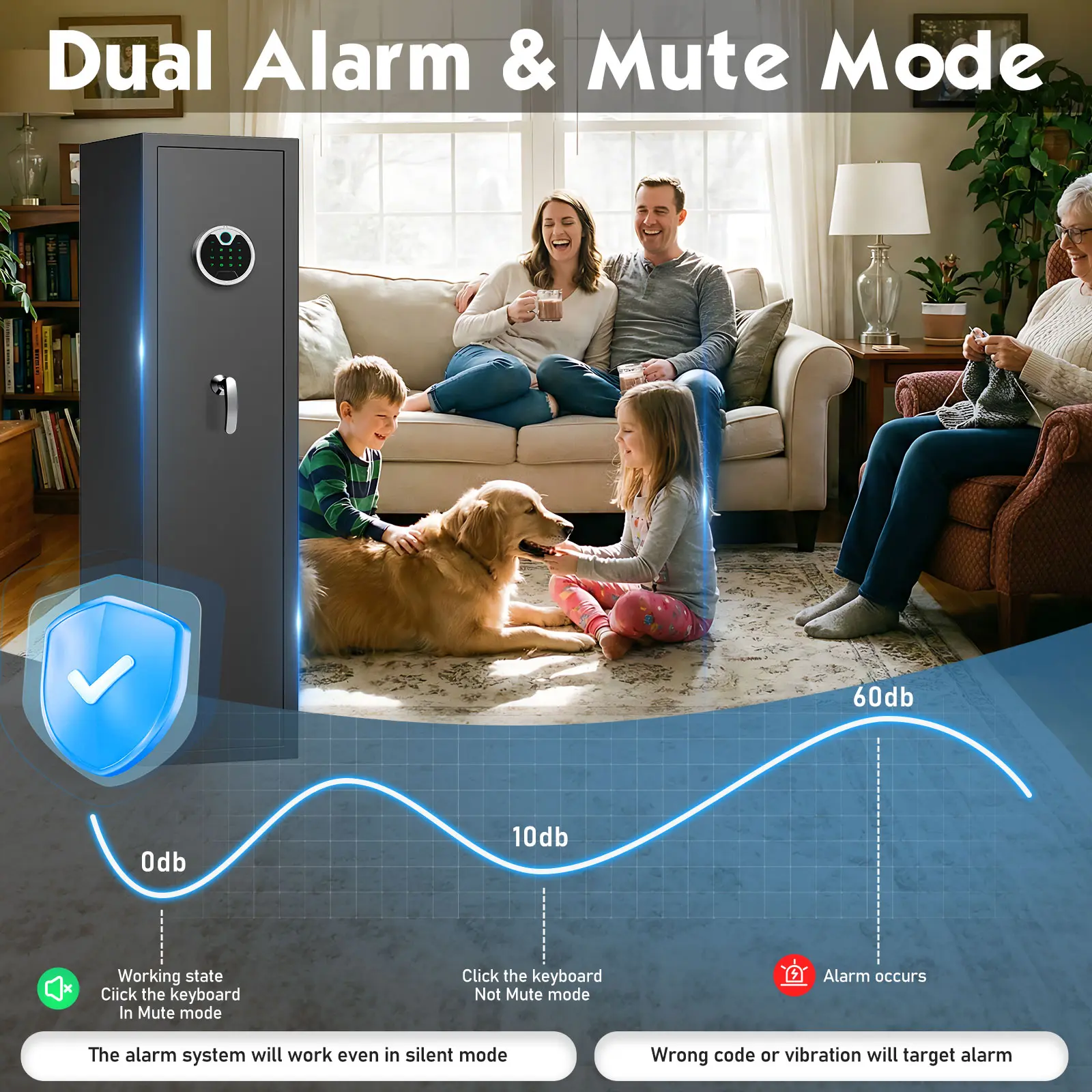 【Dual Alarm System and Mute Function】After 3 consecutive wrong fingerprint or 5 consecutive wrong code, the alarm above 70 decibels will last for 60 seconds. Besides, if the safe is moved violently, a vibration alarm will be triggered. You can unlock the door by entering your password or fingerprint to cancel the alarm. Additionally, you can set the silent mode, which can increase the invisibility to protect privacy and avoid disturbing others and in case of danger, you can reach for the things more safely.