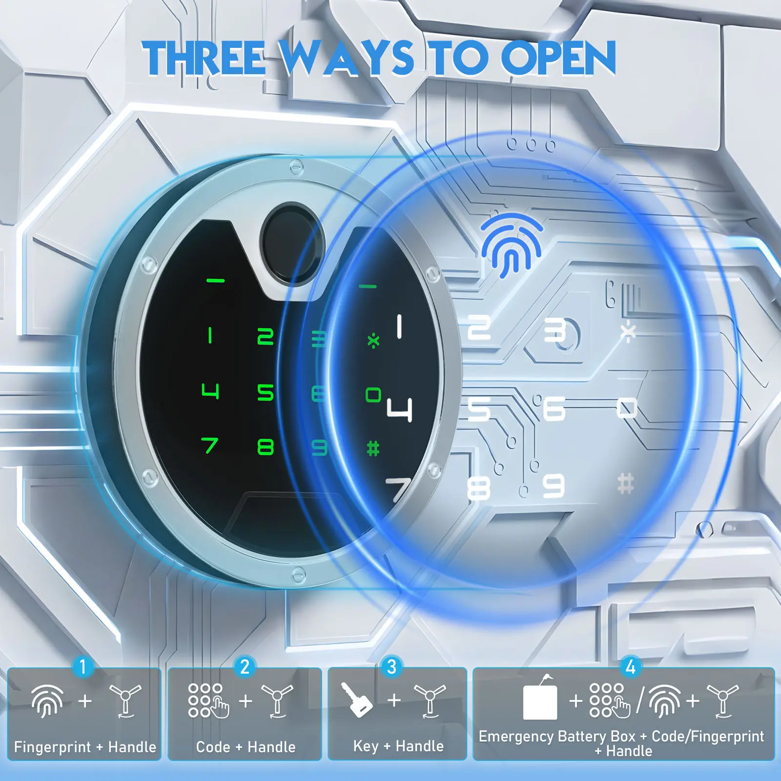 【4 Ways to Open the Door】There are 4 ways to open the door, 1. Fingerprint + Handle (Daily Use) 2. Code + Handle (Daily Use) 3. Emergency Key + Handle (First opening, forget the code or the batteries drain) 4. Emergency battry box + Code/Fingerprint + Handle (Batteries drain)