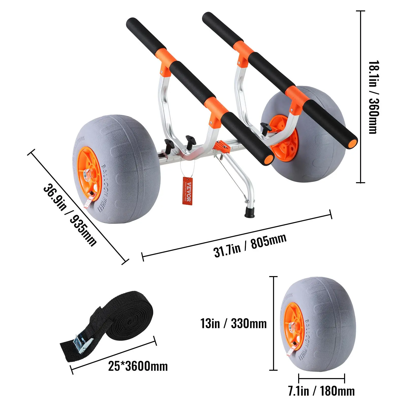 • 12'' Tires: Our kayak cart is equipped with 12'' rubber tires. The large-sized wheels with the high-efficient bearings can better absorb shock and pass through obstacle sections, making the cart suitable for more terrain, including grasslands, sand beaches, etc.