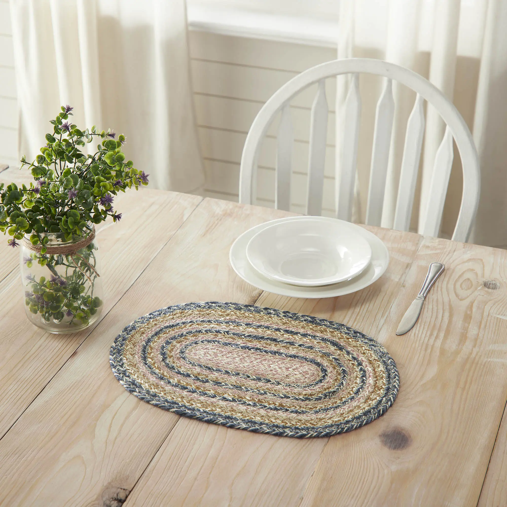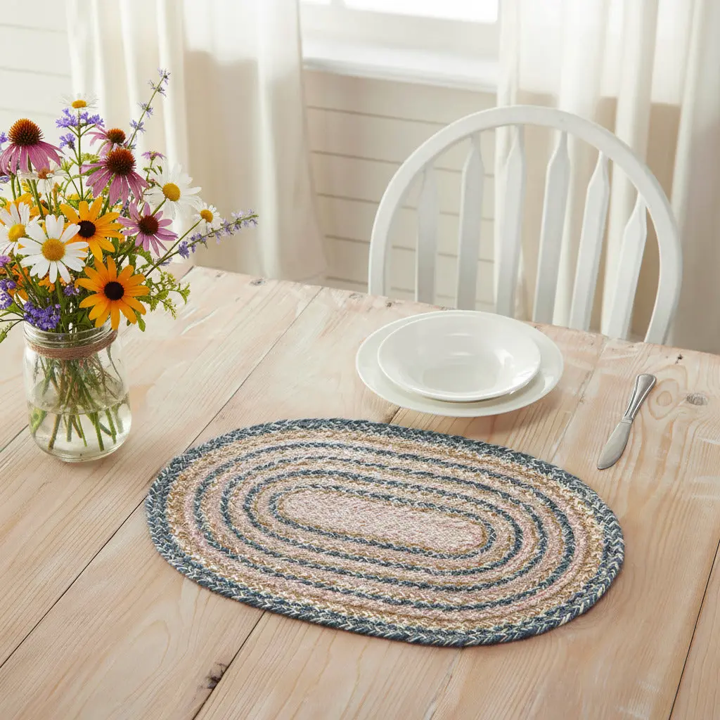 Add that cozy, farmhouse feel to your tabletop with our Kayley Braided Placemat. This rustic table placemat is the perfect feature for your kitchen or dining room table. The homemade feel comes to life with the woven braided jute wool blend fabrics in navy, dusty rose, creme and golden tan displayed in concentric fashion. It's perfect for any time of the year and can also be used as the foundation for a magical display in any room where you want that rustic farmhouse feel. Sold individually.