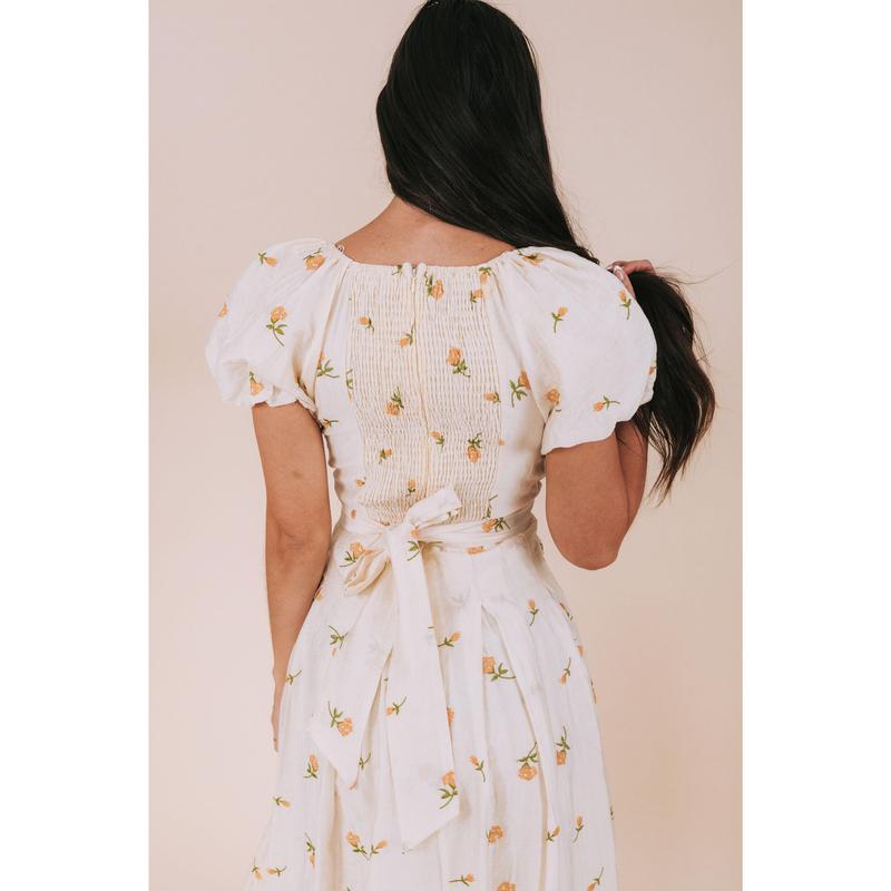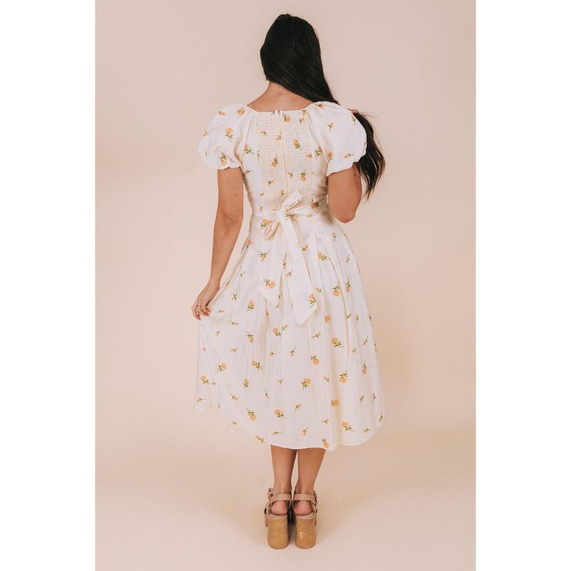Live life to the fullest in our Keep Life Simple Dress. This ivory colored dress features beautiful embroidered flowers and a pleated skirt for a feminine touch. Short puff sleeves and a smocked panel in the back offer comfort and flexibility. The V neckline and tied bow in the back add a charming detail to this midi length dress.