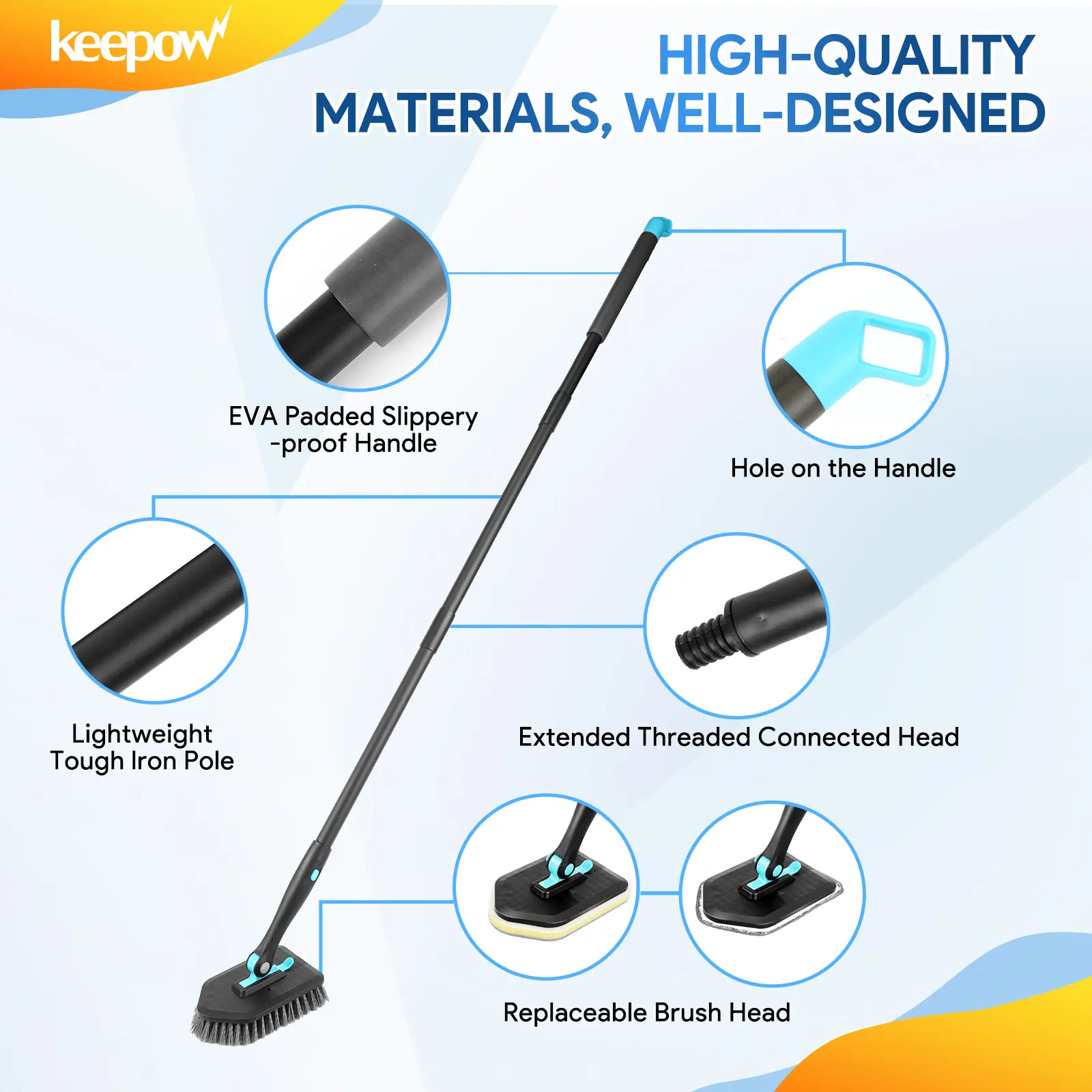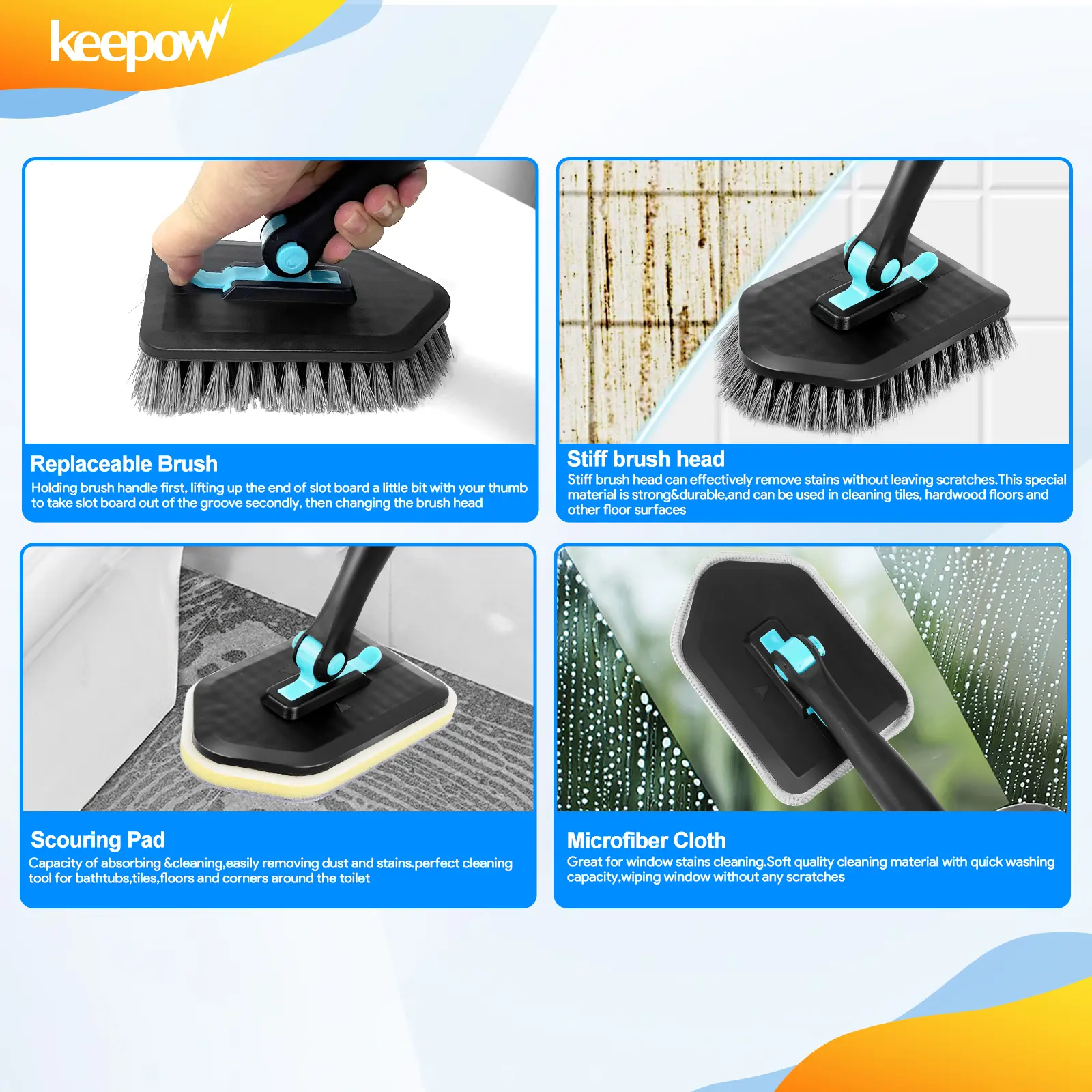 【3-in-1 Removable Brush Head】 3-in-1 tub shower scrubber for cleaning has three different high-quality cleaning heads - bristle brush, sponge and microfiber pad. The hard bristle brush is suitable for stubborn dirt cleaning on floor tiles, and the sponge head has super absorption capacity, which can be used to clean the stains on finer surfaces; the microfiber pad is made of soft material, which is very suitable for cleaning glass, walls and other surfaces.