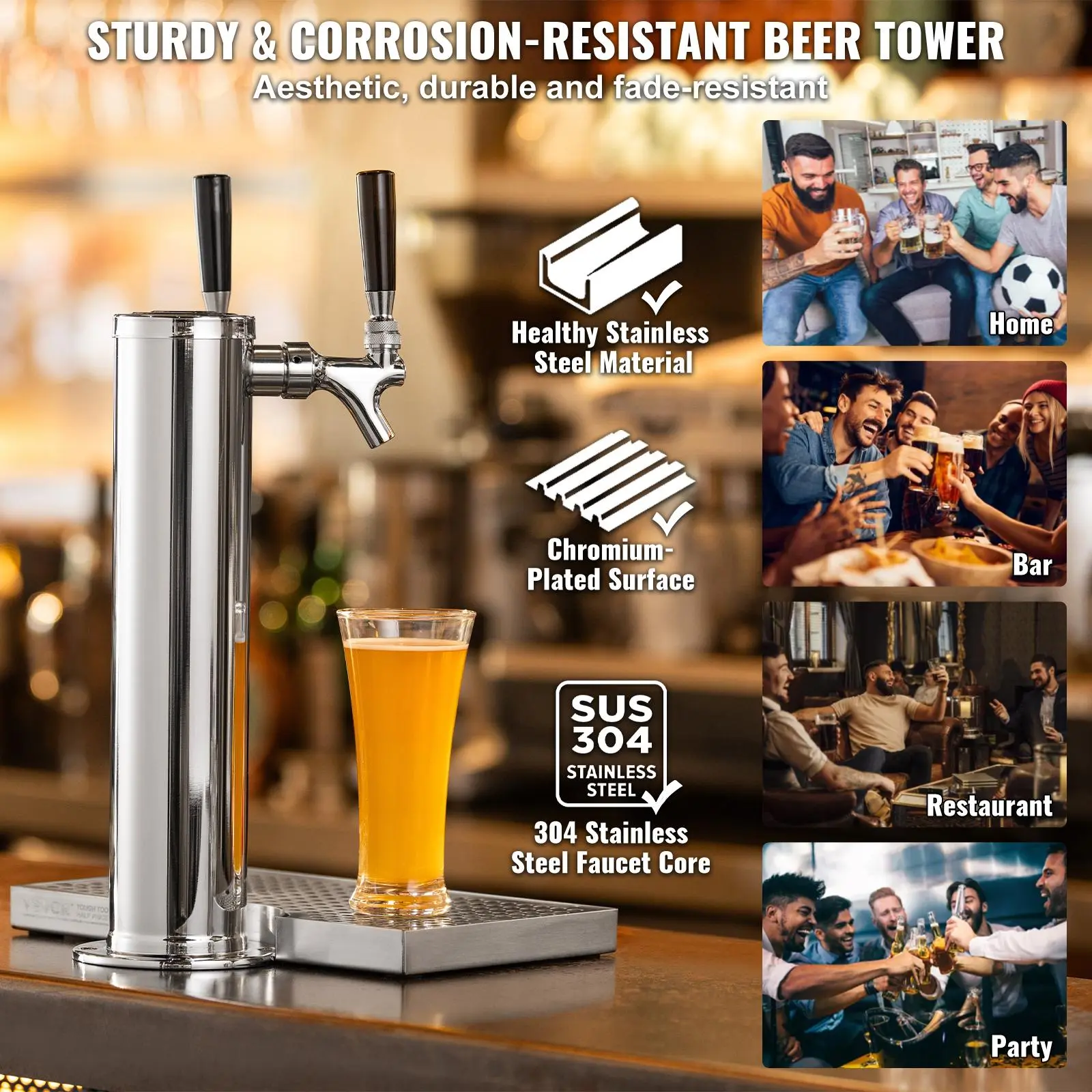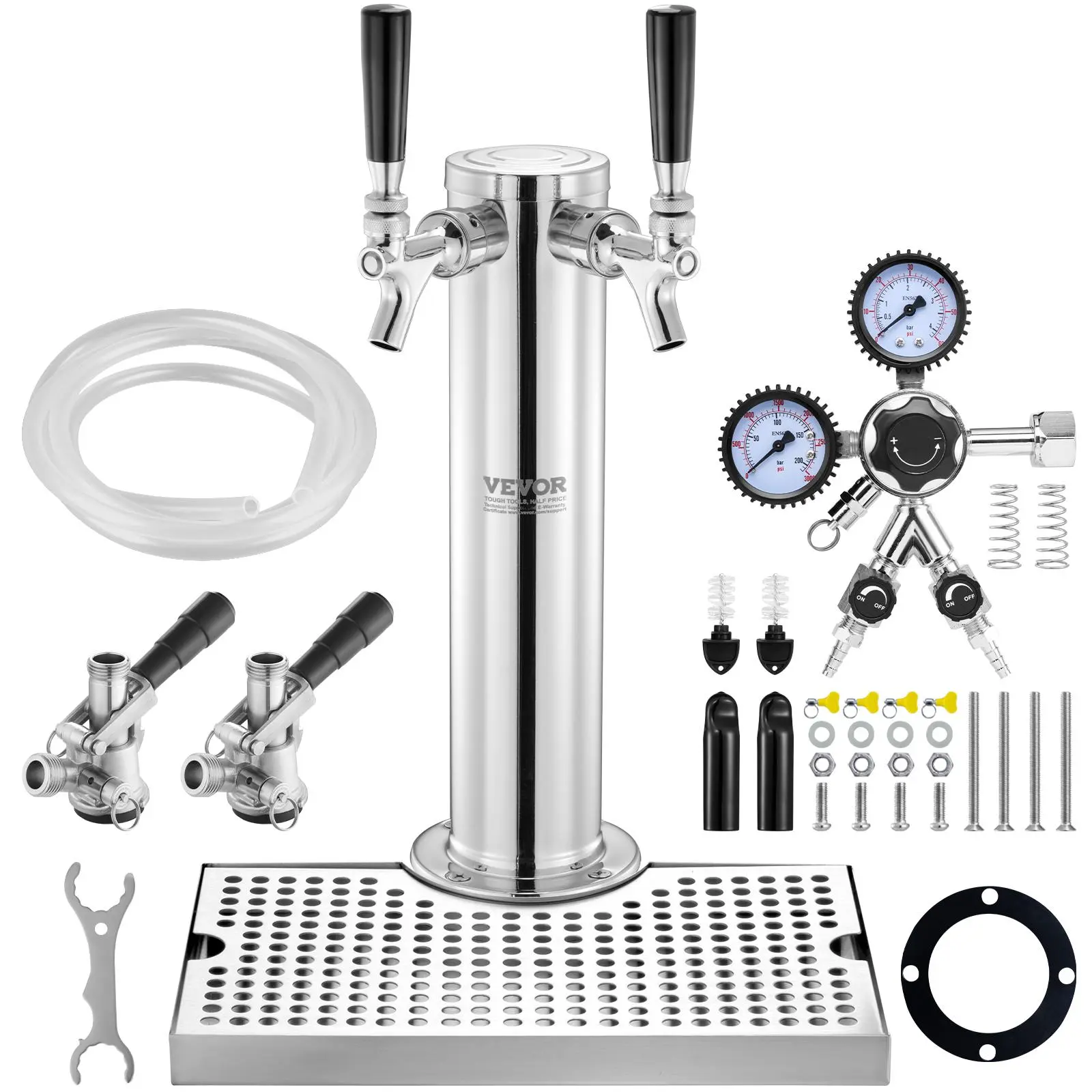 ·Dual Faucets Beer Tower: Crafted from premium 304 stainless steel, the VEVOR dual tap beer tower offers exceptional durability and reliability, ideal for both commercial and home kegerators. This kegerator tower kit includes 2PCS 5ft beer tubing, 2 D-system keg couplers, 1 dual-gauge CGA320 regulator, 2 tap wrenches, 2 cleaning brushes, 2 faucet covers,1 beer drip tray, and a set of assembly accessories.