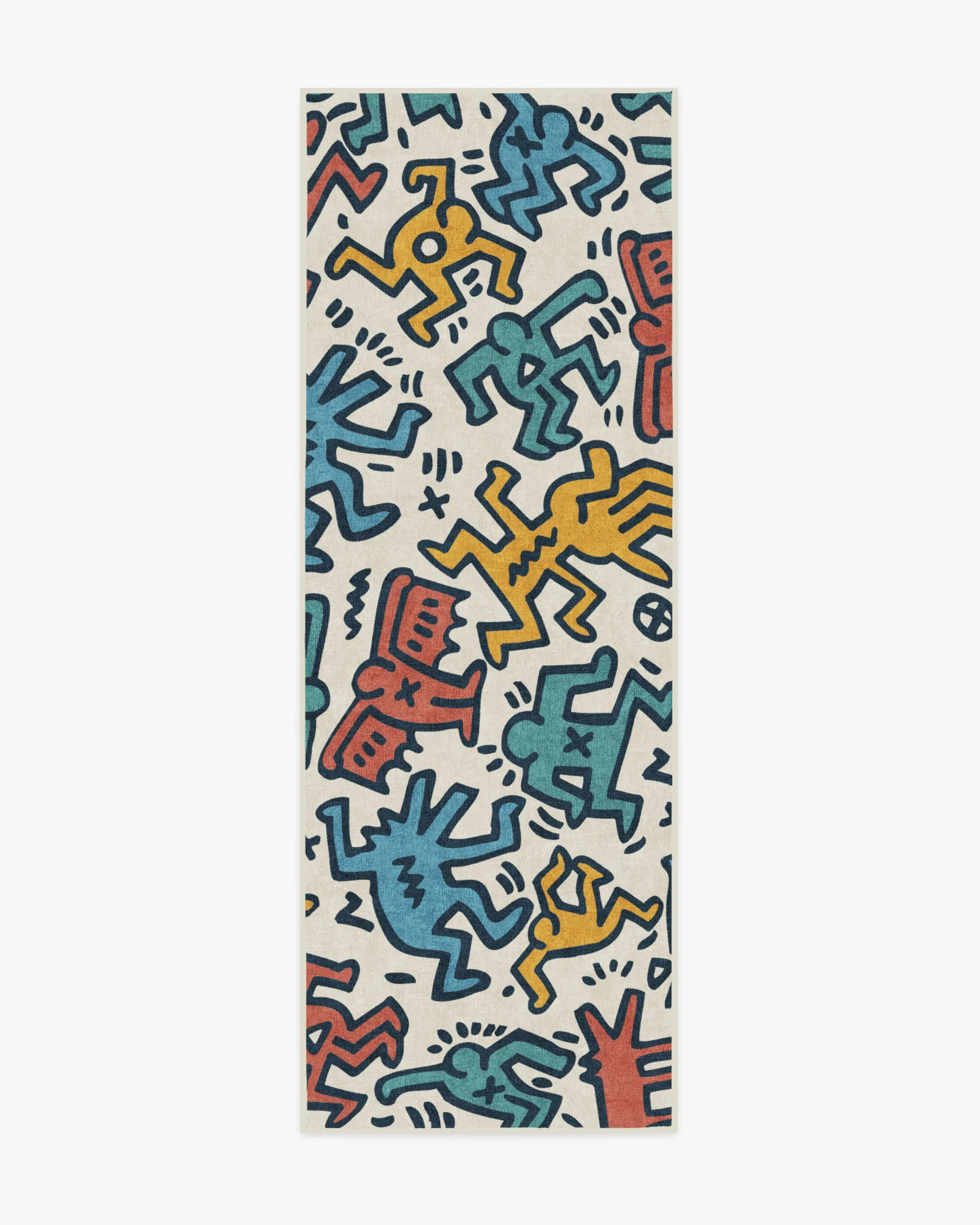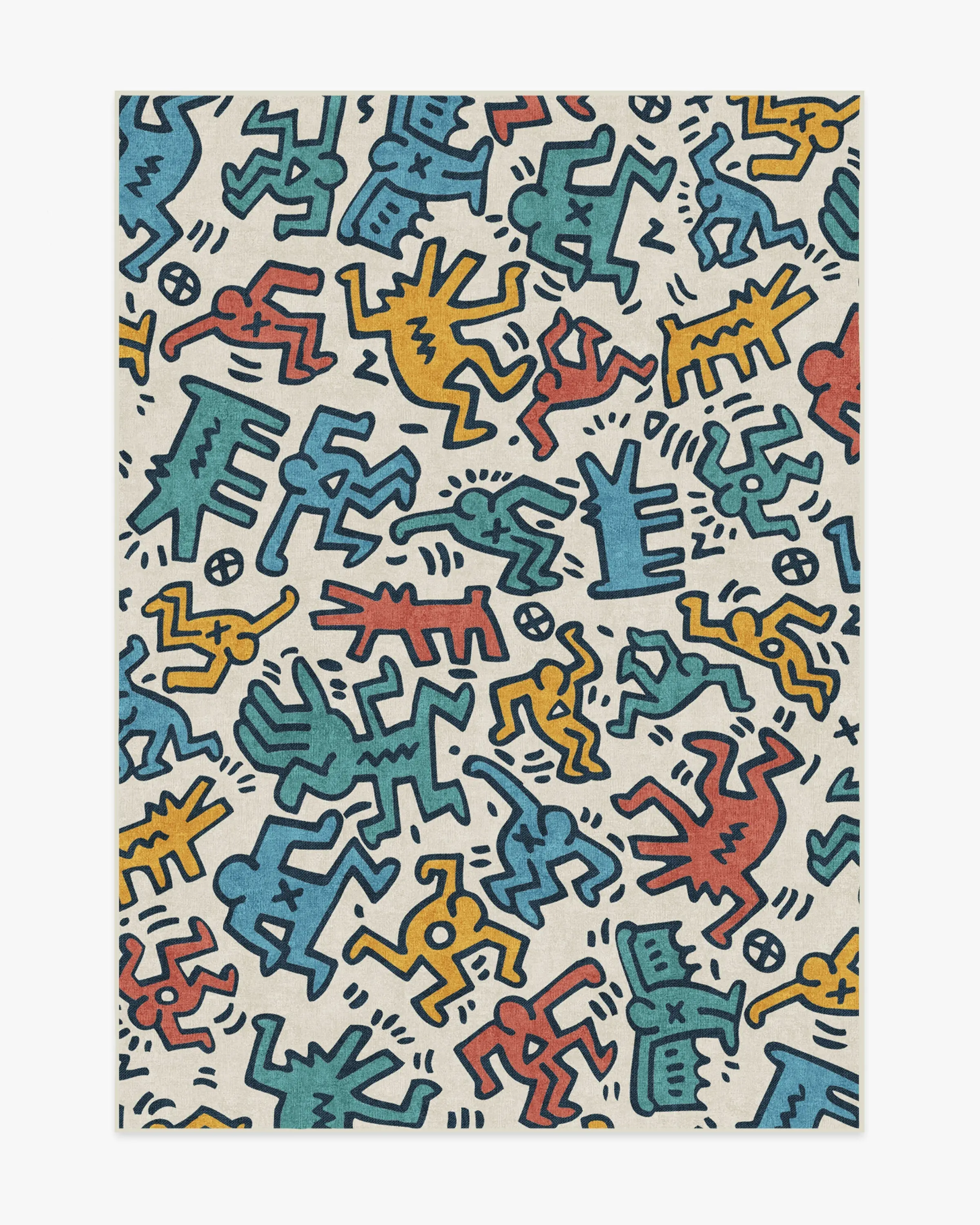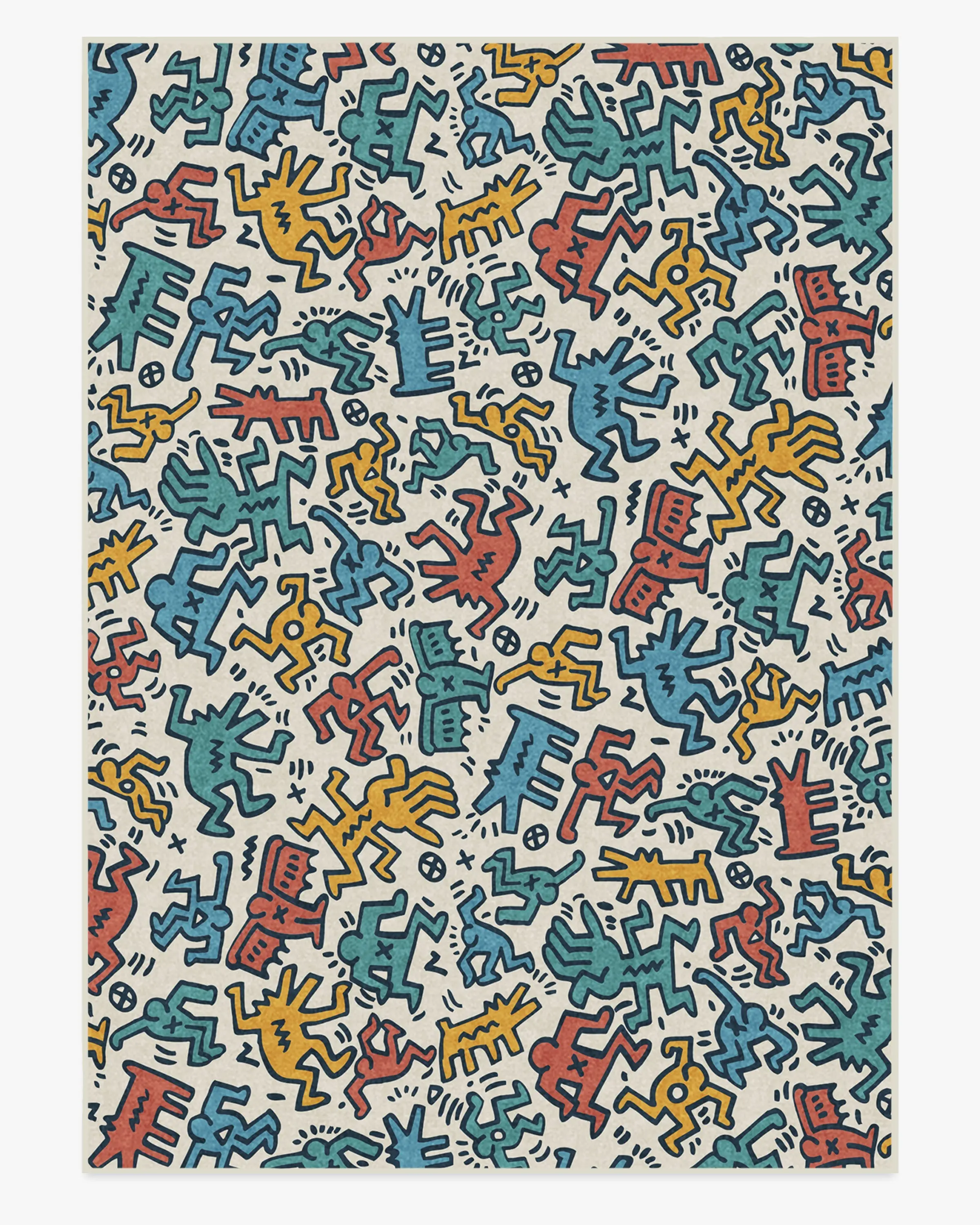A colorful and artistic design. The bright palette of our Keith Haring Block Party Multicolor Rug matches the level of high-energy movement that Haring's work embodies. This is accomplished with vivid yellow, turquoise, navy blue, brick red, and dark aqua blue on an ivory background. Water-resistant, stain-resistant, and machine-washable.