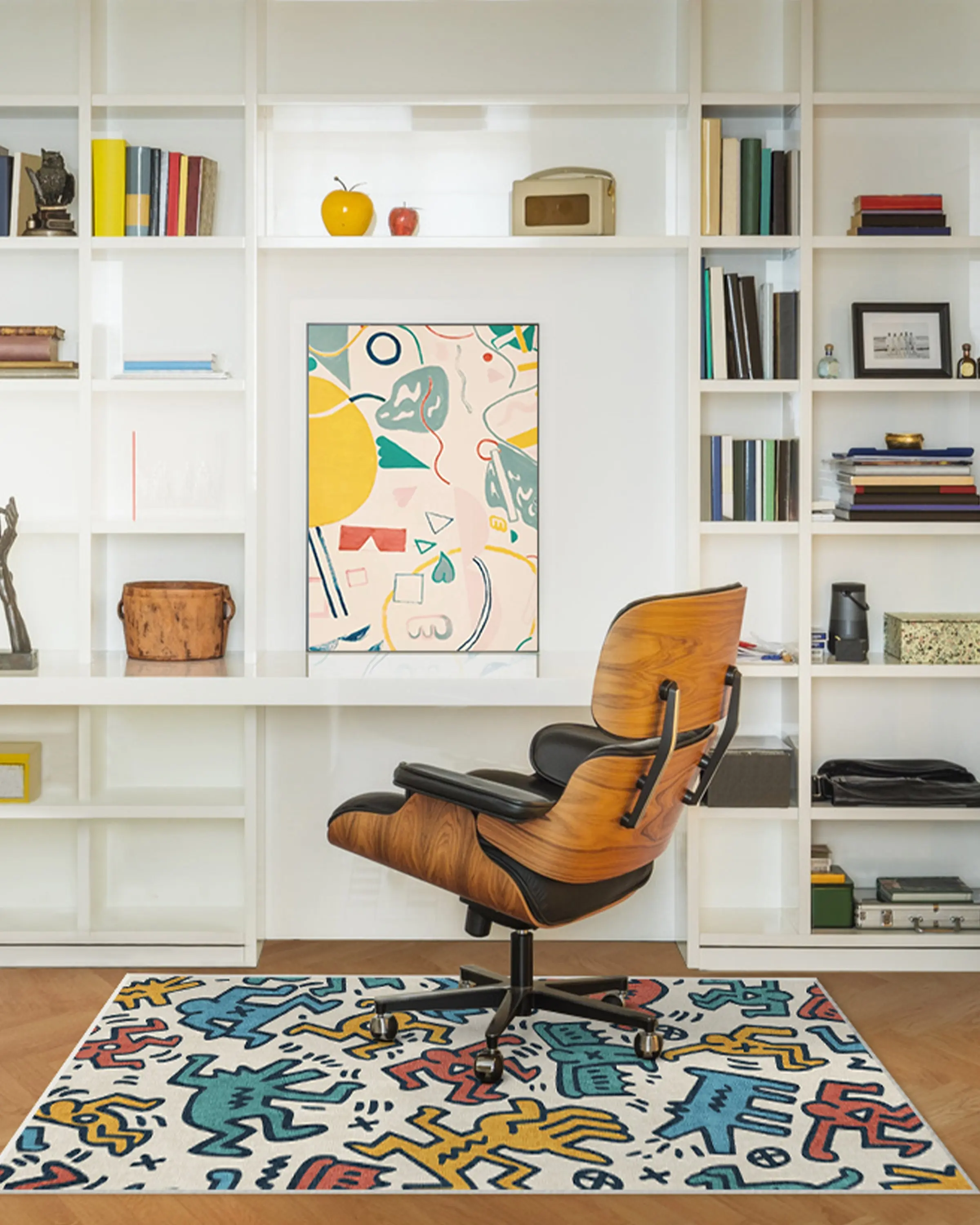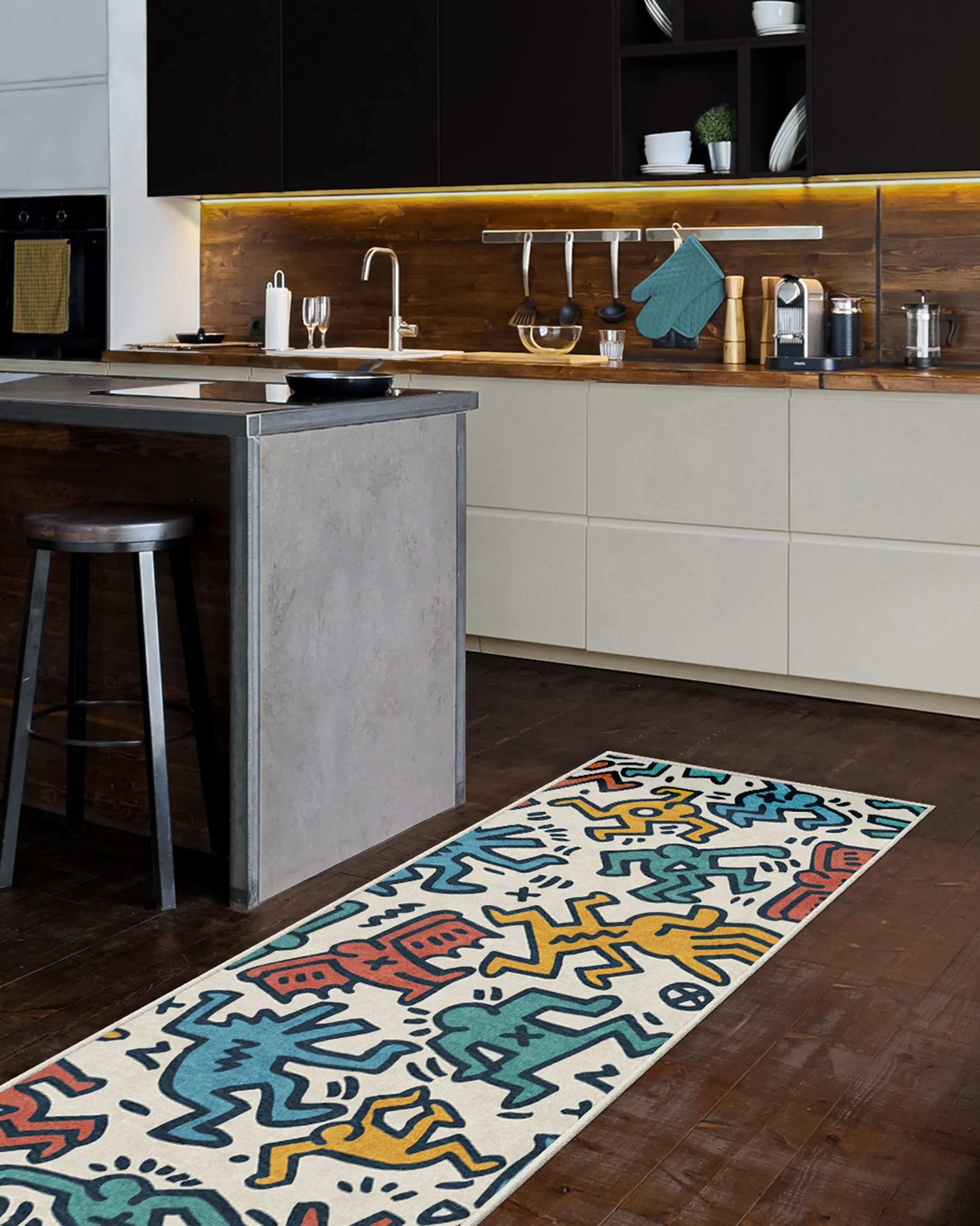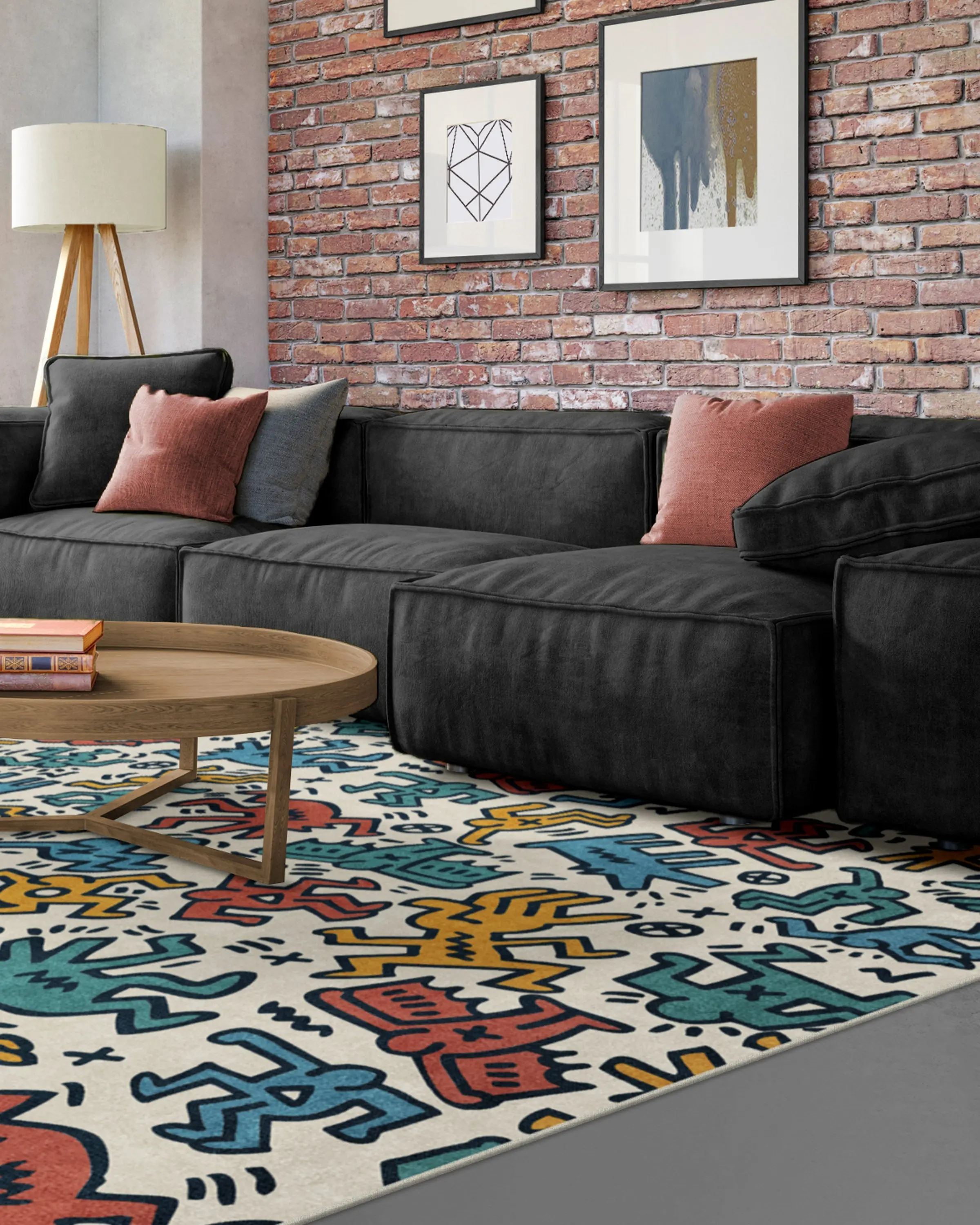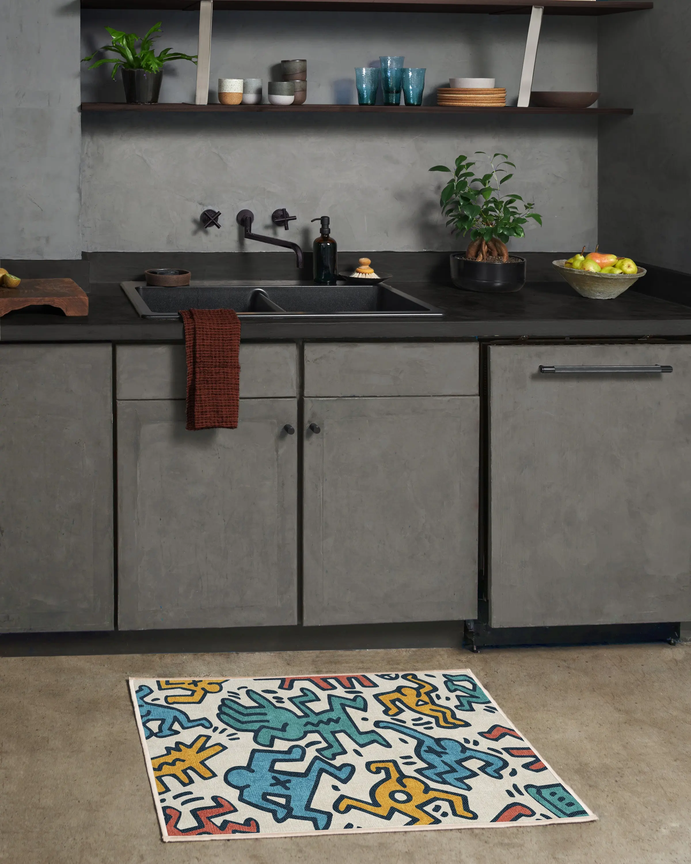 A colorful and artistic design. The bright palette of our Keith Haring Block Party Multicolor Rug matches the level of high-energy movement that Haring's work embodies. This is accomplished with vivid yellow, turquoise, navy blue, brick red, and dark aqua blue on an ivory background. Water-resistant, stain-resistant, and machine-washable.