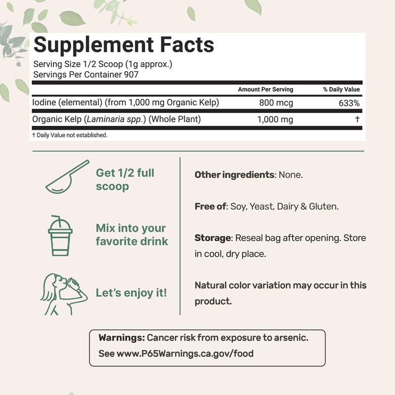 Β·Each pouch contains 2 pounds of pure kelp powder, Β½ scoop per serving, delivers approx. 1g of organic kelp powder, lasts up to 907 servings.Β Β