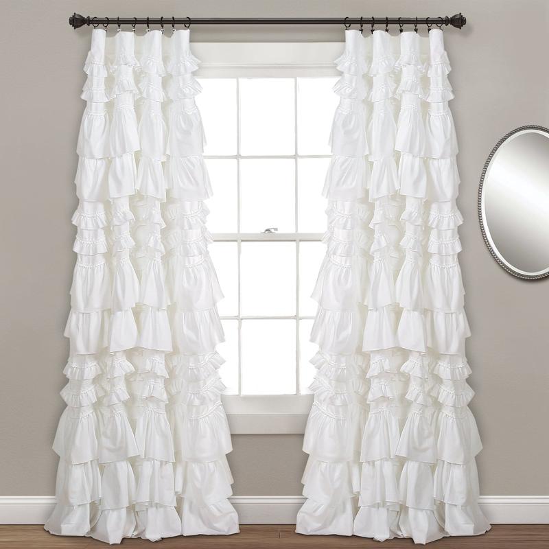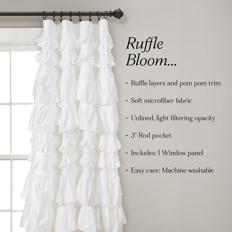 ⨠The Kemmy Window Curtain Panel combines class, style, and beauty. Elegantly layered ruffles and 3-D pom poms add texture. Perfect for any age, from a baby's nursery to a great-grandmother's home. Sold as a single panel, it measures 52 inches wide and comes in 63, 84, or 95 inches length. Choose from white, ivory, or peachy pink. đ