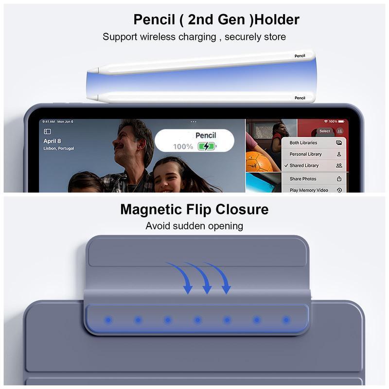 Crafted with a tough hard shell and soft TPU edges, this case guards your iPad against everyday bumps and scratches. The magnetic precision adsorption ensures your tablet stays securely attached, and the magnetic flip closure keeps the cover from popping open unexpectedly. Auto wake/sleep functionality adds extra convenience, saving your battery life when you're not using your device.