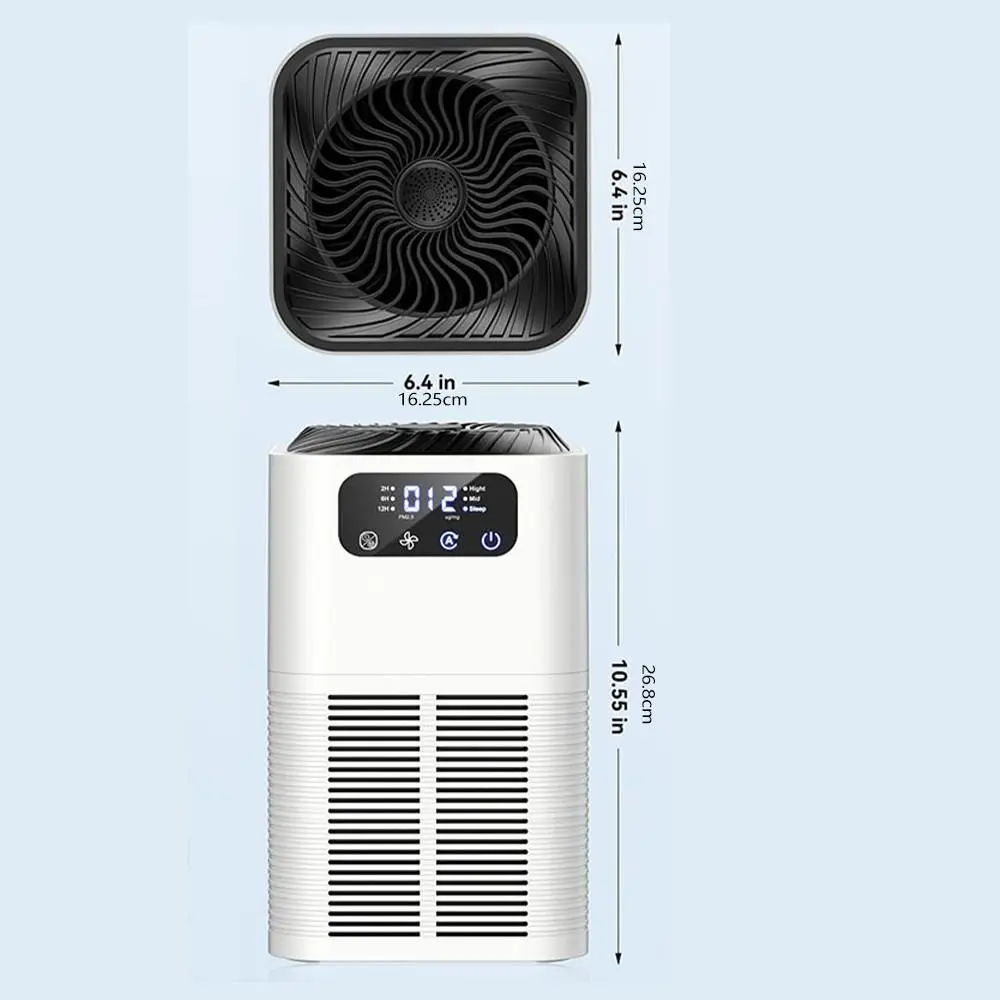 ·Aromatherapy Function & Modern Compact Design Includes an aromatherapy pad on top—add 4–5 drops of essential oil to diffuse fragrance throughout the room during the 360° purification cycle. Compact modern design (6.35" × 6.35" × 10.45") fits living rooms, bedrooms, kitchens, offices, and basements.