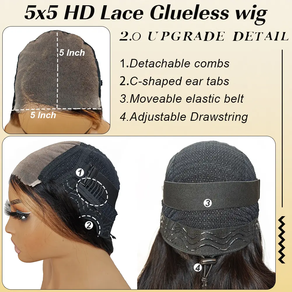 • No Glue Needed: Easy application and removal. • Pre-Plucked & Pre-Cut: Ready-to-wear design. • 5x5 HD Lace Closure: Enhances natural hairline. • Body Wave Style: Adds volume and texture. • 180% Density: Ensures a fuller appearance.