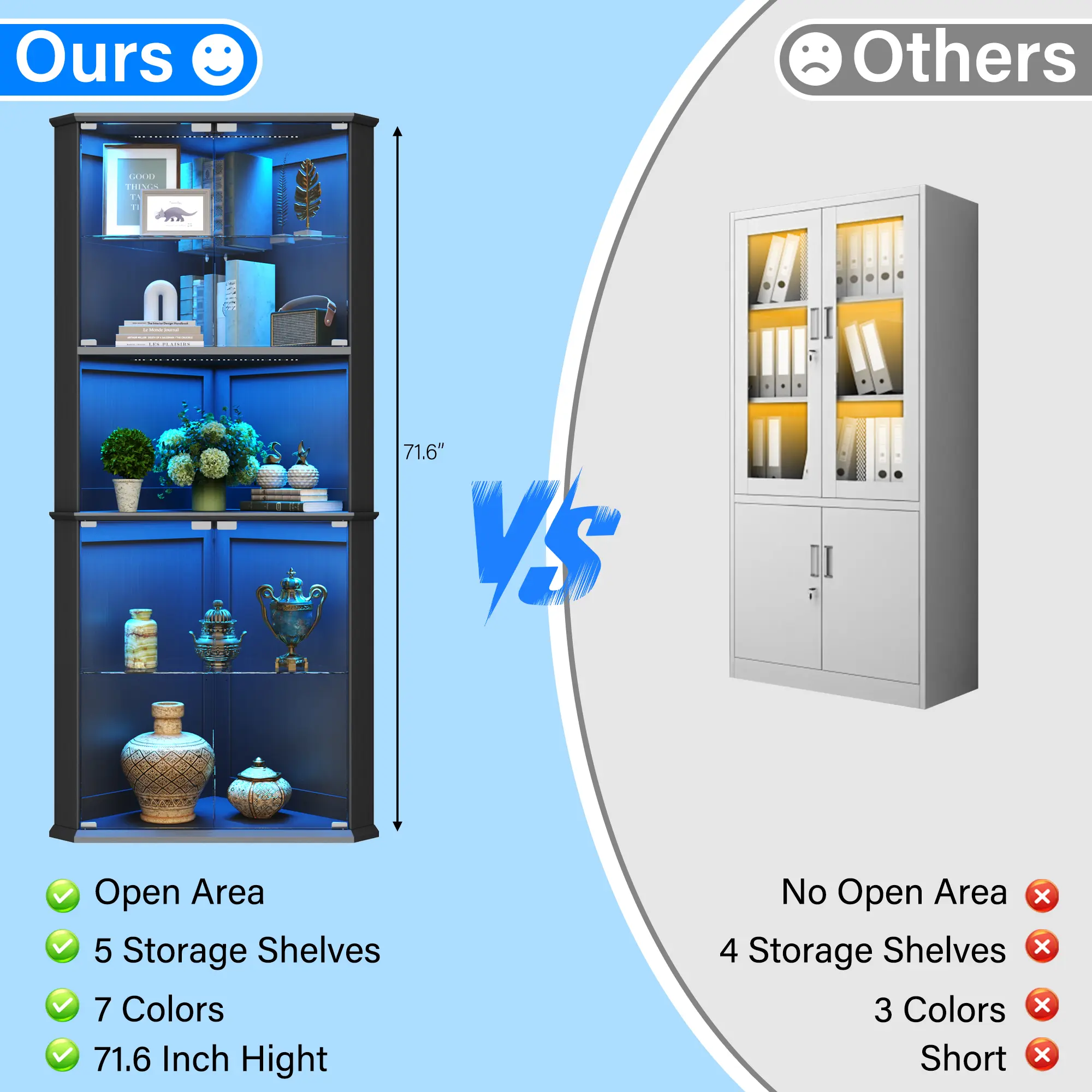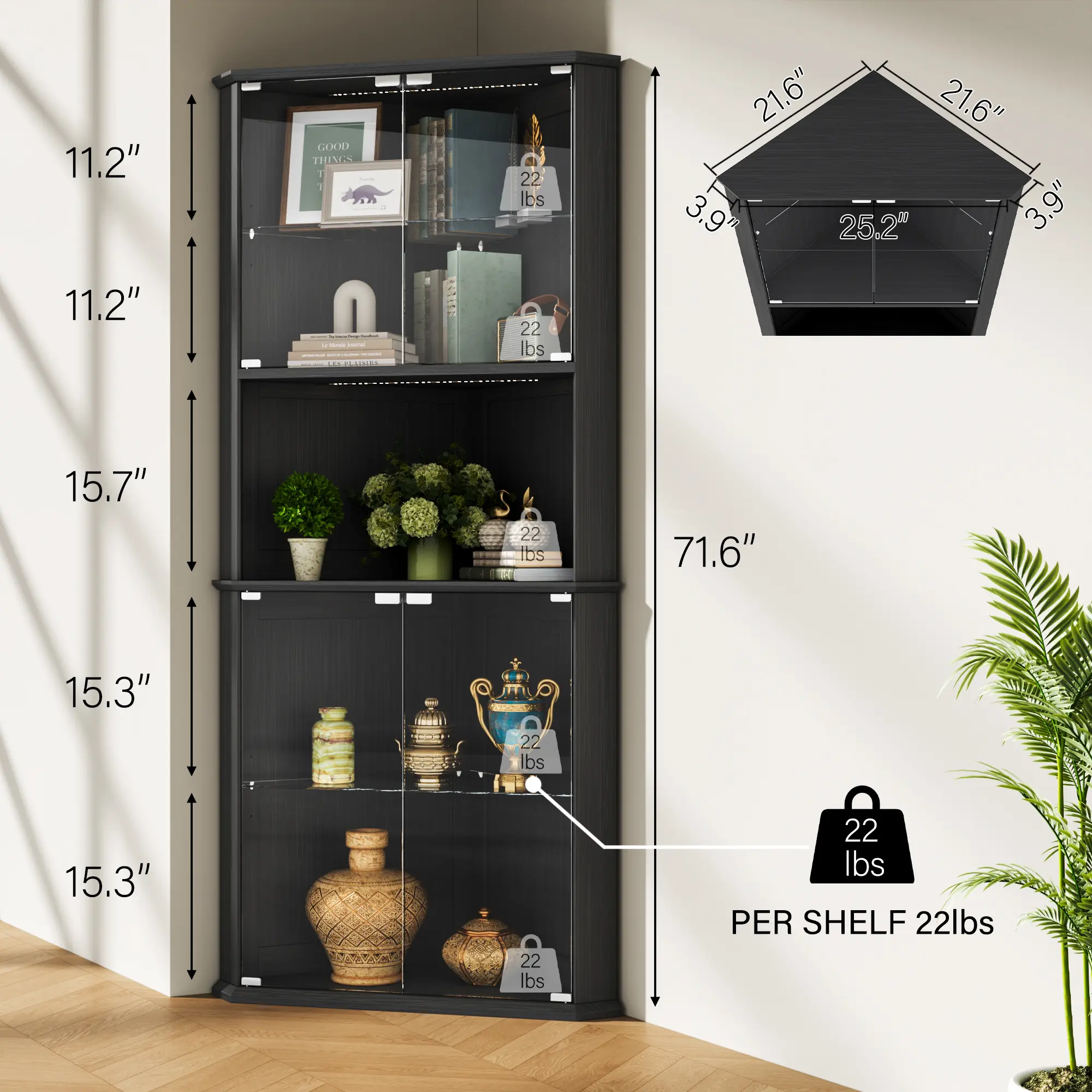 Transform empty corners into a functional showcase with this space-saving pentagonal display cabinet. Featuring 6 display shelvesβ2 adjustable tempered glass shelves and 4 fixed wooden shelves (each holding up to 22 lbs)βit offers versatile storage for collectibles, glassware, china, curios, and decorative items. Whether used as a curio cabinet or glass display case, this corner unit maximizes floor space while keeping your collections beautifully organized.