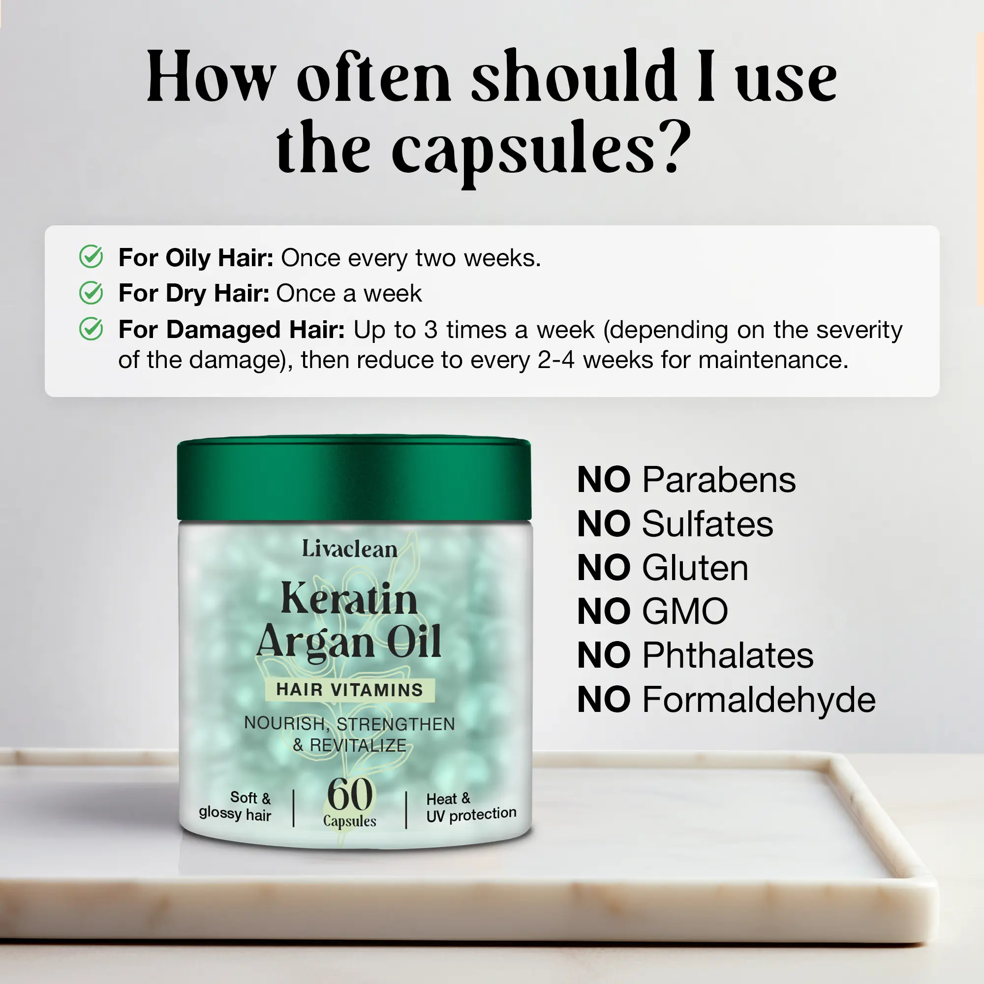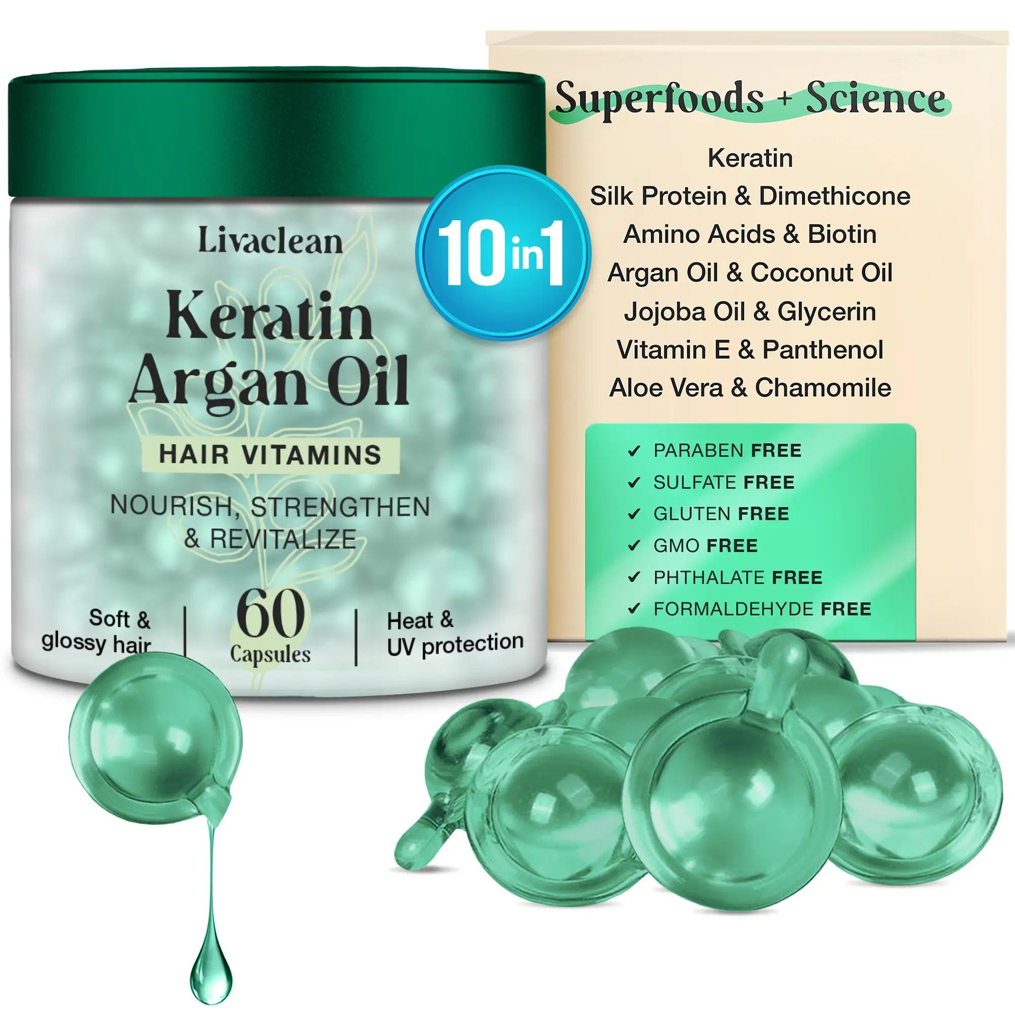 Livaclean's Keratin & Argan Oil Hair Vitamins are superfood-powered and designed to strengthen, nourish, and boost hair shine.