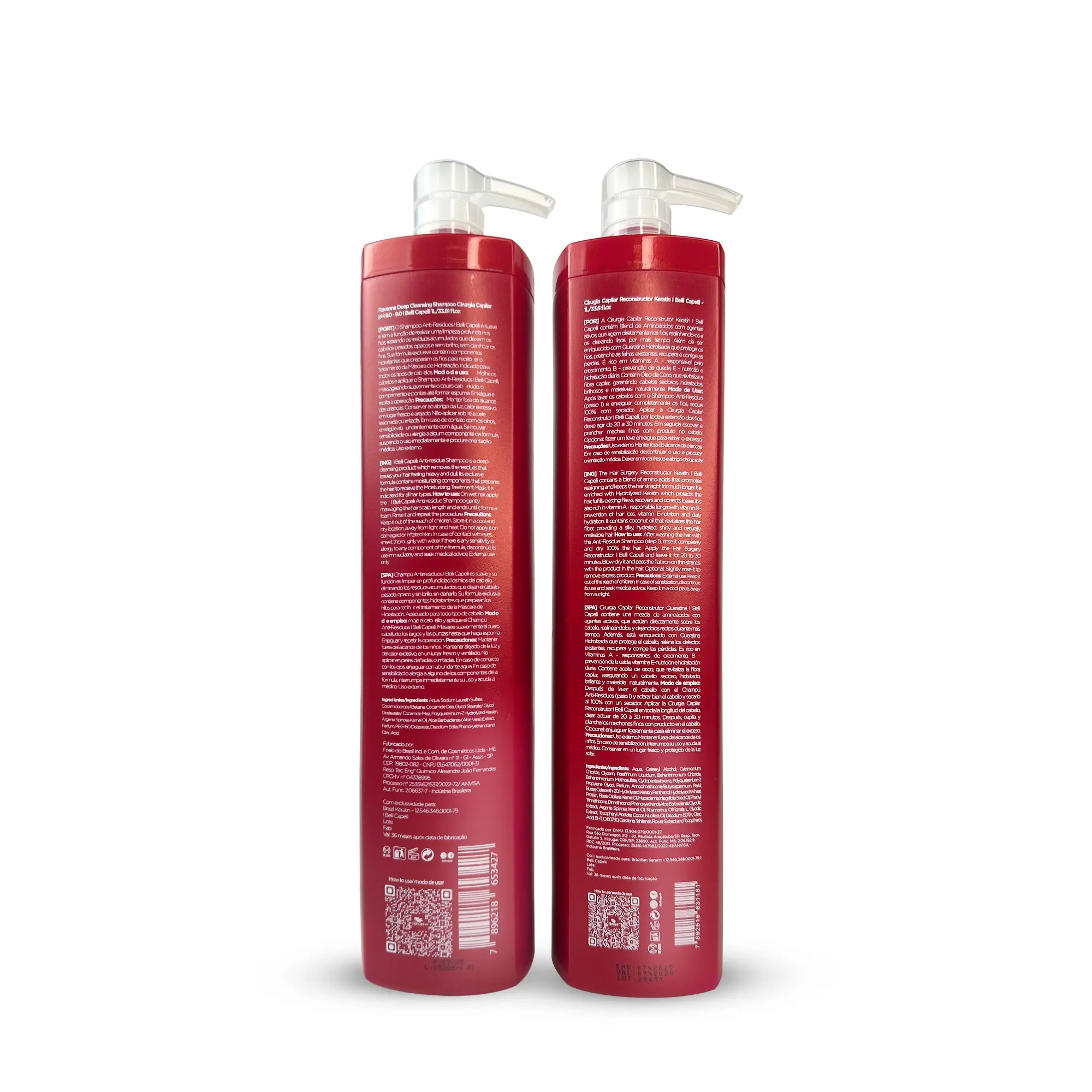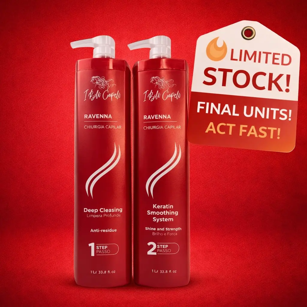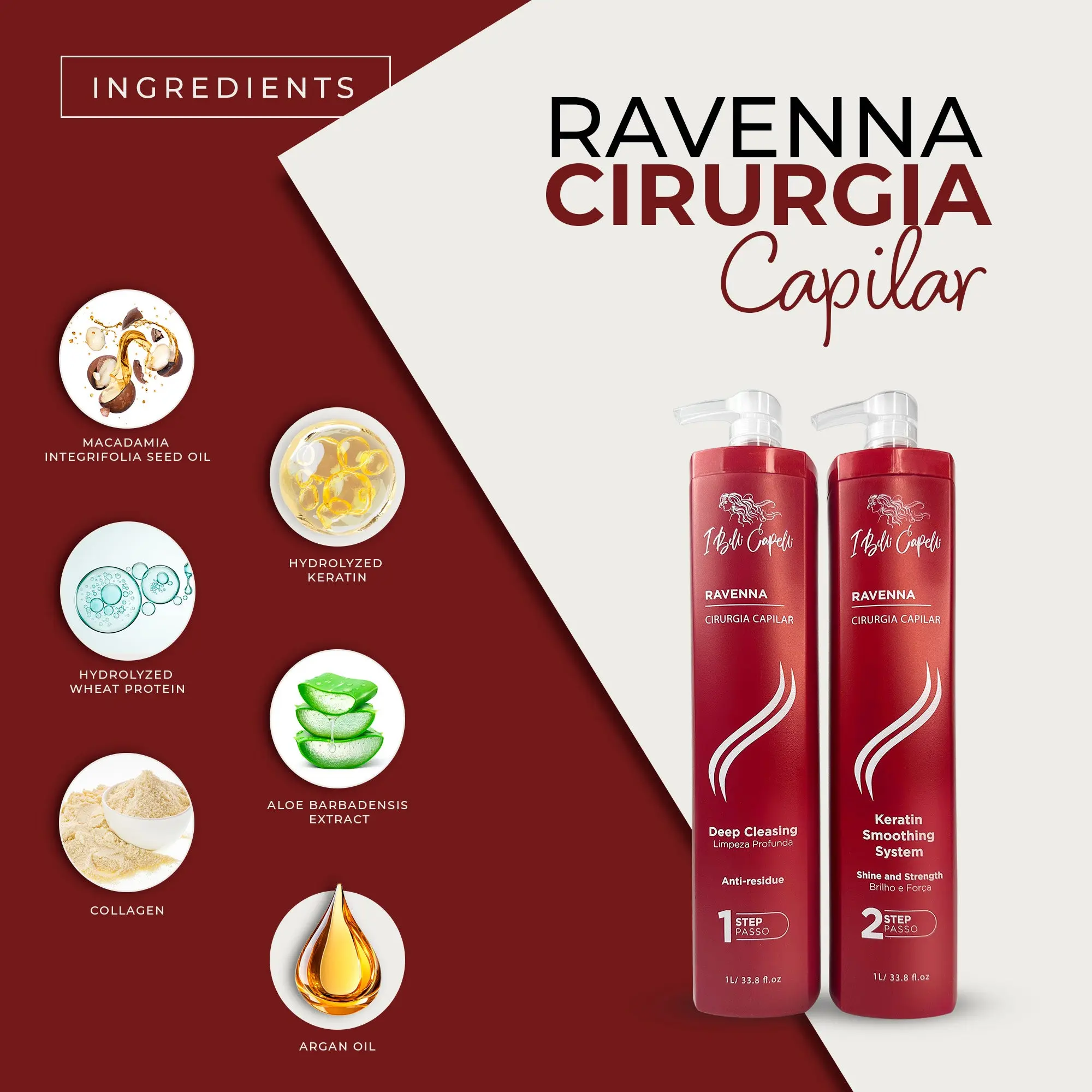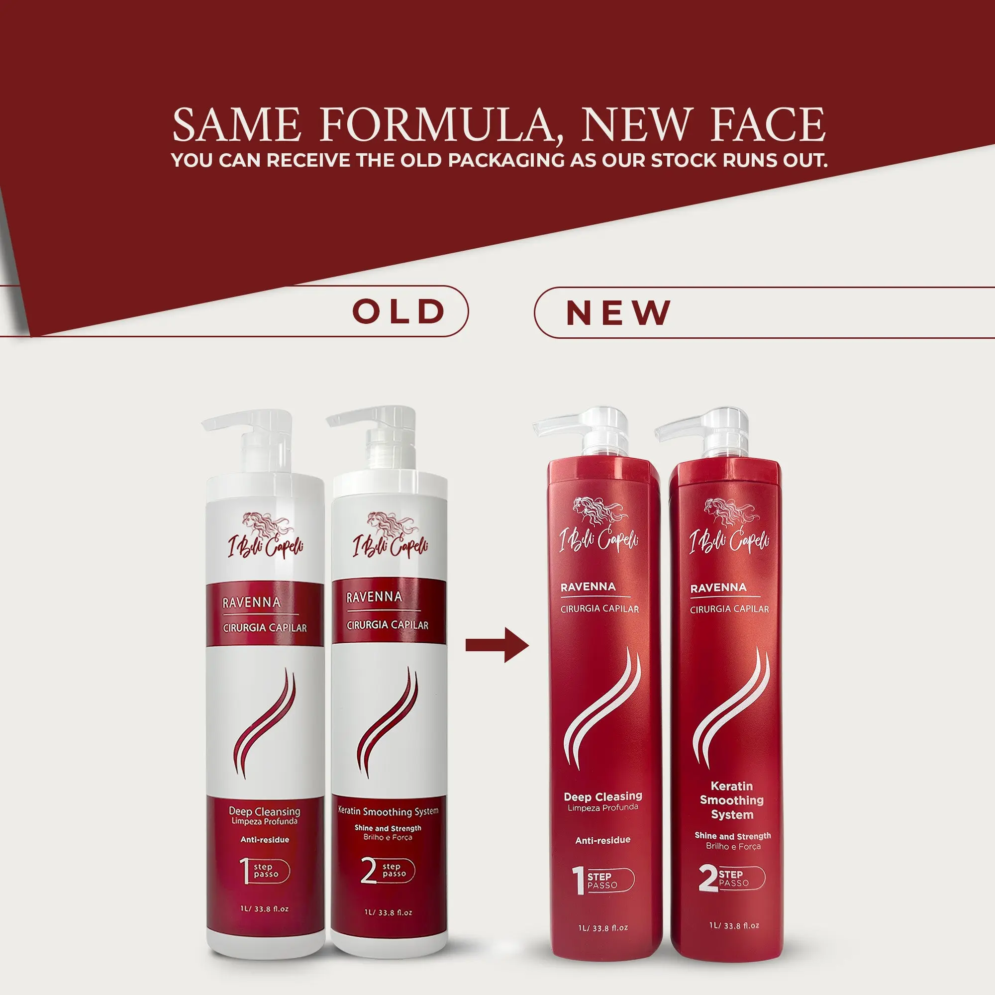 I Belli Capelli Ravenna Keratin Smoothing System is a 2x1L set. It includes Anti-Residue Shampoo (step 1) and Gloss Reconstructor (step 2). Both contain amino acid blends and vitamins A, B, E, D, F, wheat germ, honeycomb, and aloe vera. These ingredients realign hair, protect against damage, and provide deep hydration.