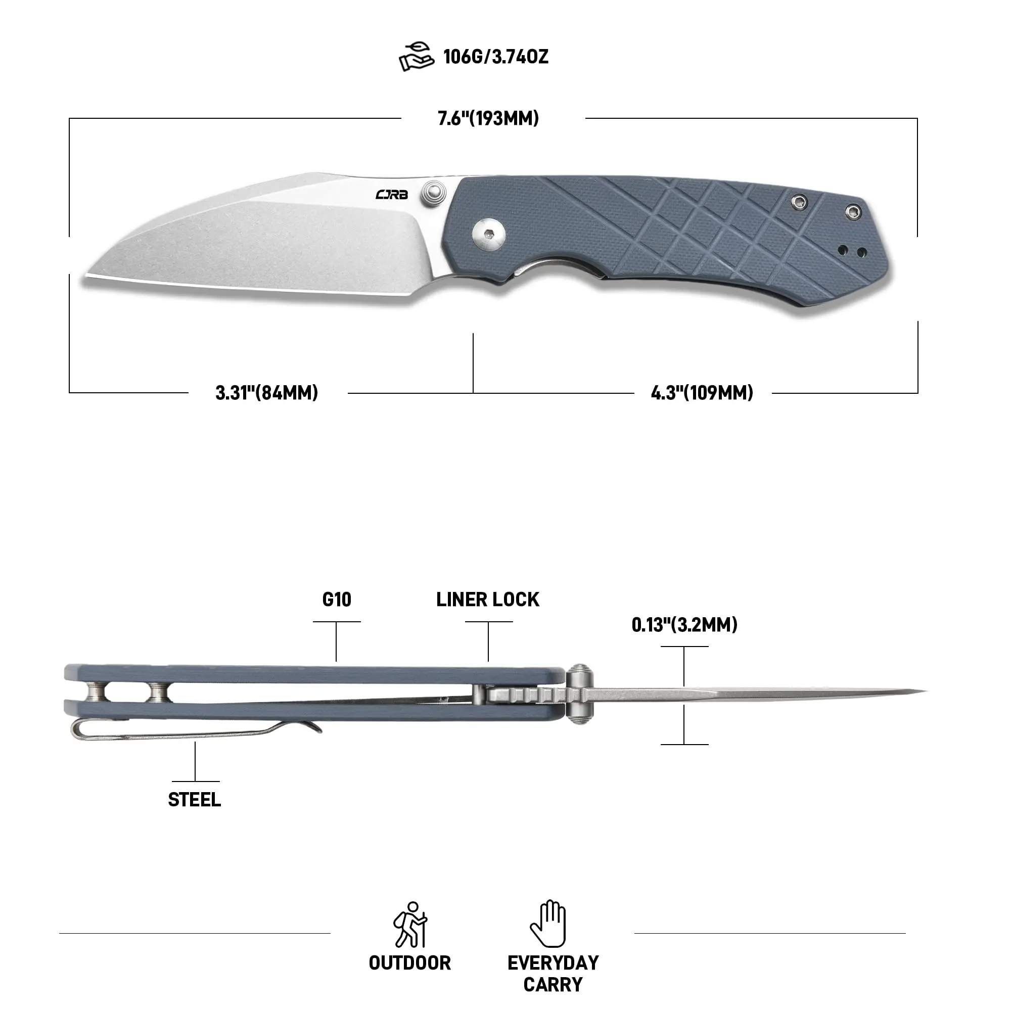 ·G10 Handle: The CJRB Kestrel pocket knife features a G10 handle that is heat resistant, waterproof, durable, and lightweight. With ergonomic design, we milled in some light texture that provides the perfect amount of grip