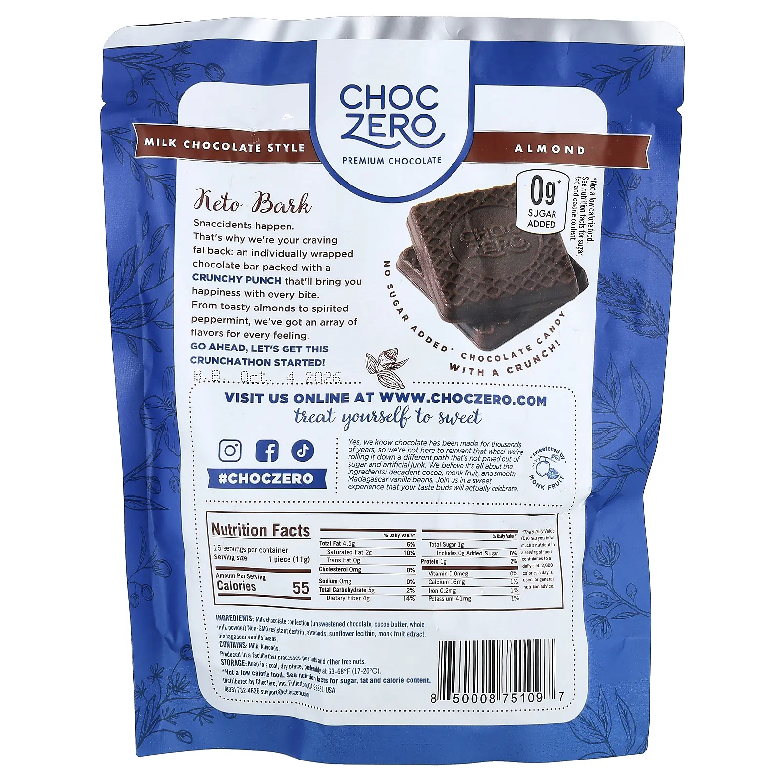 5. ChocZero Keto Bark, Milk Chocolate, Almond, 15 Mini Bars, 6 oz (170 g)