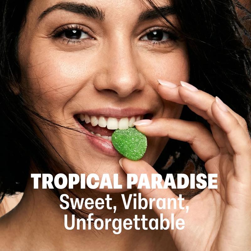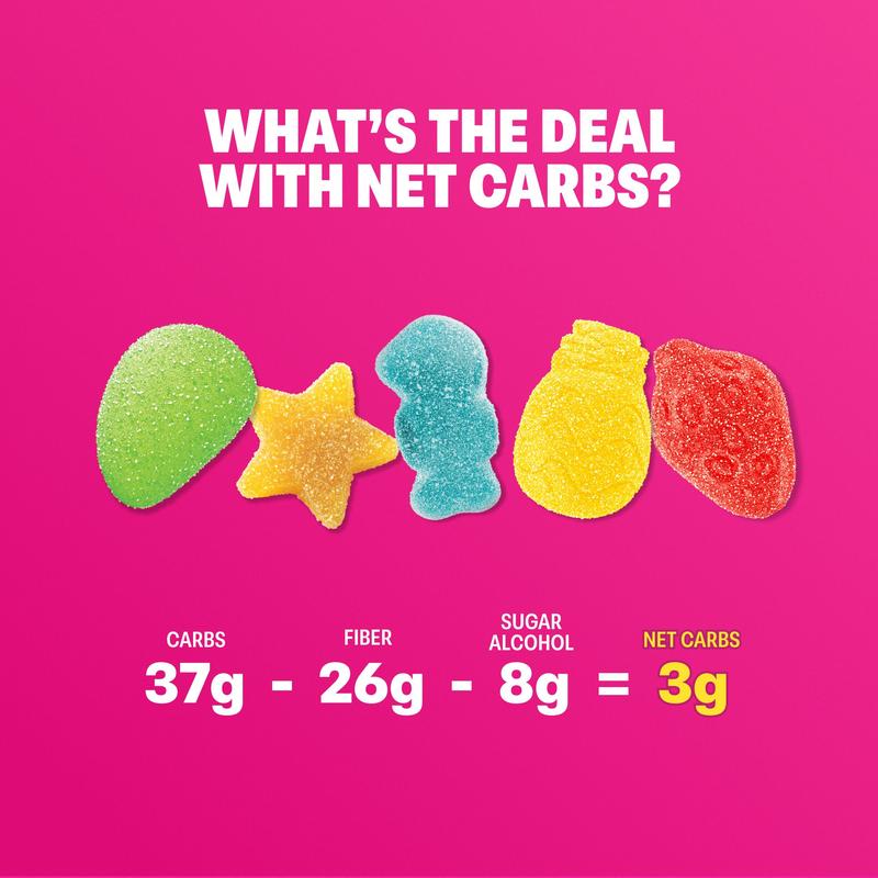 These gummies are tropical fruit flavored and I highly recommend these for every one to try. they have 3 g of sugar 70 cal three net carbs and 26 g of fiber
