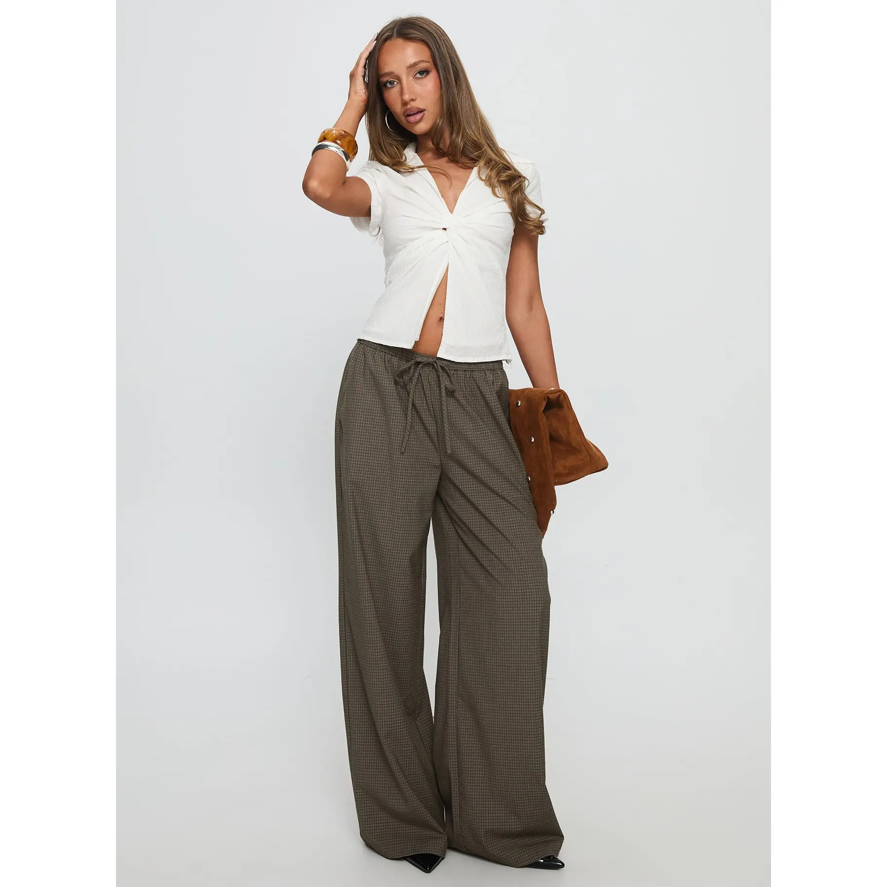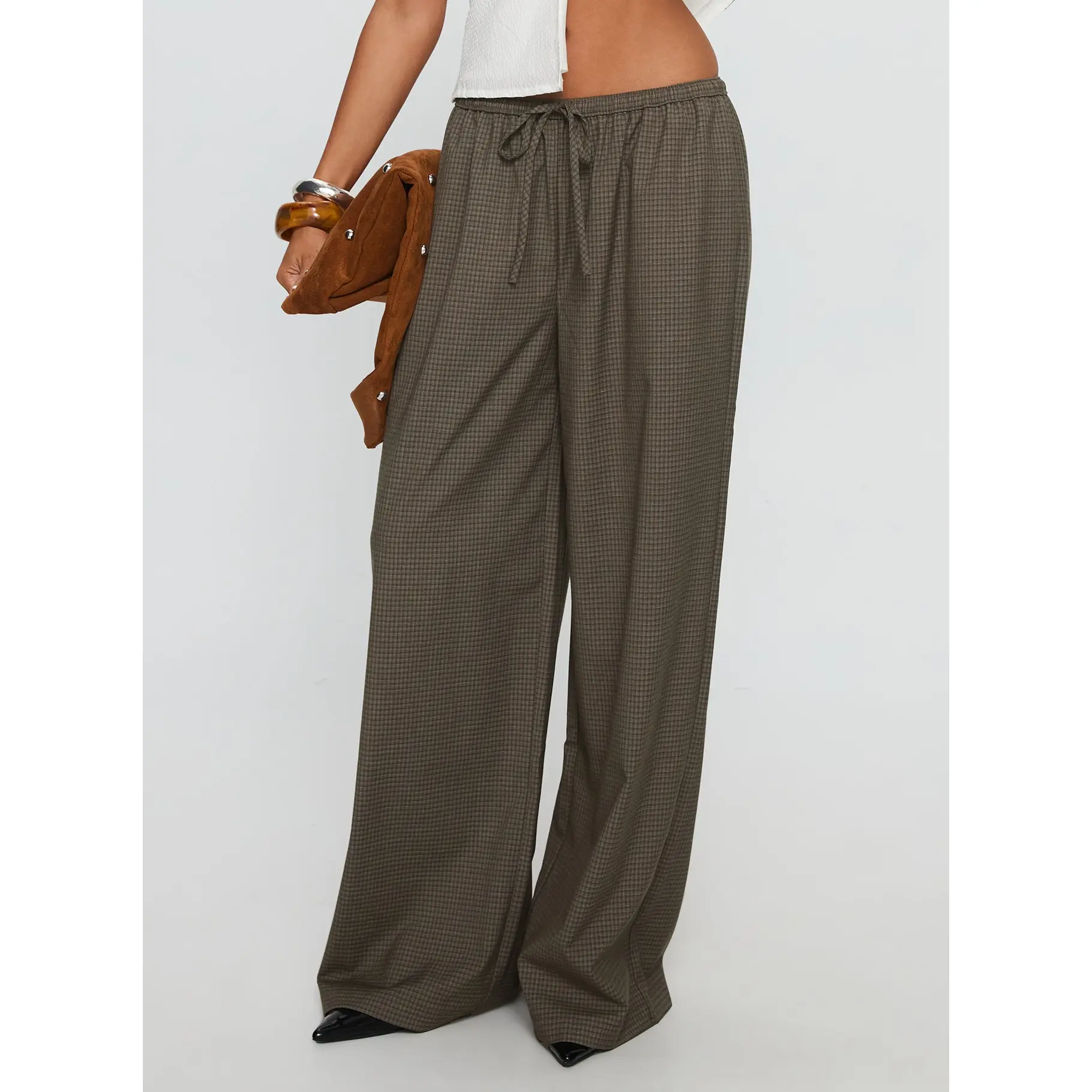 ·Tie-waist plaid wide-leg pants