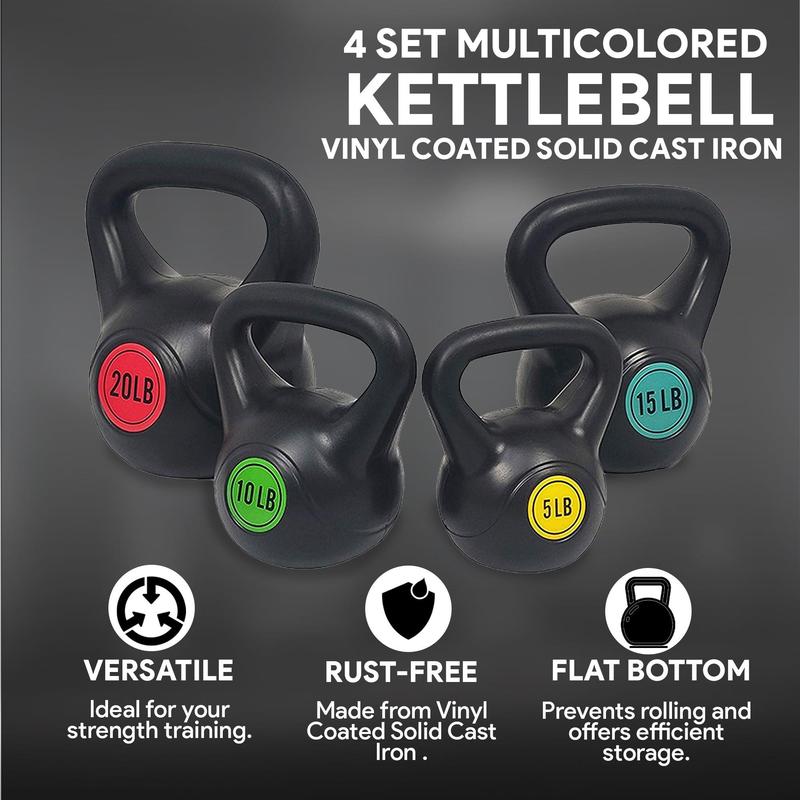 Transform your home workout with the BalanceFrom Fitness Kettlebell Set. This set includes 5-, 10-, 15-, and 20-pound kettlebells made from solid cast iron and coated in color-coded vinyl to protect your floor and equipment. The textured, non-slip handle fits most hands, while the flat bottom prevents rolling. Perfect for a variety of strength training exercises.