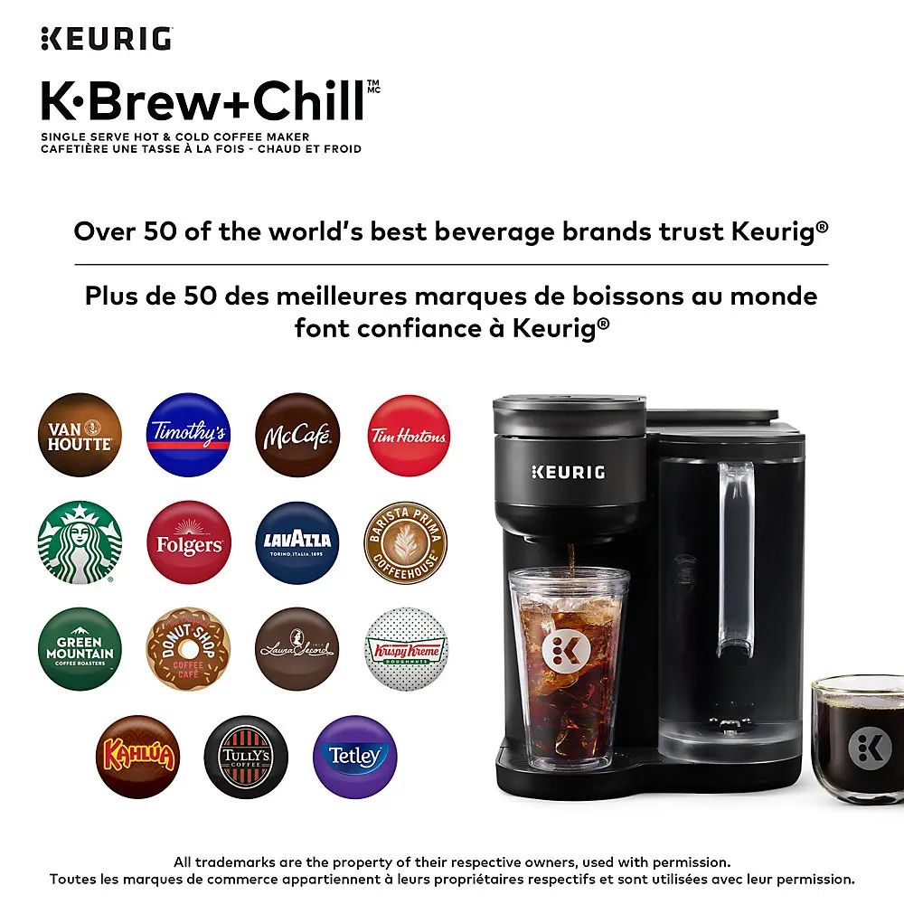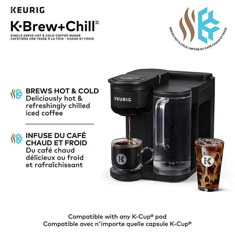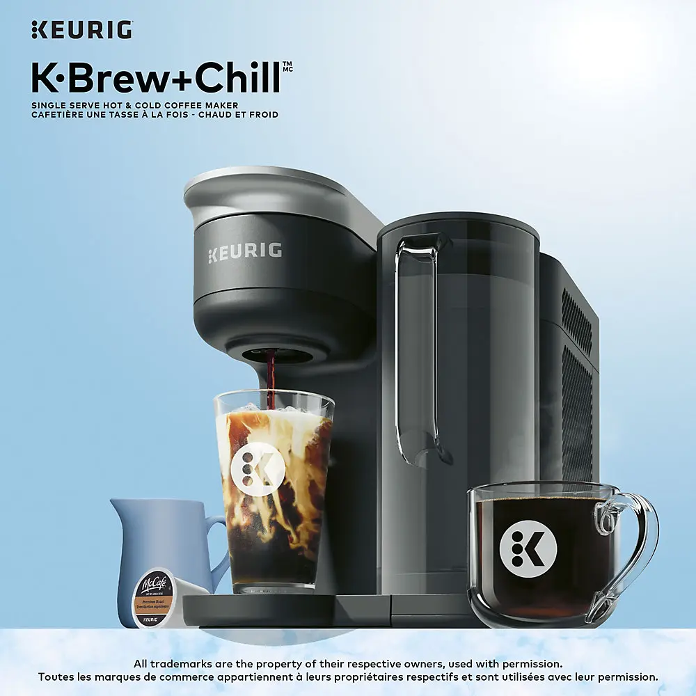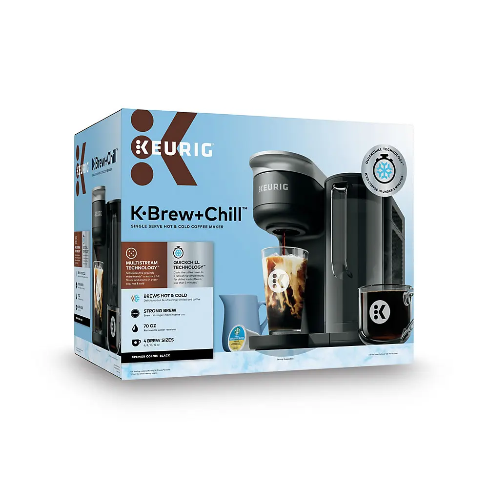 Meet the New K-Brew + Chill™ Coffee Maker The first coffee maker to make iced coffee just as cold as a coffee shop. This one’s a game changer. Introducing the first at-home coffee maker to make truly cold iced coffee (as cold as the coffee shop*): the Keurig® K-Brew+Chill™. Enjoy full-flavored, perfectly chilled iced beverages in just 3 minutes or less, as well as delicious hot coffee, using ANY of your favorite K-Cup® pods. The K•Brew+Chill™ brings together two of Keurig’s most advanced technologies: QuickChill Technology™, Keurig®’s latest brewing innovation, flash-chills your coffee after brewing, rapidly cooling it to a refreshing temperature so it comes out truly cold into your cup with minimal ice melt and robust, rich flavor … in 3 minutes or less. MultiStream Technology™, the breakthrough brewing technology that saturates the coffee grounds evenly to extract full flavor and aroma in every cup, hot or iced. The K-Brew+Chill™ also has a Strong Brew option allows you to make a more intense, bold-flavored cup for both hot and iced drinks. The brewer comes with an extra-large, removable 70oz water reservoir and brews in 6, 8, 10, and 12oz cup sizes, so you can enjoy many cups between refills. Finally, an at-home coffee maker that makes iced coffee as cold as the coffee shop, for the delicious flavor and cool refreshment that iced coffee lovers have been looking for. *Based on two consecutive 10oz brews. FEATURES QUICKCHILL TECHNOLOGY™: Flash-chills coffee for less ice melt to deliver full-flavored, fresh iced coffee as cold as the coffee shop* in 3 minutes or less. MULTISTREAM TECHNOLOGY™: Saturates the grounds evenly to extract full flavor and aroma in every cup, hot or cold. WORKS WITH ANY K-CUP® POD: Brew both hot and iced beverages using ANY K-Cup® pod — no need to use iced coffee pods. STRONG BREW: Brews a stronger, more intense-flavored cup for both hot and iced drinks. 70OZ REMOVABLE RESERVOIR: Extra-large reservoir with handle is easy to remove and refill for faster, more convenient brewing. FOUR BREW SIZES: Brews 6, 8, 10, and 12oz cups in both hot and iced. SPECS: • 12.16” Height • 17.71” Height (when open) • 15.35” Depth • 9.8” Width